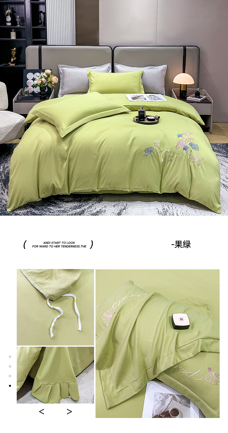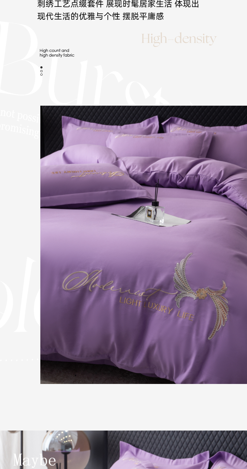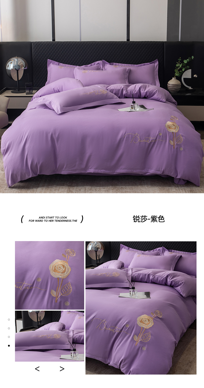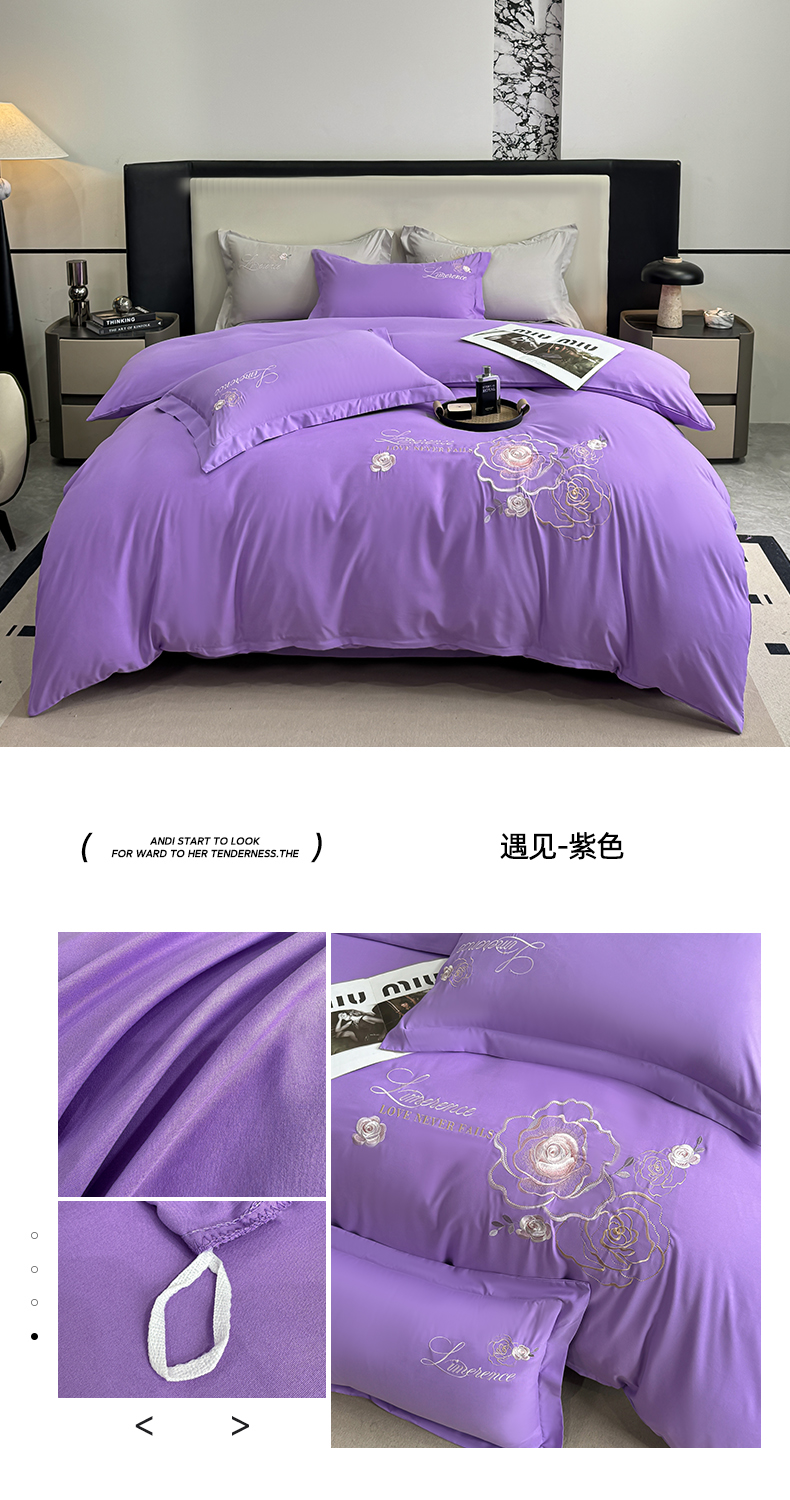 商品名称:悦织湾家纺 90克磨毛刺绣纯色四件套2025新款轻奢韩版公主风精致床上用品绣花亲肤水洗棉4件套 宽境-紫色