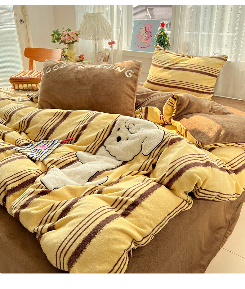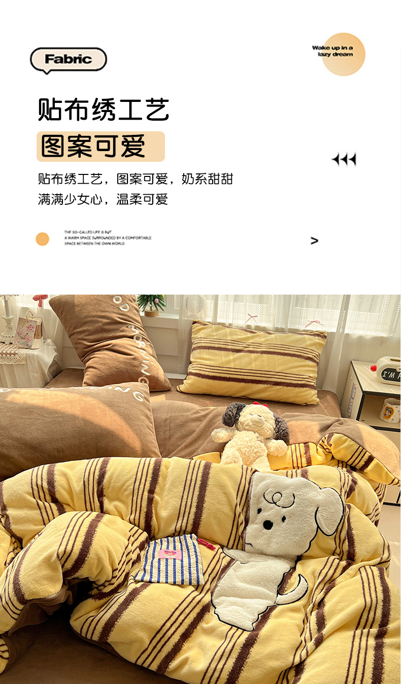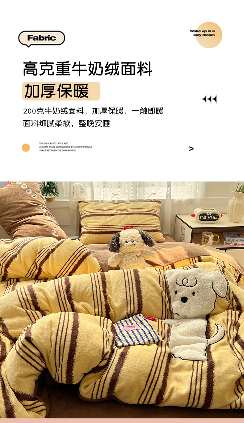 当前位置: 91家纺网 > 商品网购 > 床品套件 > 四件套 > 牛奶绒四件套 > 忆生活 2025新款秋冬高克重牛奶绒贴布绣四件套 条纹狗狗-黄