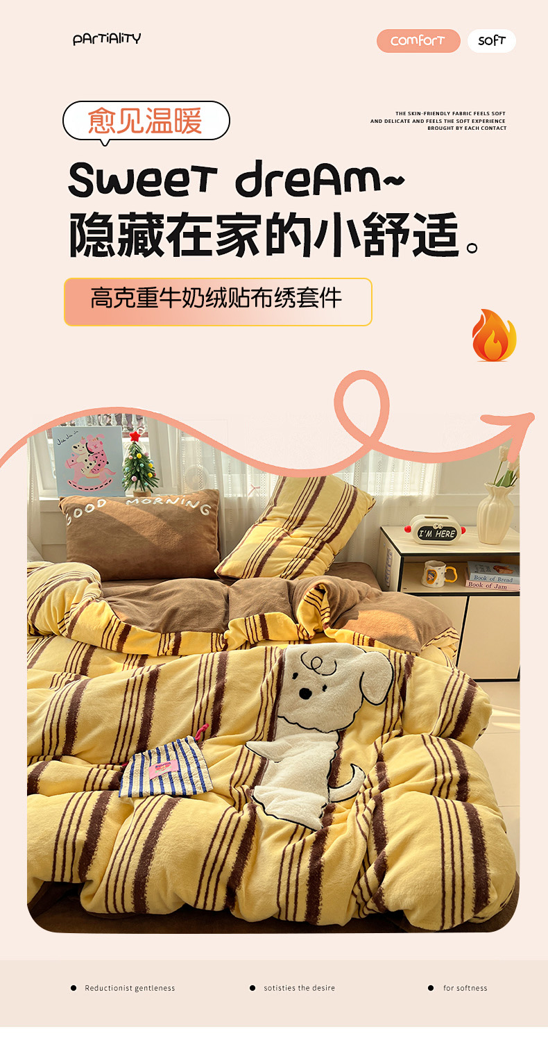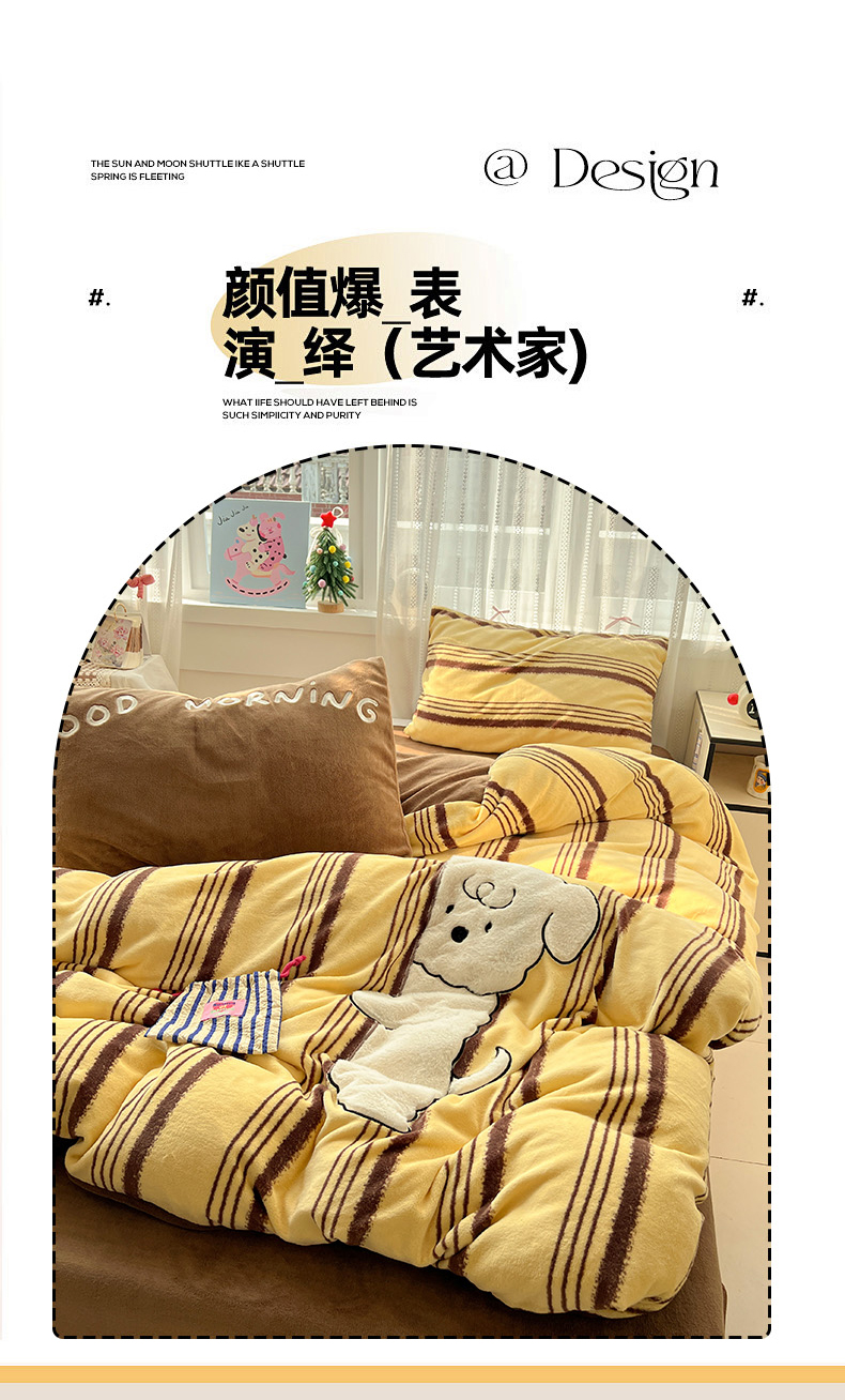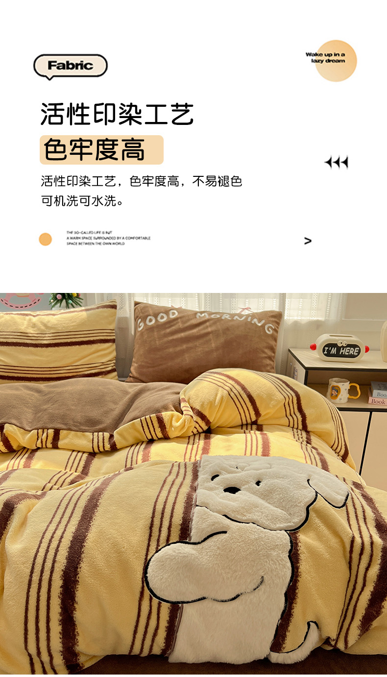 当前位置: 91家纺网 > 商品网购 > 床品套件 > 四件套 > 牛奶绒四件套 > 忆生活 2025新款秋冬高克重牛奶绒贴布绣四件套 条纹狗狗-黄