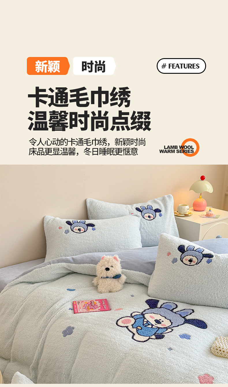 当前位置: 91家纺网 > 商品网购 > 床品套件 > 四件套 > 其它四件套 > 典曼家纺 2025新款A类羊羔绒刺绣四件套系列 兔耳先生
