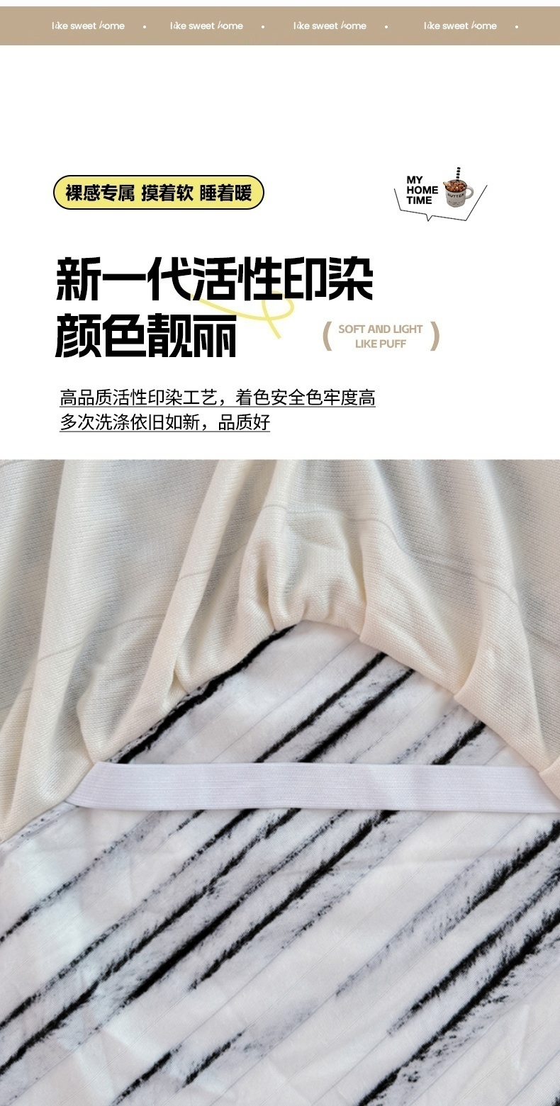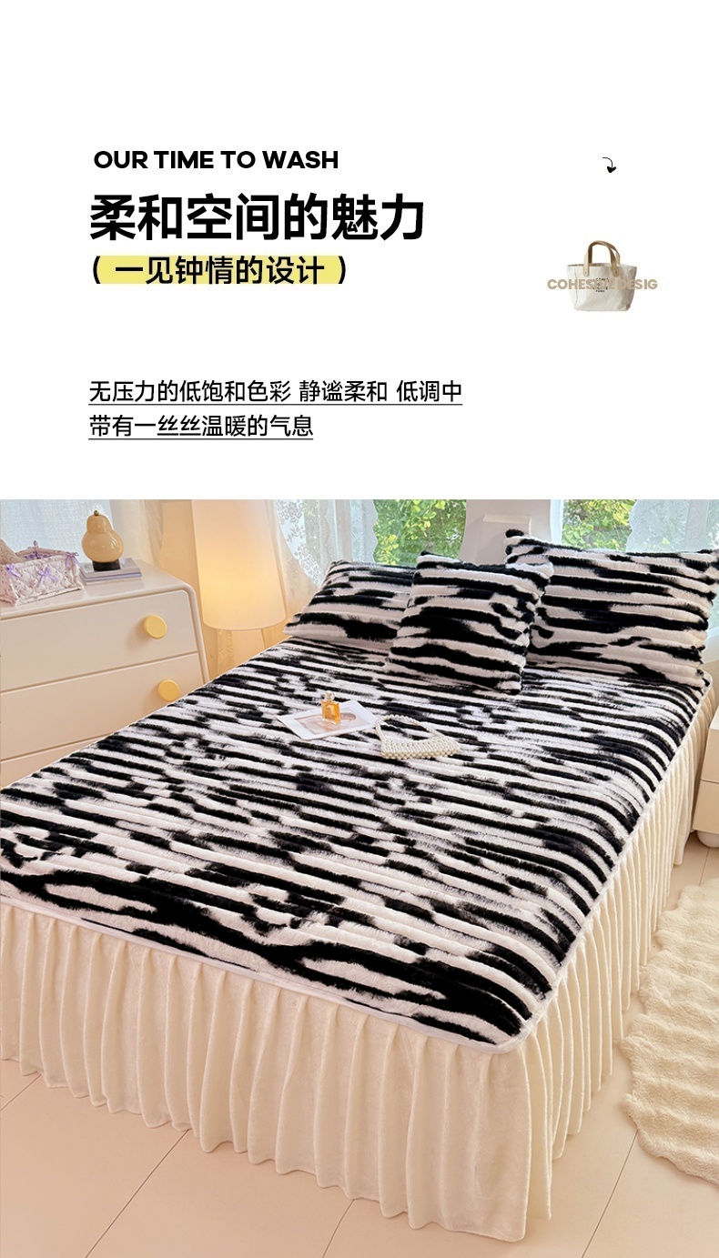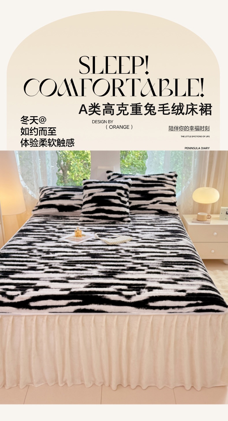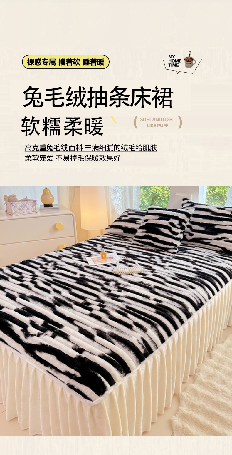 梦舒羽 2025新款兔毛绒床裙法兰绒床垫保护罩牛奶绒床垫法莱绒床单罩-抽条 兔毛绒抽条-梦幻墨白