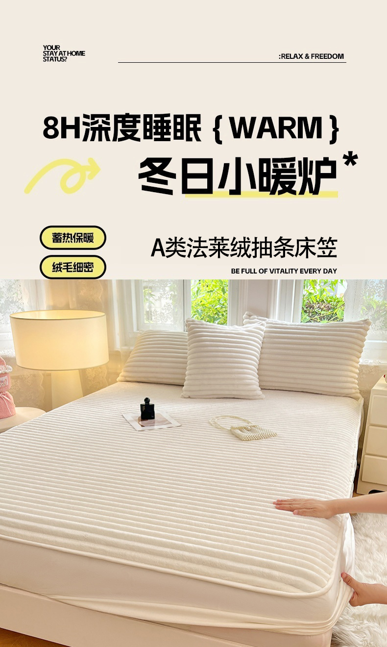 • 91家纺网 家纺一手货源 找家纺 圣比熊 2025新款法莱绒床笠法兰绒床垫保护套牛奶绒兔毛绒席梦思床垫套-抽条 法莱绒抽条-晨曦白