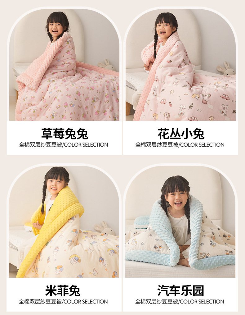 (总)嗨生活 2025新款全棉双层纱豆豆被 儿童被 春秋被 冬被 幼儿园被子,草莓兔兔,花丛小兔,米菲兔,汽车乐园,挖机恐龙,玩具屋,小海豚,熊猫盼盼