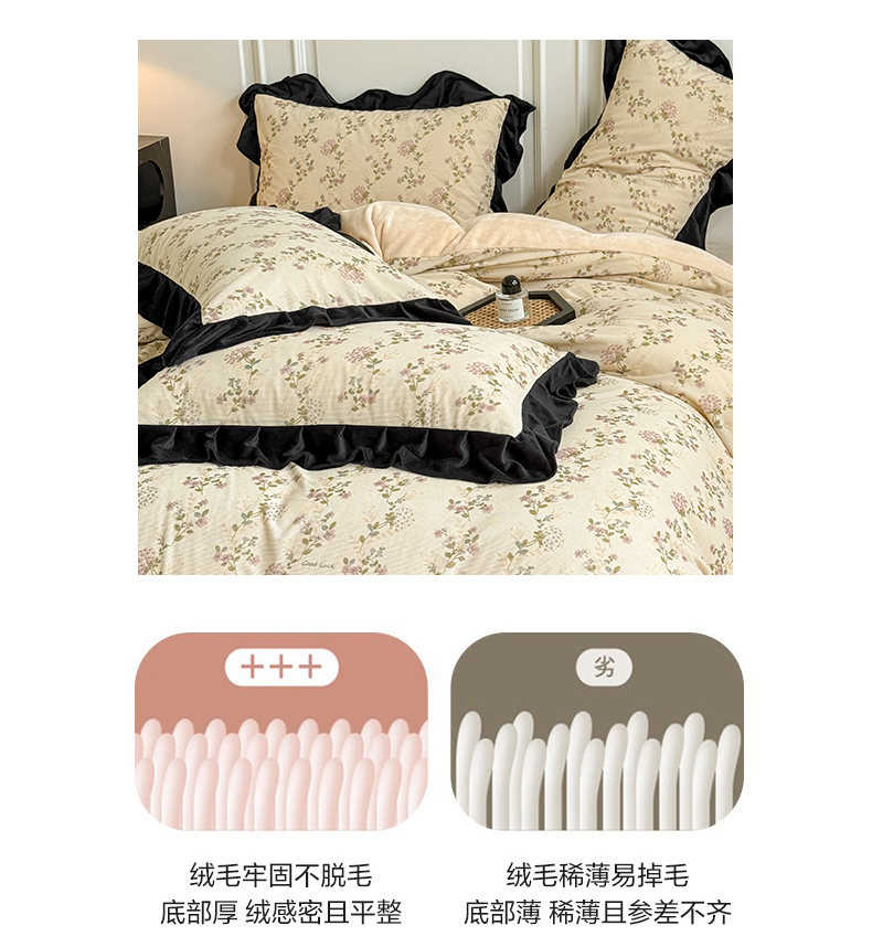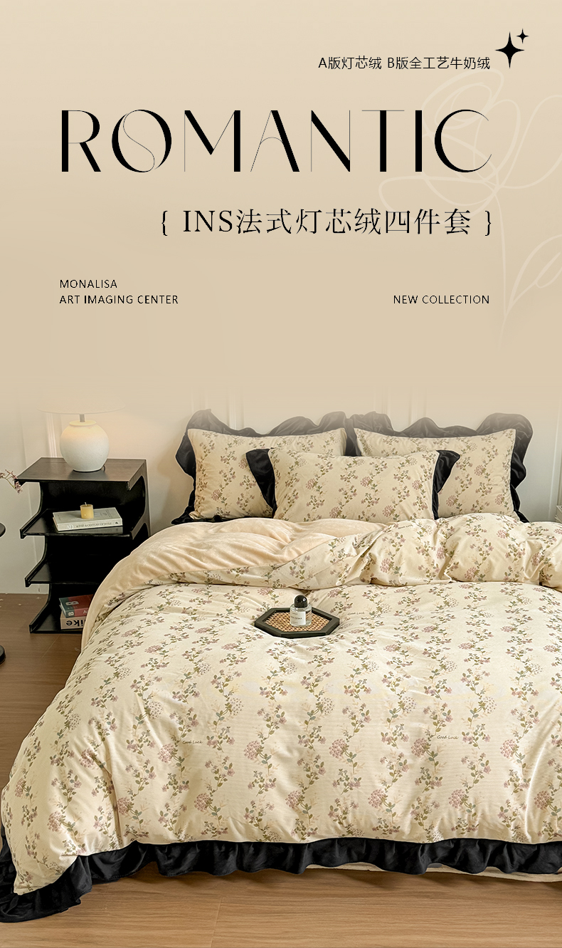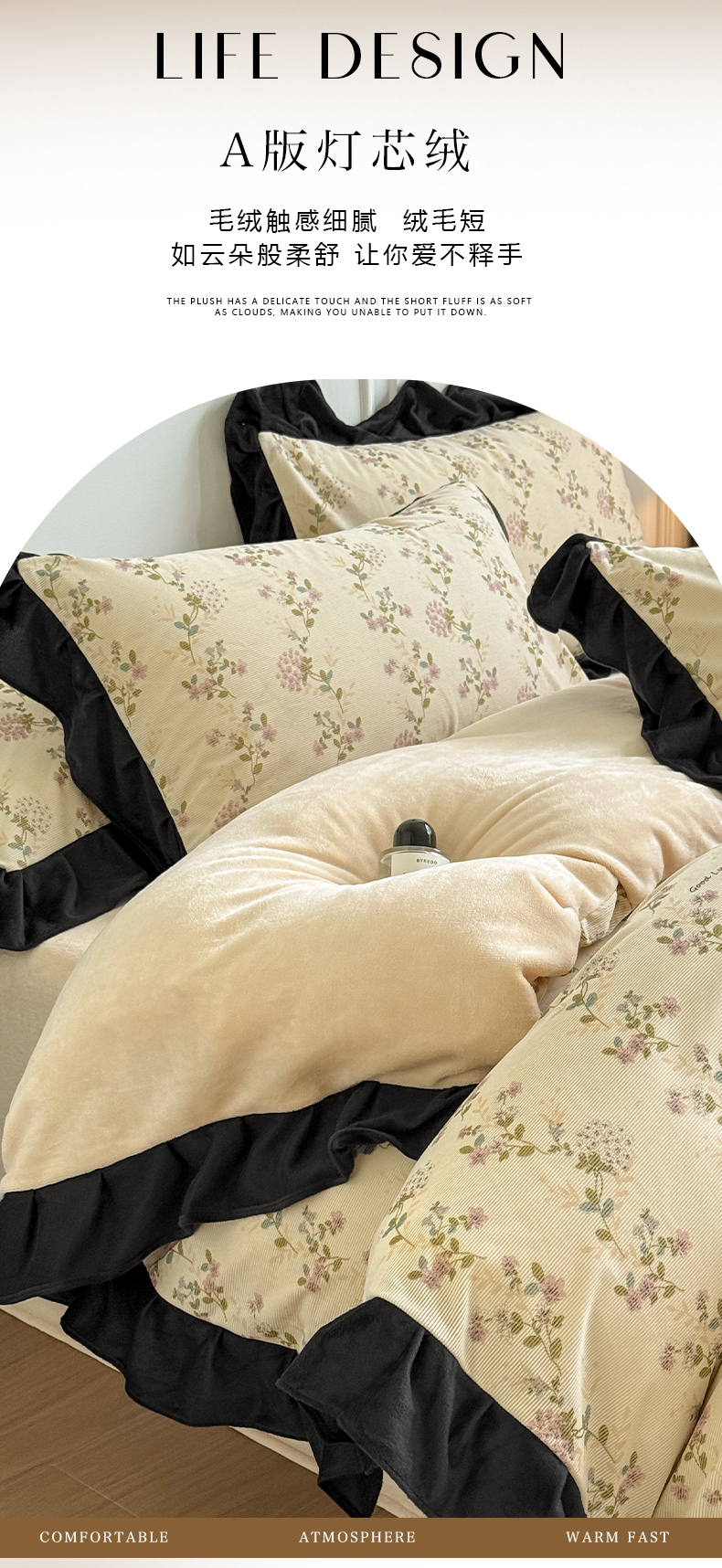 当前位置: 91家纺网 > 商品网购 > 床品套件 > 四件套 > 牛奶绒四件套 > 宅家居 2025新款秋冬爆款轻法式赫本风灯芯绒四件套提花立体韩版花边牛奶绒三件套 紫藤