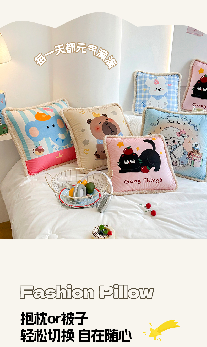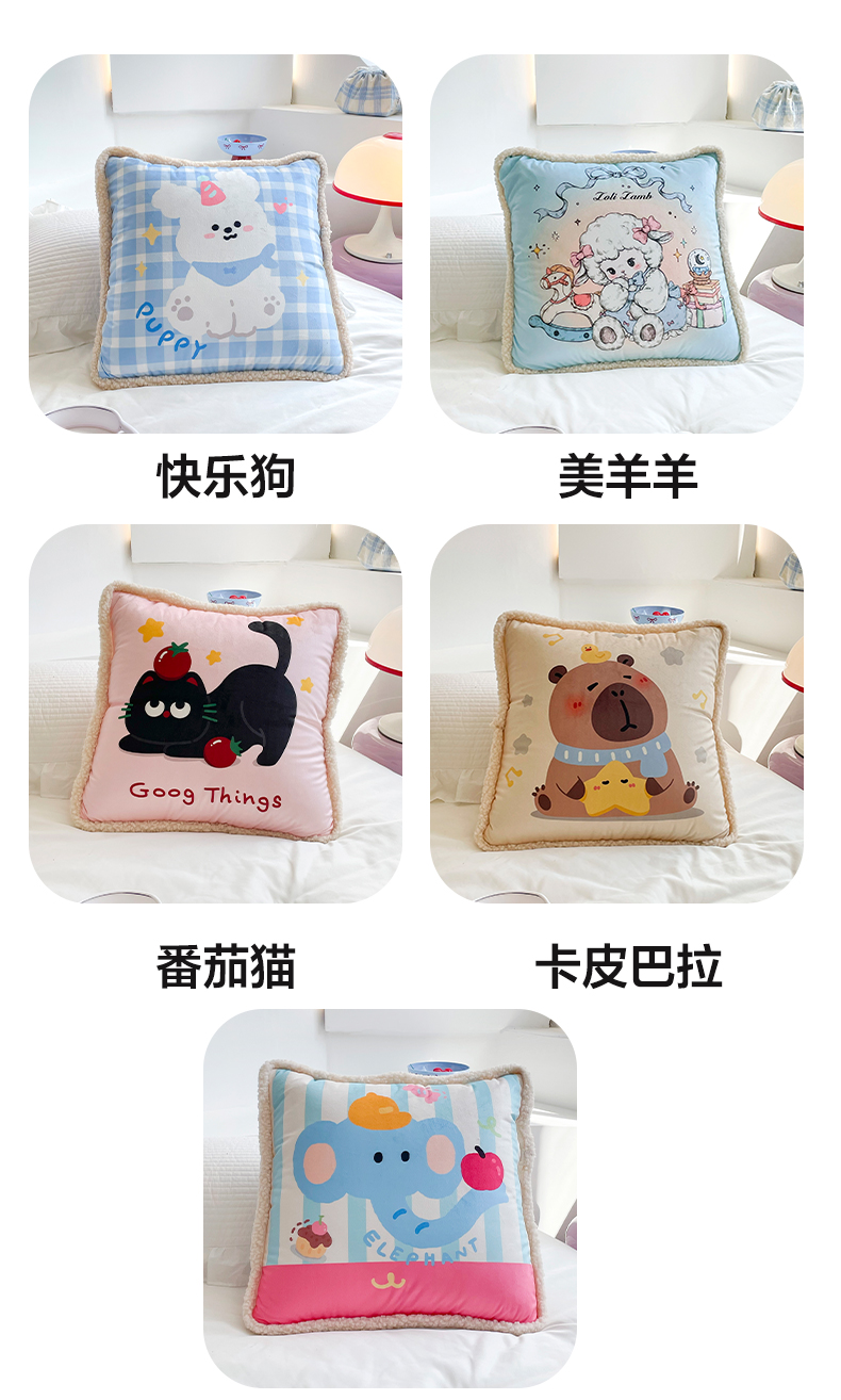 (总)番茄+ 2025新款羊羔毛花边绒抱枕被,美羊羊,番茄猫,卡皮巴拉,快乐狗,苹果象,组合图