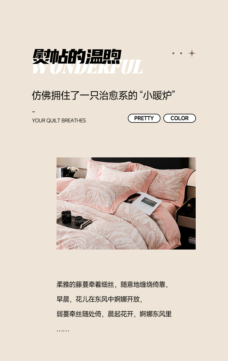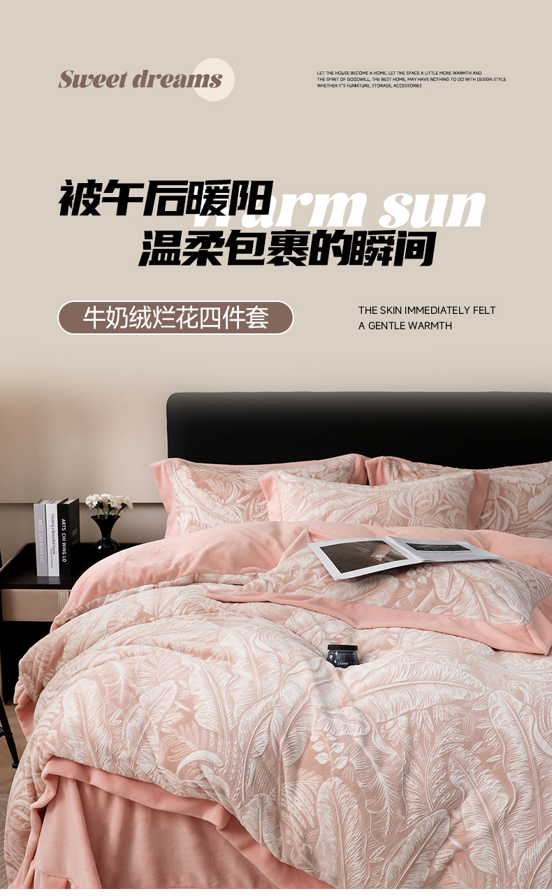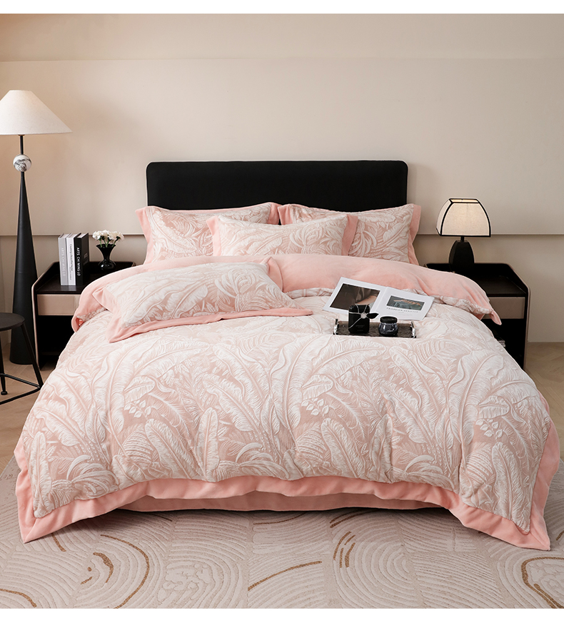 商品名称:三悦四季 2025新款冬季雕花牛奶绒加厚保暖四件套复古风轻奢烂花床单被套床上用品 一叶倾城-粉