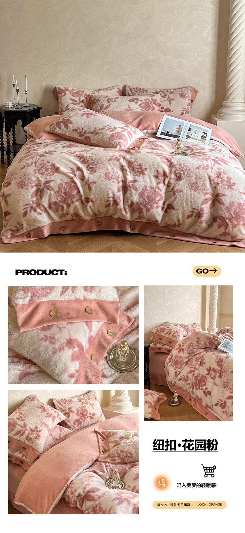商品名称:晚爱家居 2025新款纽扣款兔毛绒美拉德轻奢风高克重皮草兔绒四件套系列 纽扣-花园粉