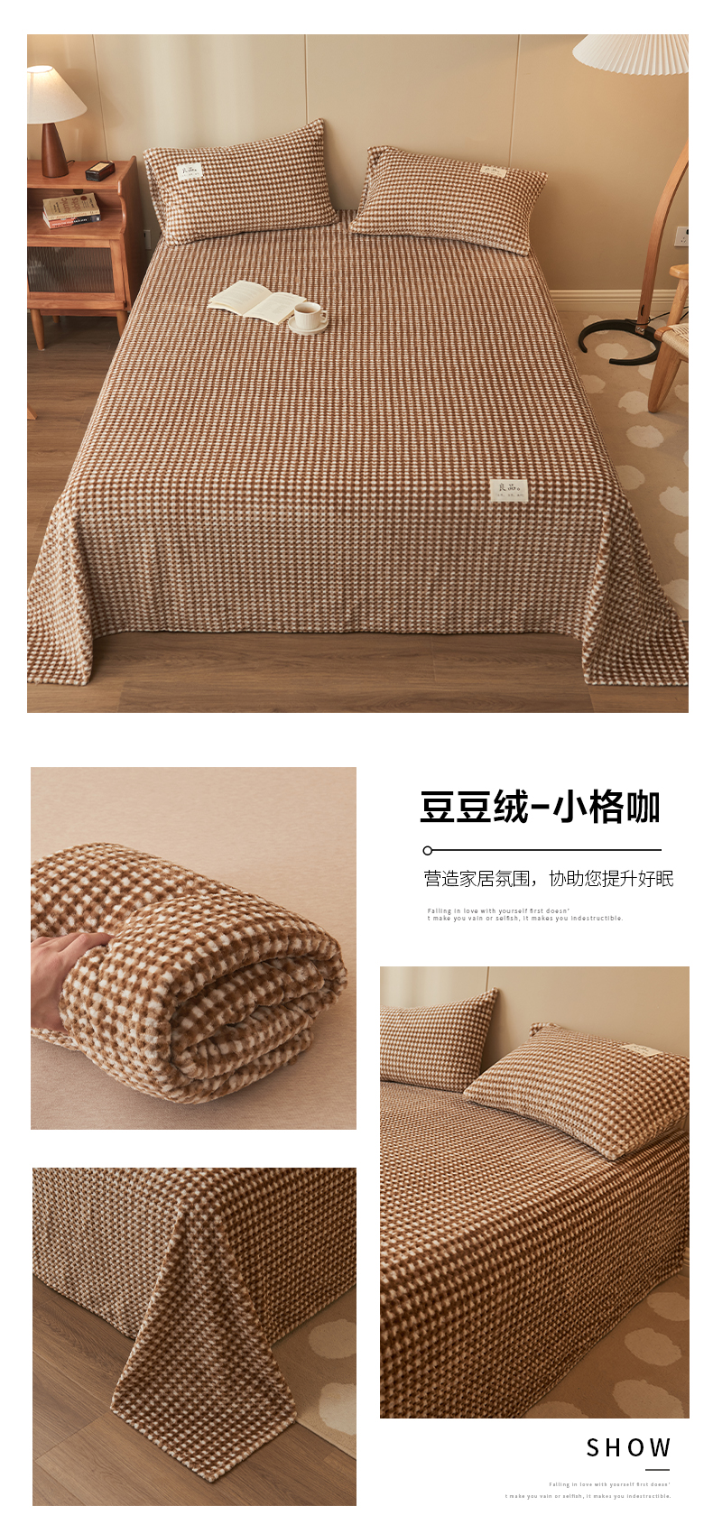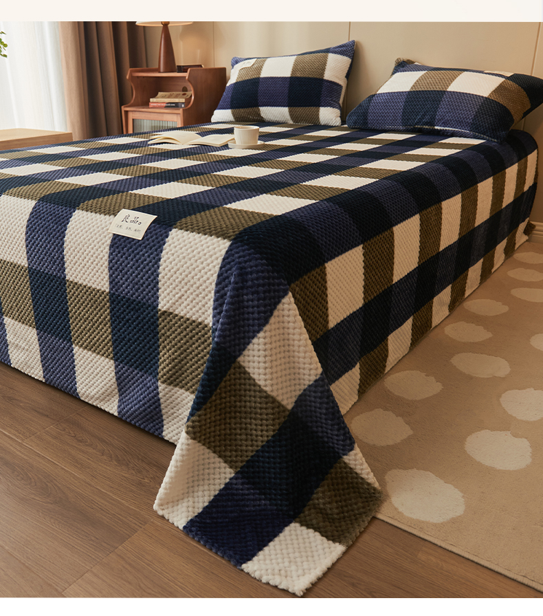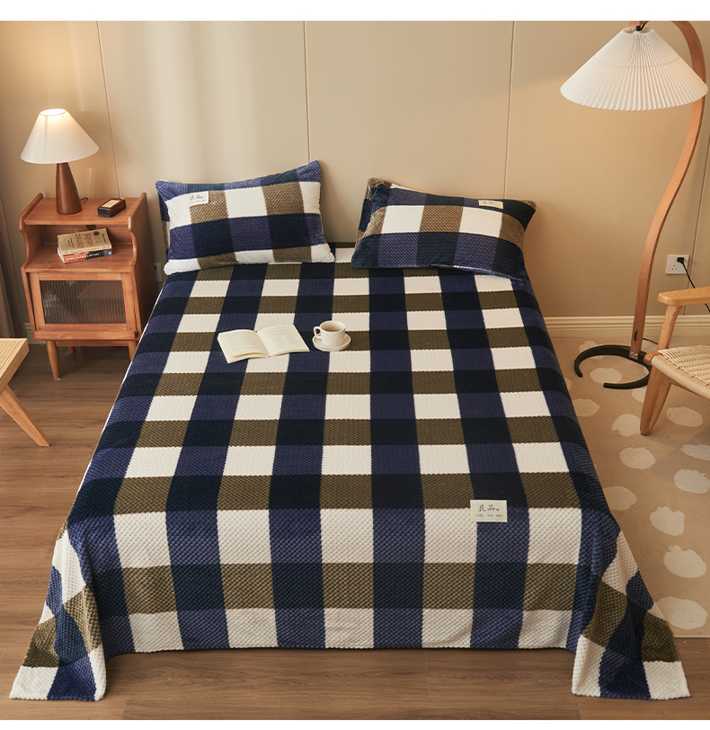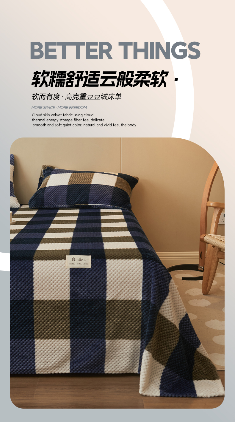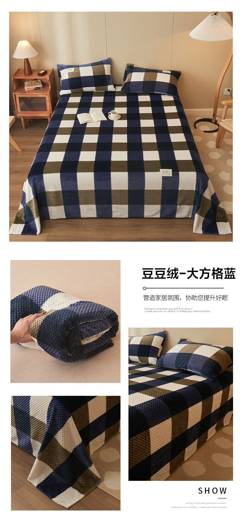 商品名称:早晨家纺 2025新款豆豆款高克重牛奶绒菠萝格无印风床单 豆豆绒-大方格蓝