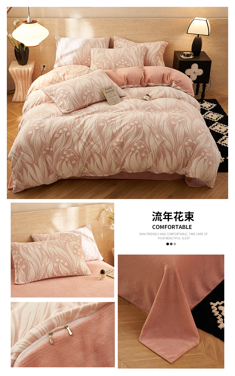 (总)金鹰 2025新款A类雕花牛奶绒烂花兔毛包边四件套,羽毛,波澜壮阔,繁花,蝴蝶梦,简爱,兰花,玫瑰物语,梦幻森林,清晨玫瑰,羽叶,仲夏晨歌