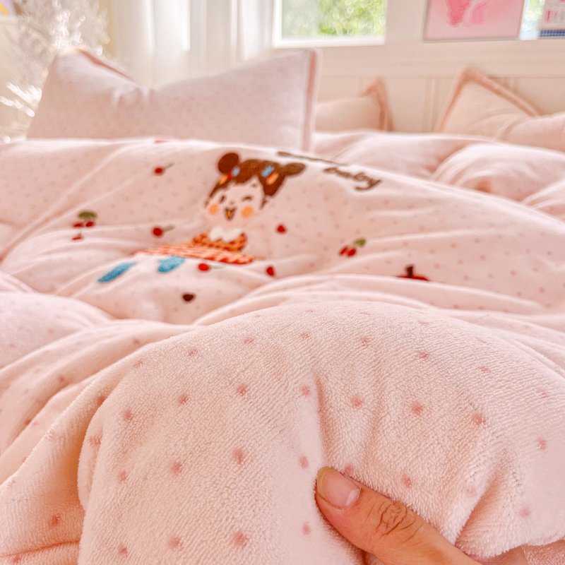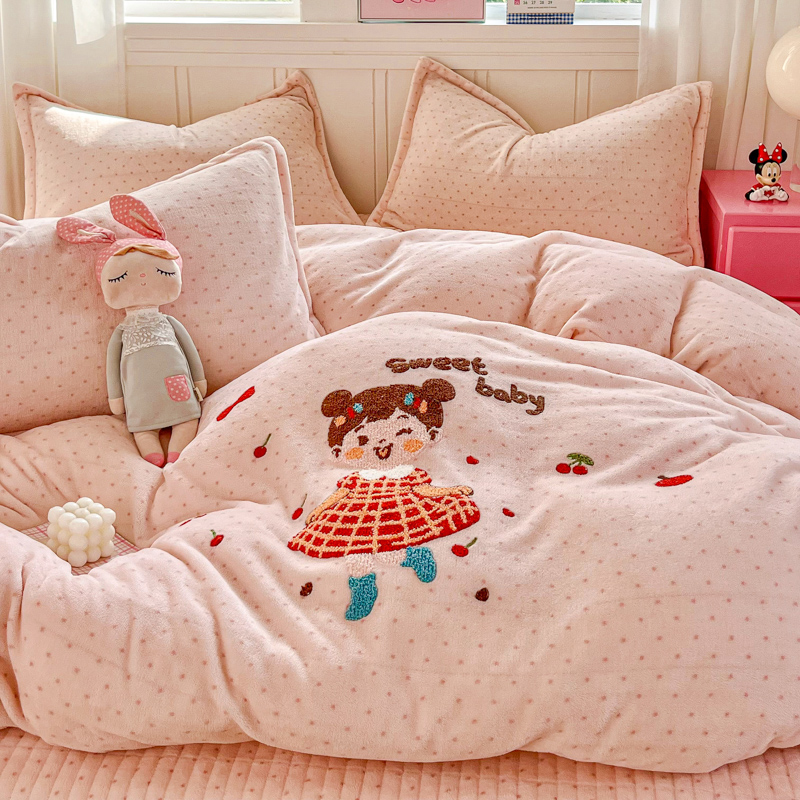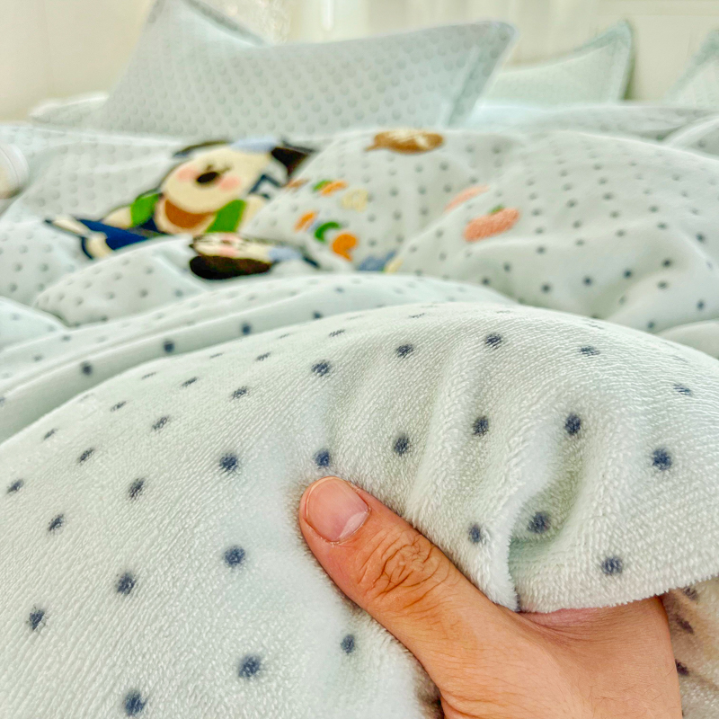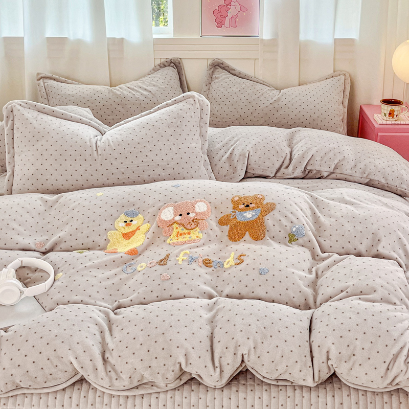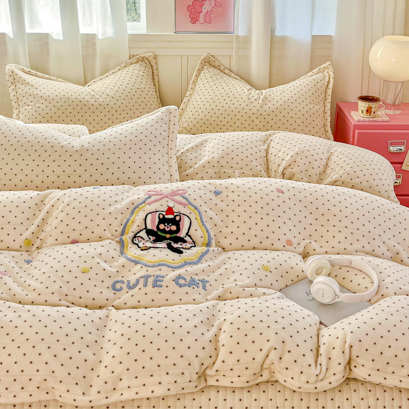 商品名称:尚美 2025新款波点系列印加绣牛奶绒床盖四件套 奶汪球球
