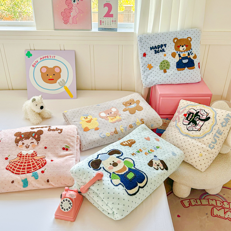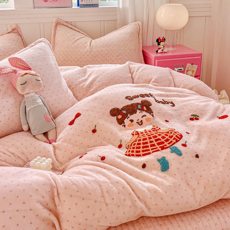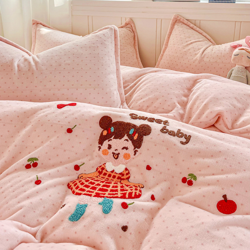 (总)尚美 2025新款毛巾绣牛奶绒床盖加棉加厚四件套,爆莓兔,背带熊猫,蛋糕猫,黑皮猫,恐龙,女孩,小粉象