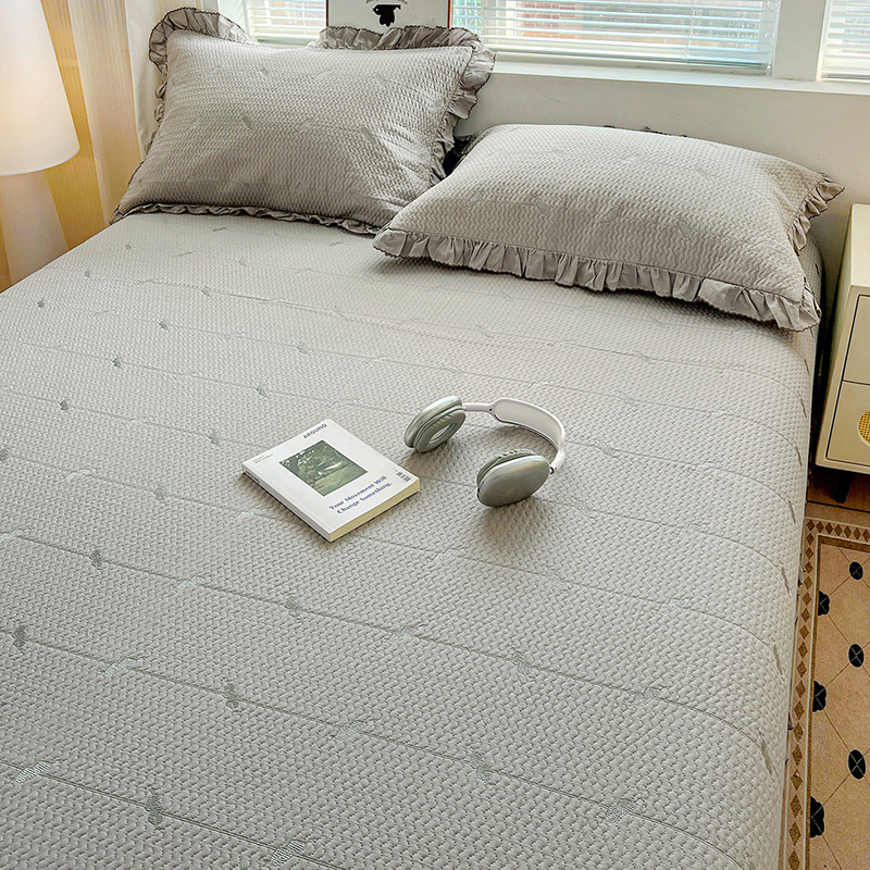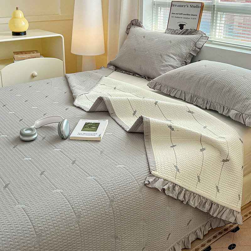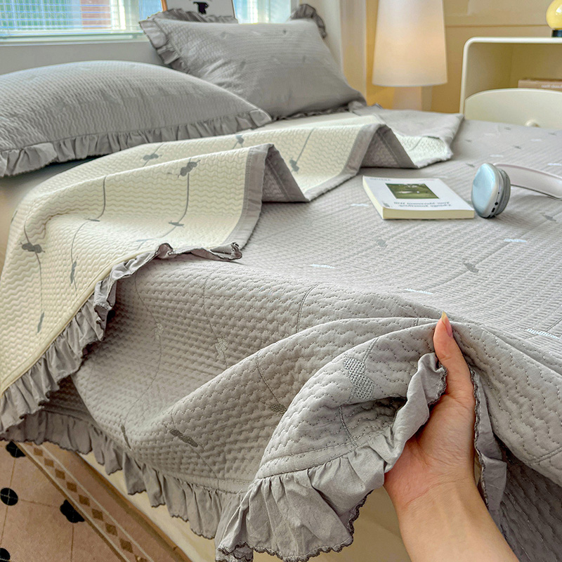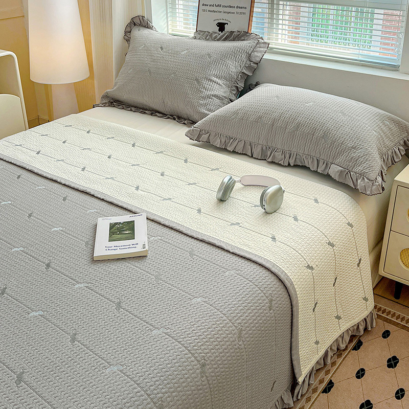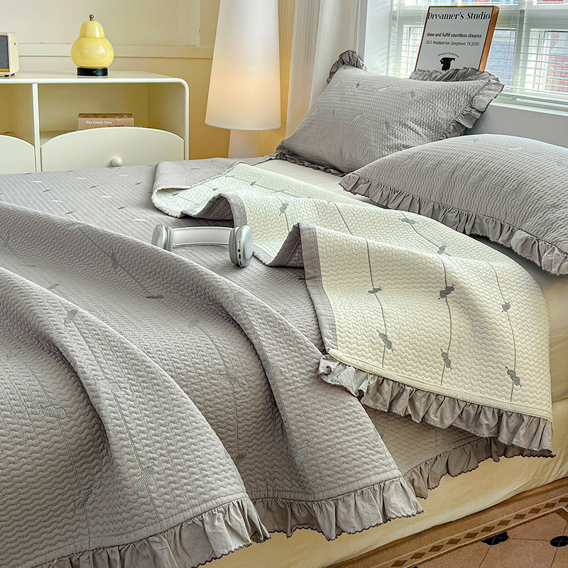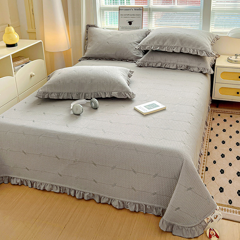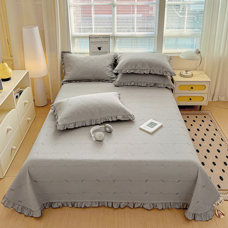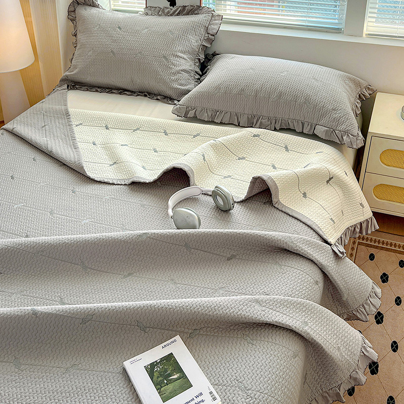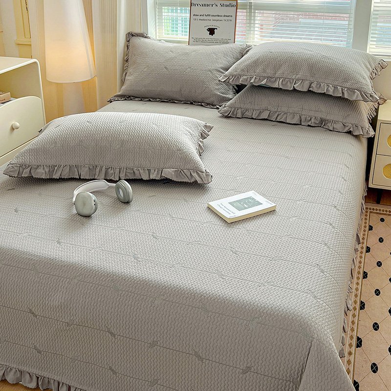 (总)源舜家纺 2025新款色织棉简约韩系花边床盖三件套,简约灰,简约粉,简约绿,简约驼,简约蓝