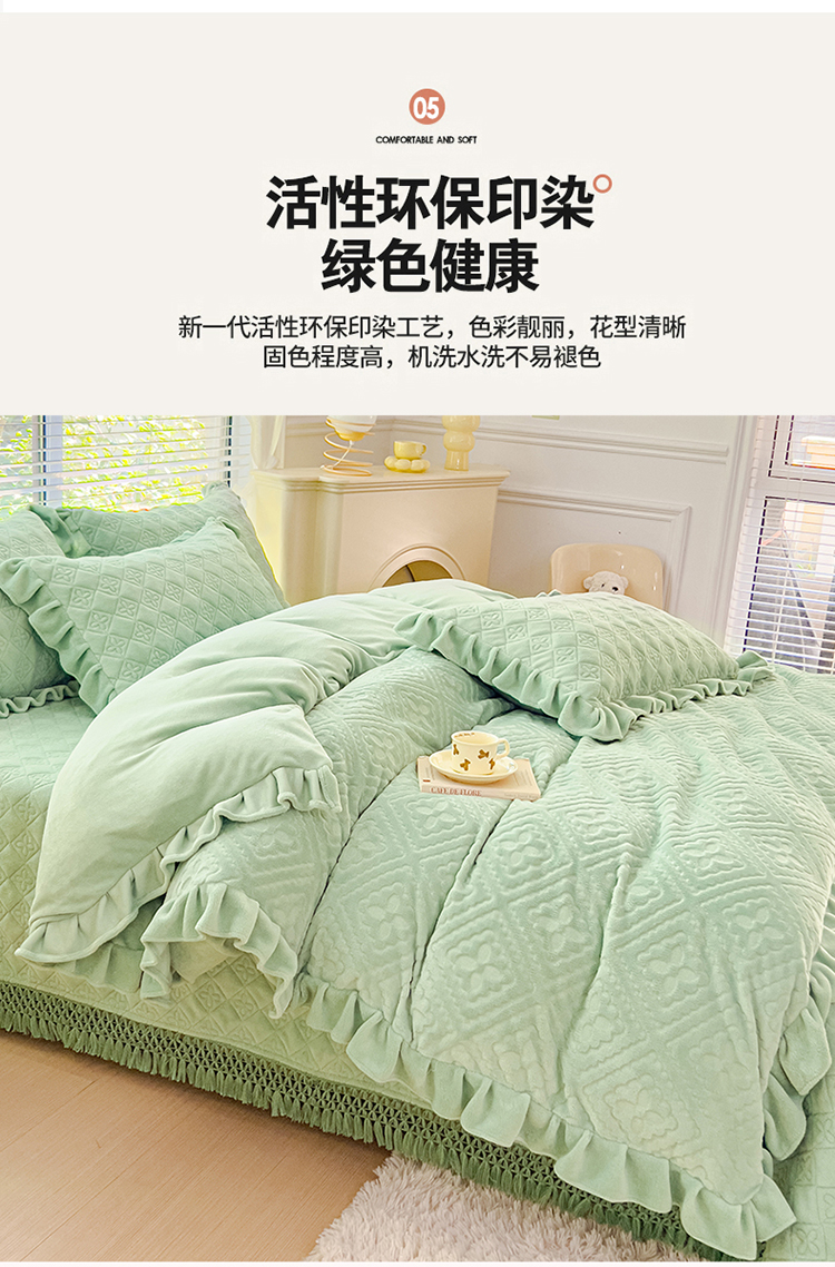 (总)佰诗特 230克全消光牛奶绒法式夹棉床盖四件套 立体浮雕雕花绒兔毛绒毛球加棉加厚保暖三四件套,唯爱-蓝,唯爱-白,唯爱-绿,唯爱-粉