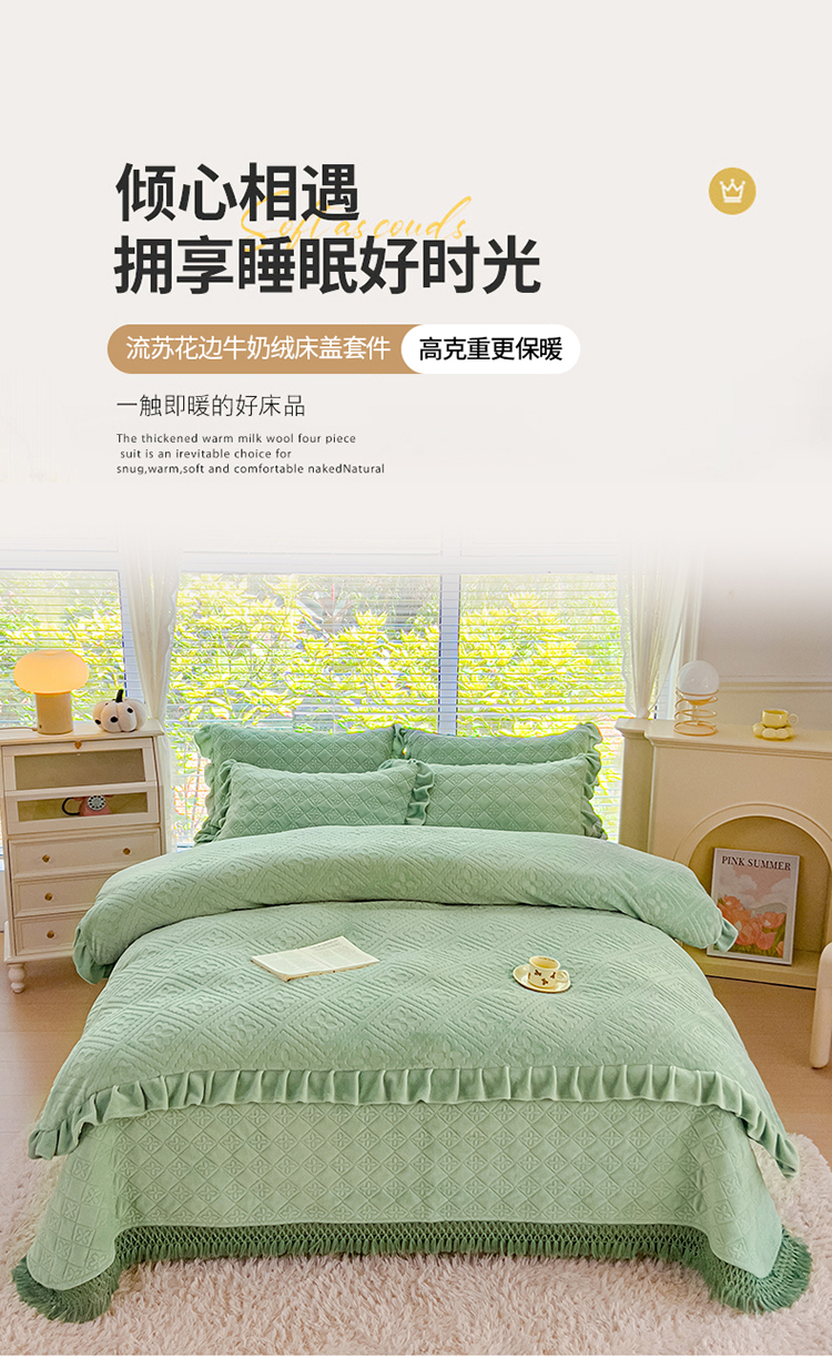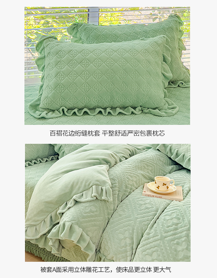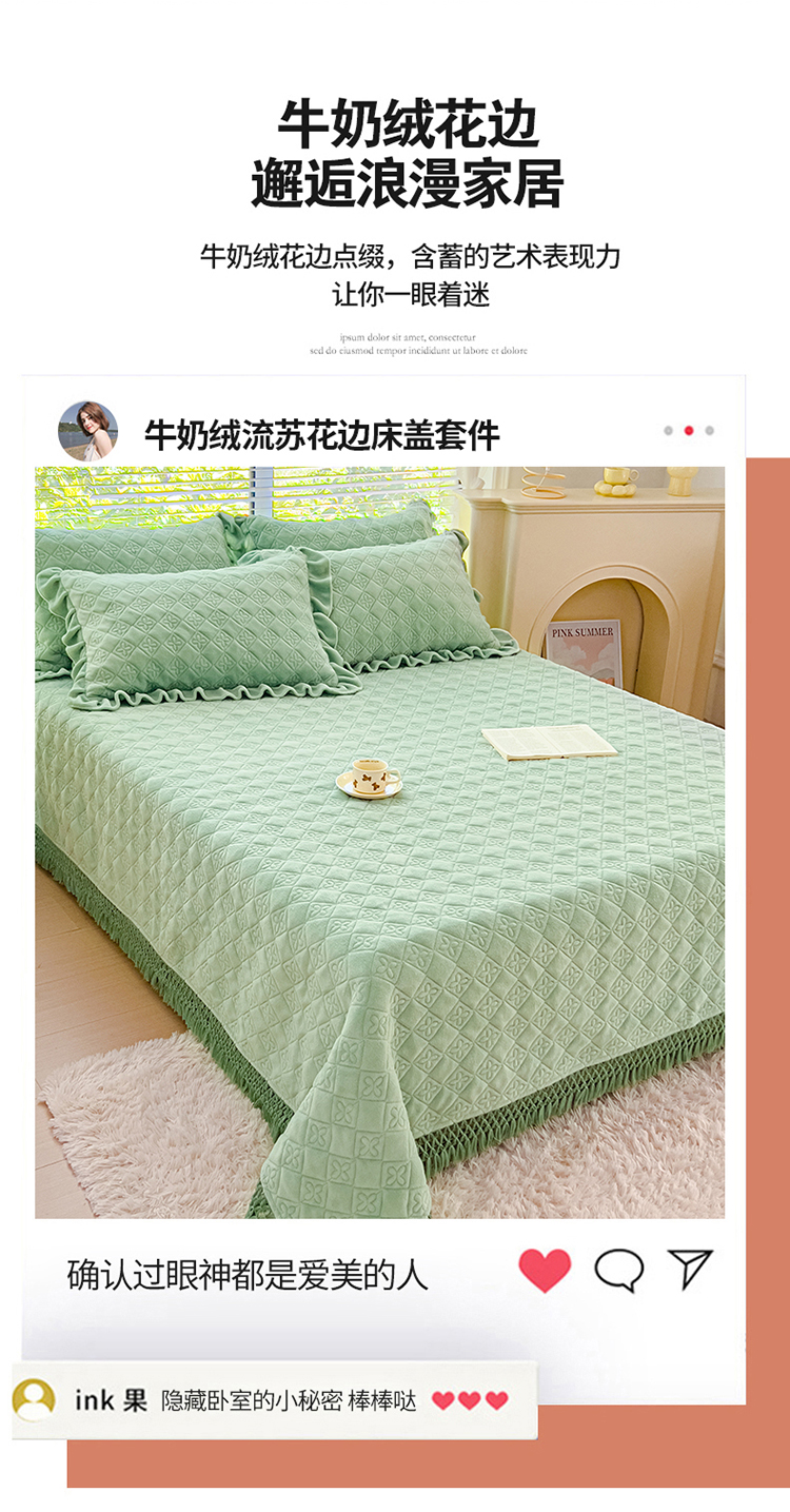 (总)佰诗特 2025高克重简约压线织带款牛奶绒夹棉床盖三件套 立体雕花绒加棉加厚纯色床盖四件套,简爱-绿,简爱-粉,简爱-蓝,简爱-紫,简爱-灰,简爱-黄