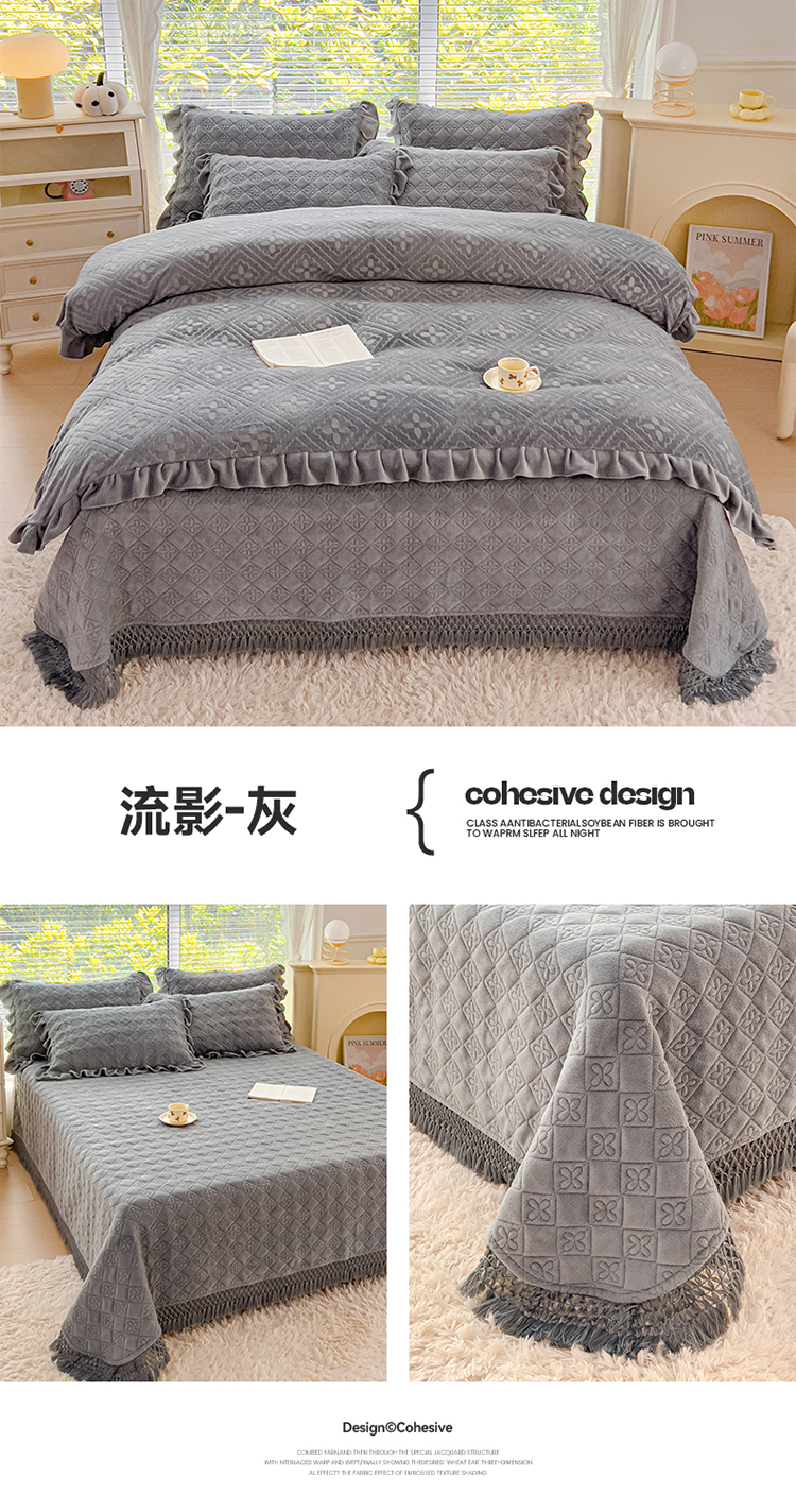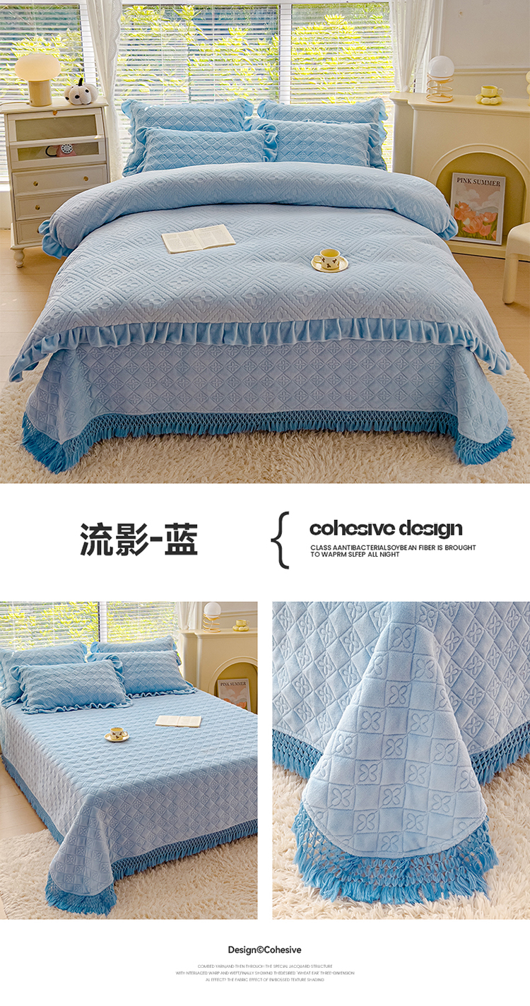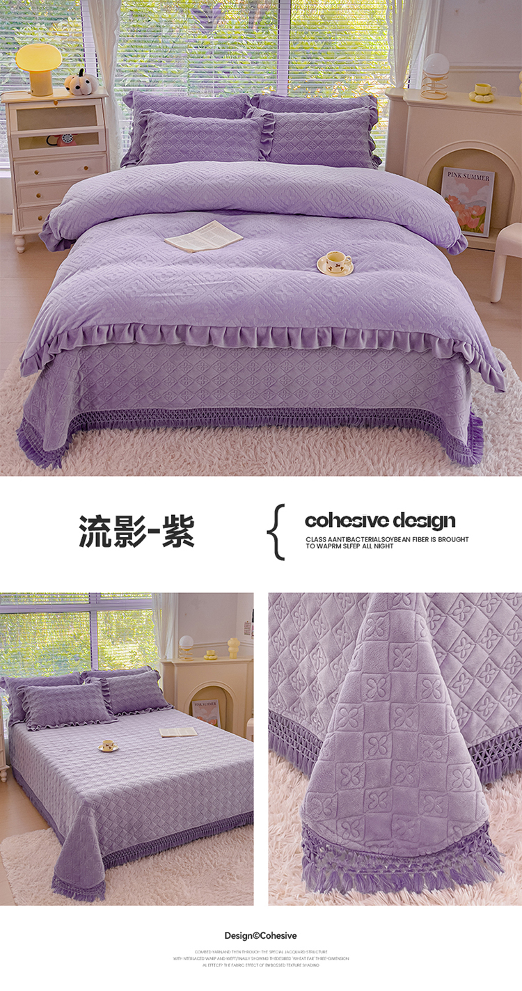 (总)2025牛奶绒夹棉床盖四件套 纯色雕花单被套加棉床盖三件套流苏款套件,流影-粉,流影-蓝,流影-紫,流影-灰,流影-绿