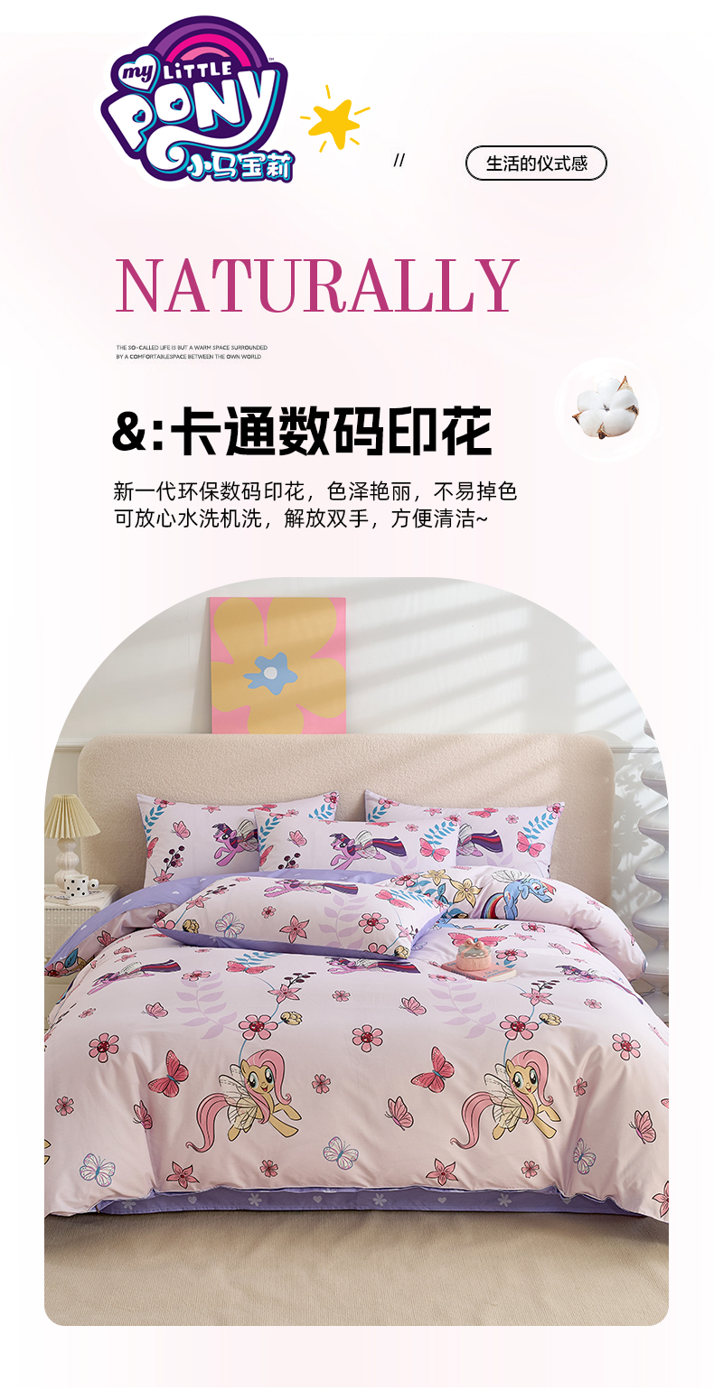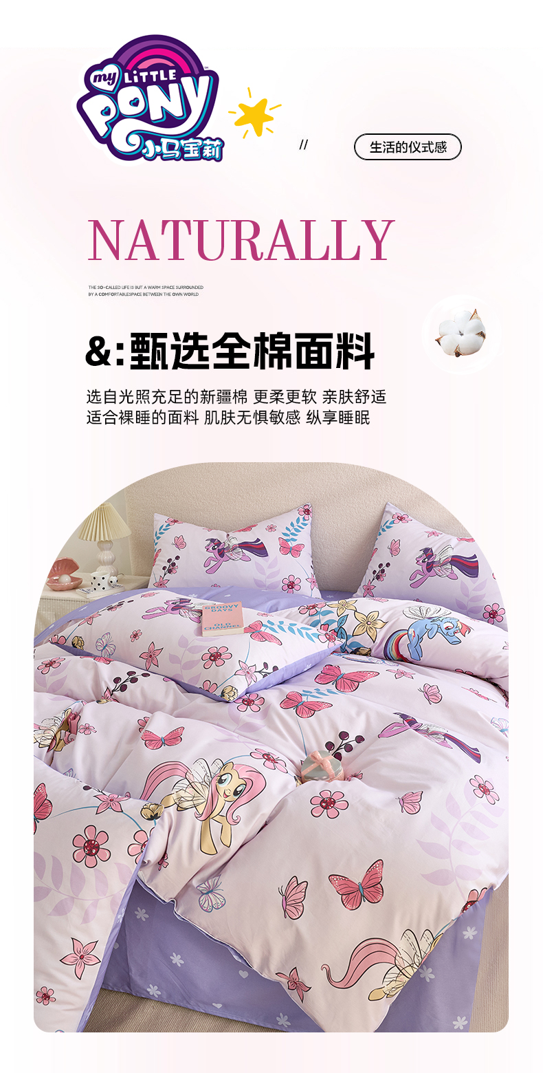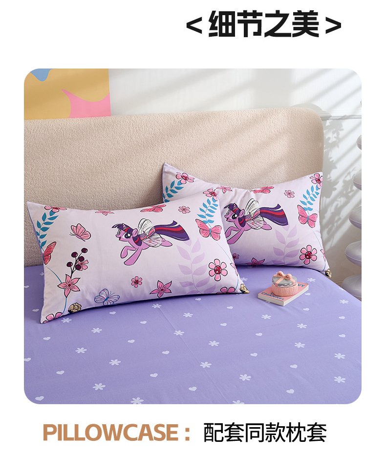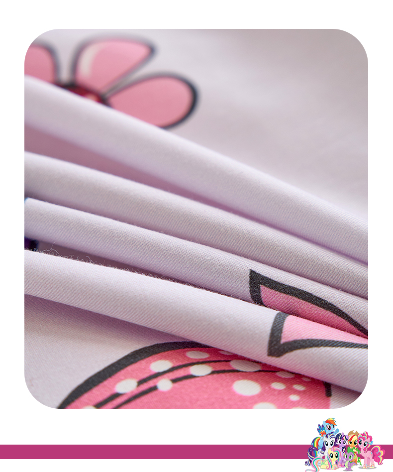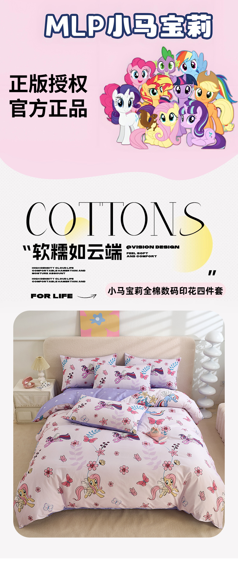 当前位置: 91家纺网 > 商品网购 > 床品套件 > 四件套 > 全棉普通四件套 > 百利卡通(原迪士尼家纺) 2025新款小马宝莉全棉纯棉数码印花圆网四件套 飞翔柔柔