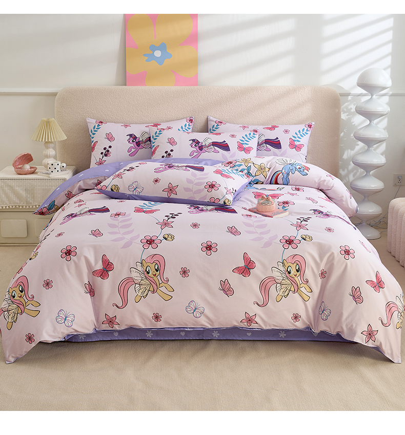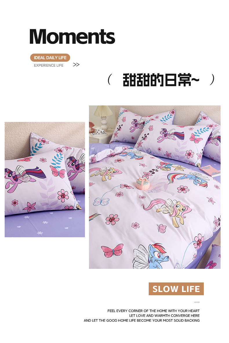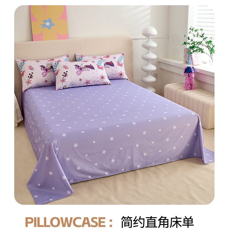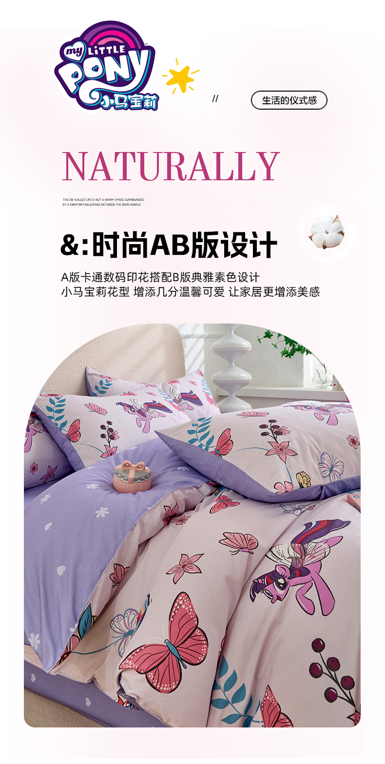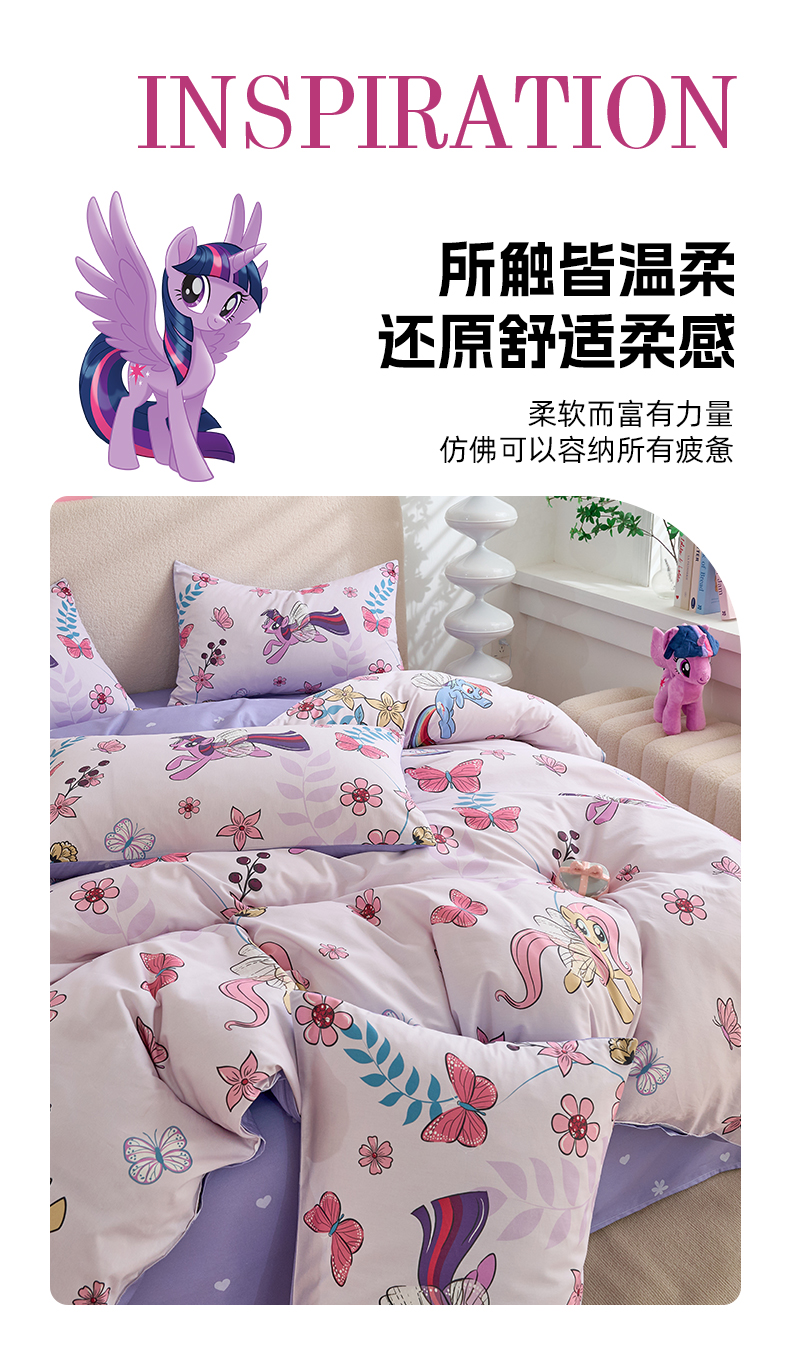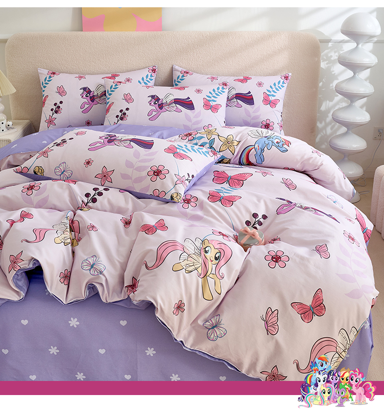 当前位置: 91家纺网 > 商品网购 > 床品套件 > 四件套 > 全棉普通四件套 > 百利卡通(原迪士尼家纺) 2025新款小马宝莉全棉纯棉数码印花圆网四件套 飞翔柔柔