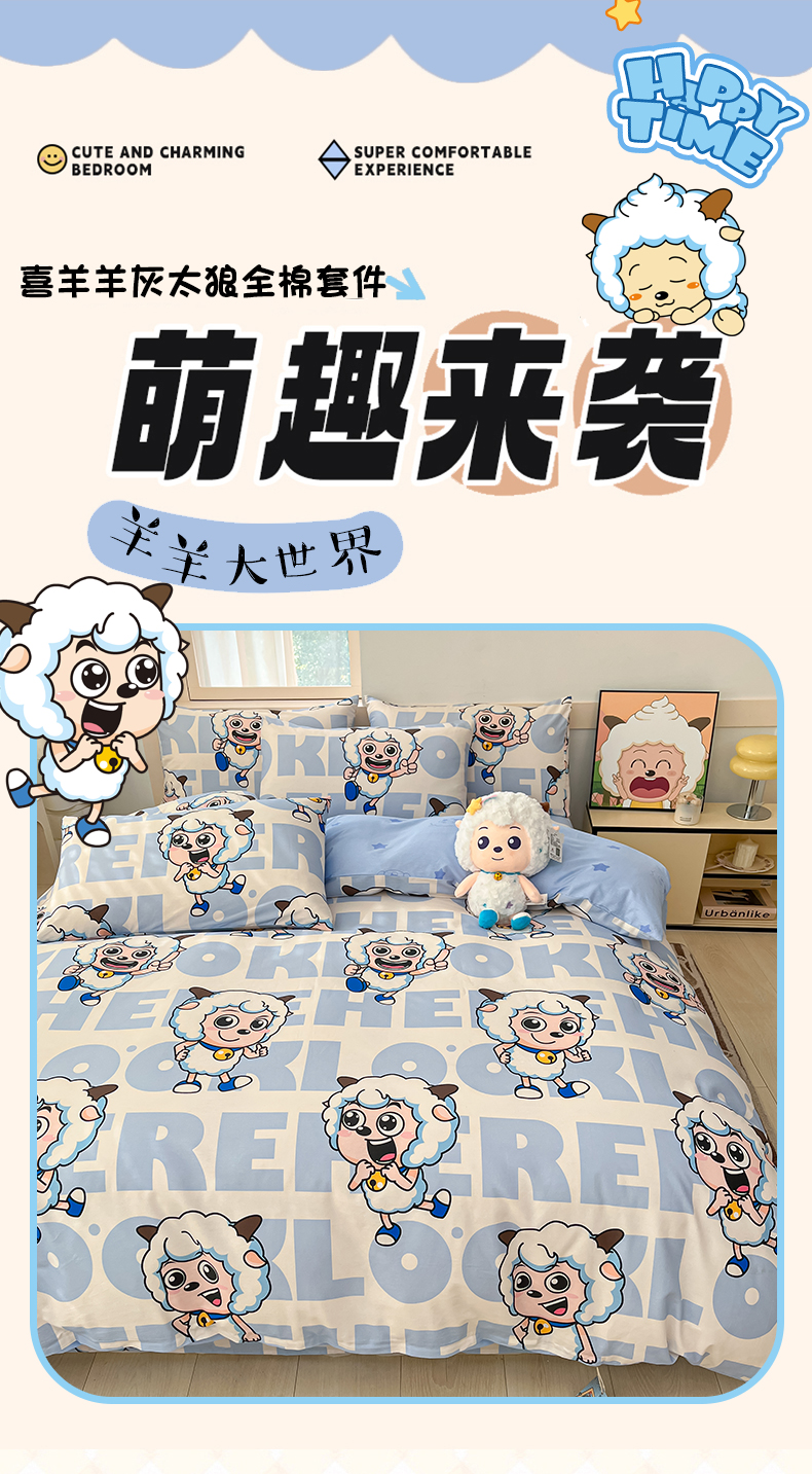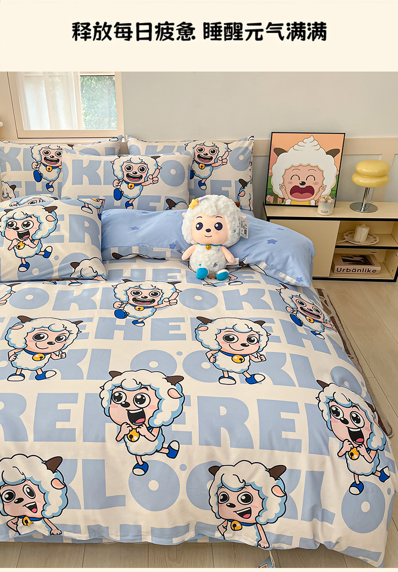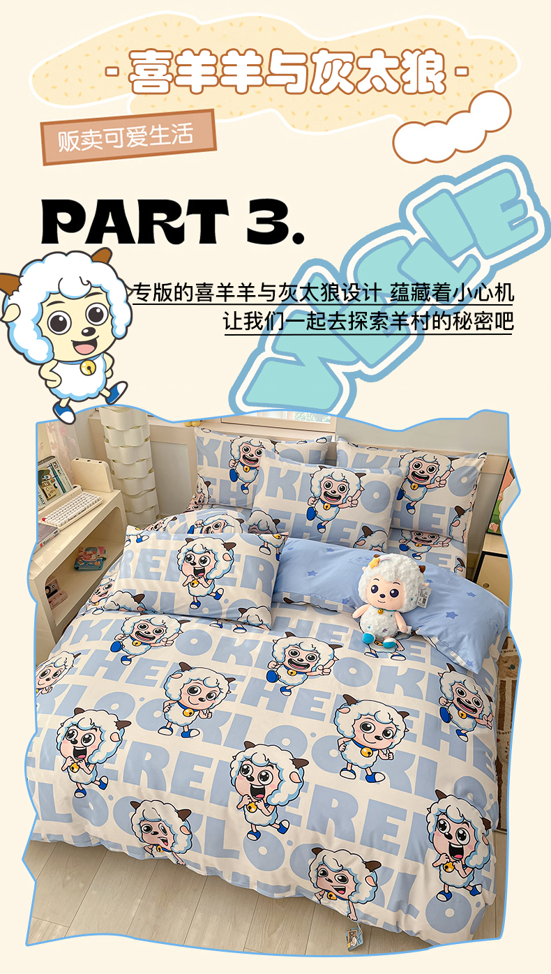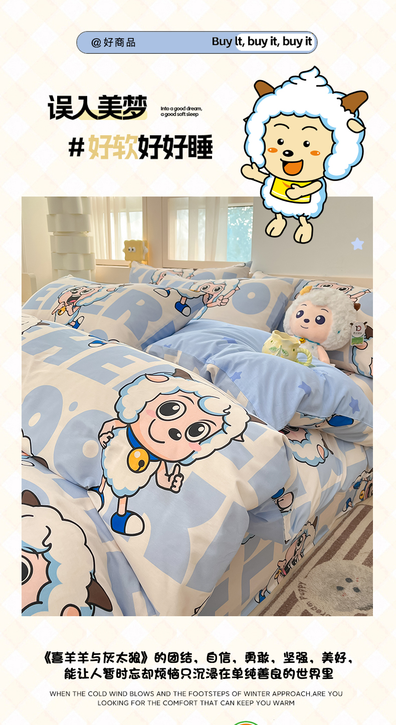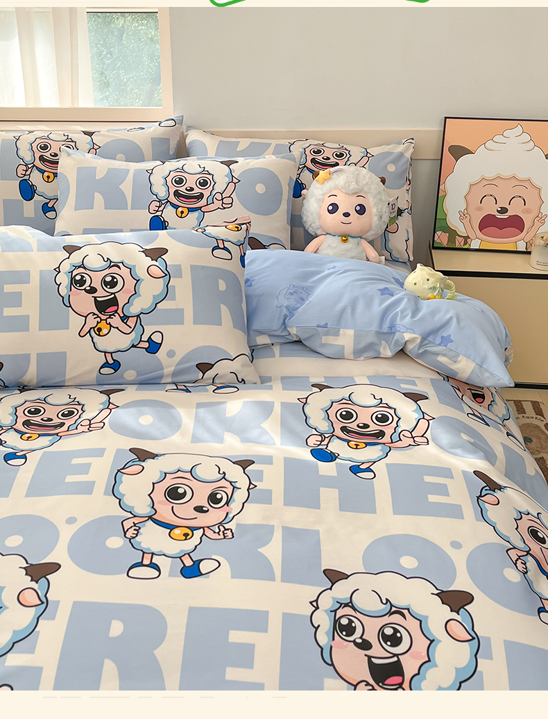 当前位置: 91家纺网 > 商品网购 > 床品套件 > 四件套 > 全棉普通四件套 > 金鑫汇家纺 2025新款喜羊羊与灰太狼全棉四件套 字母喜羊羊