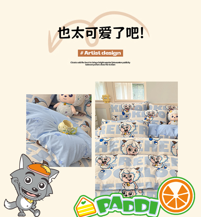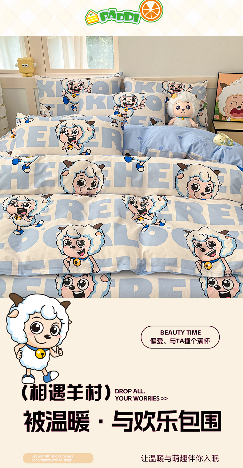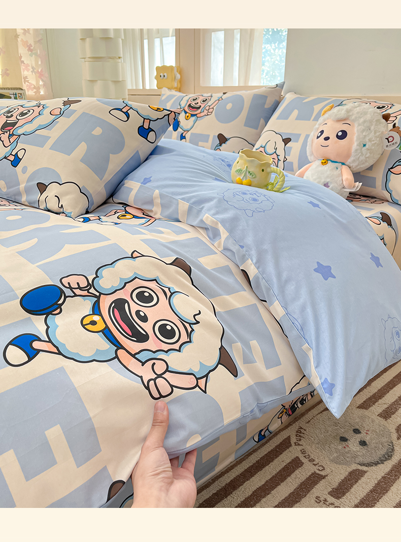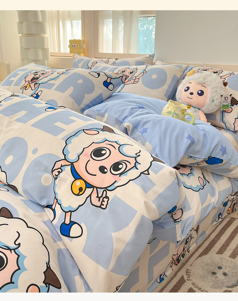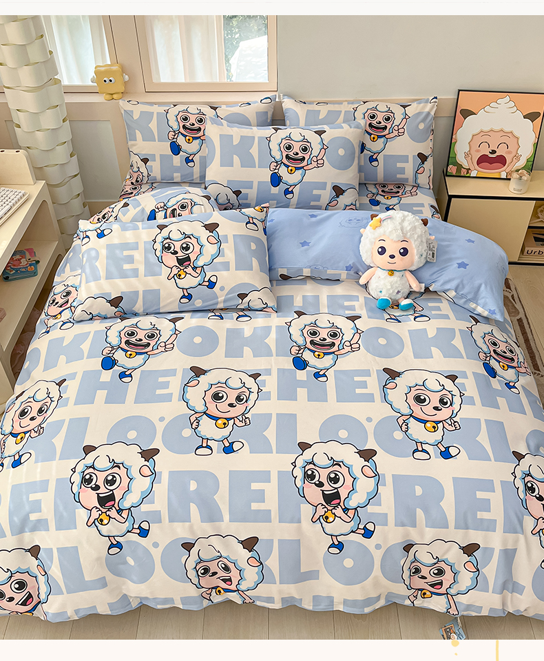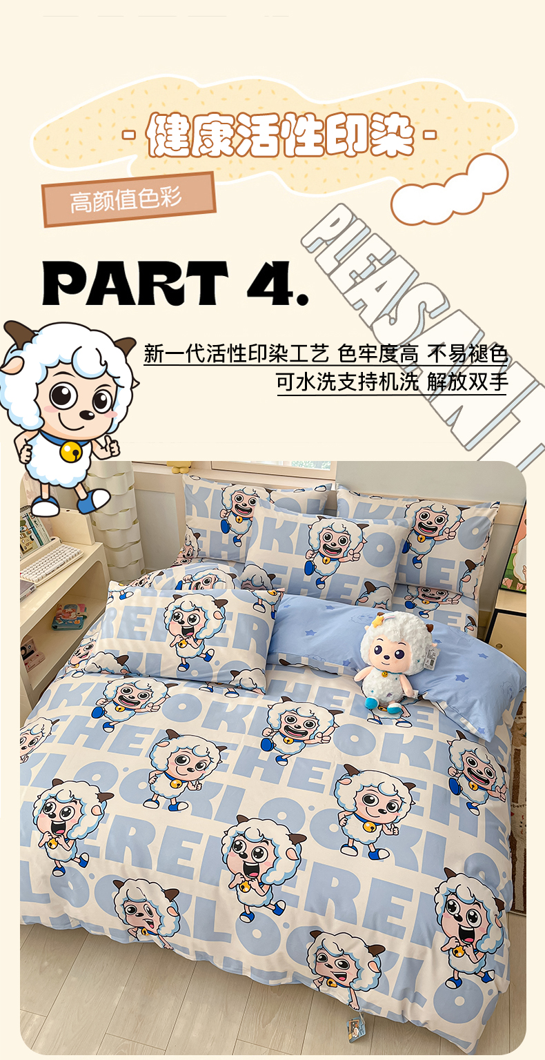 当前位置: 91家纺网 > 商品网购 > 床品套件 > 四件套 > 全棉普通四件套 > 金鑫汇家纺 2025新款喜羊羊与灰太狼全棉四件套 字母喜羊羊