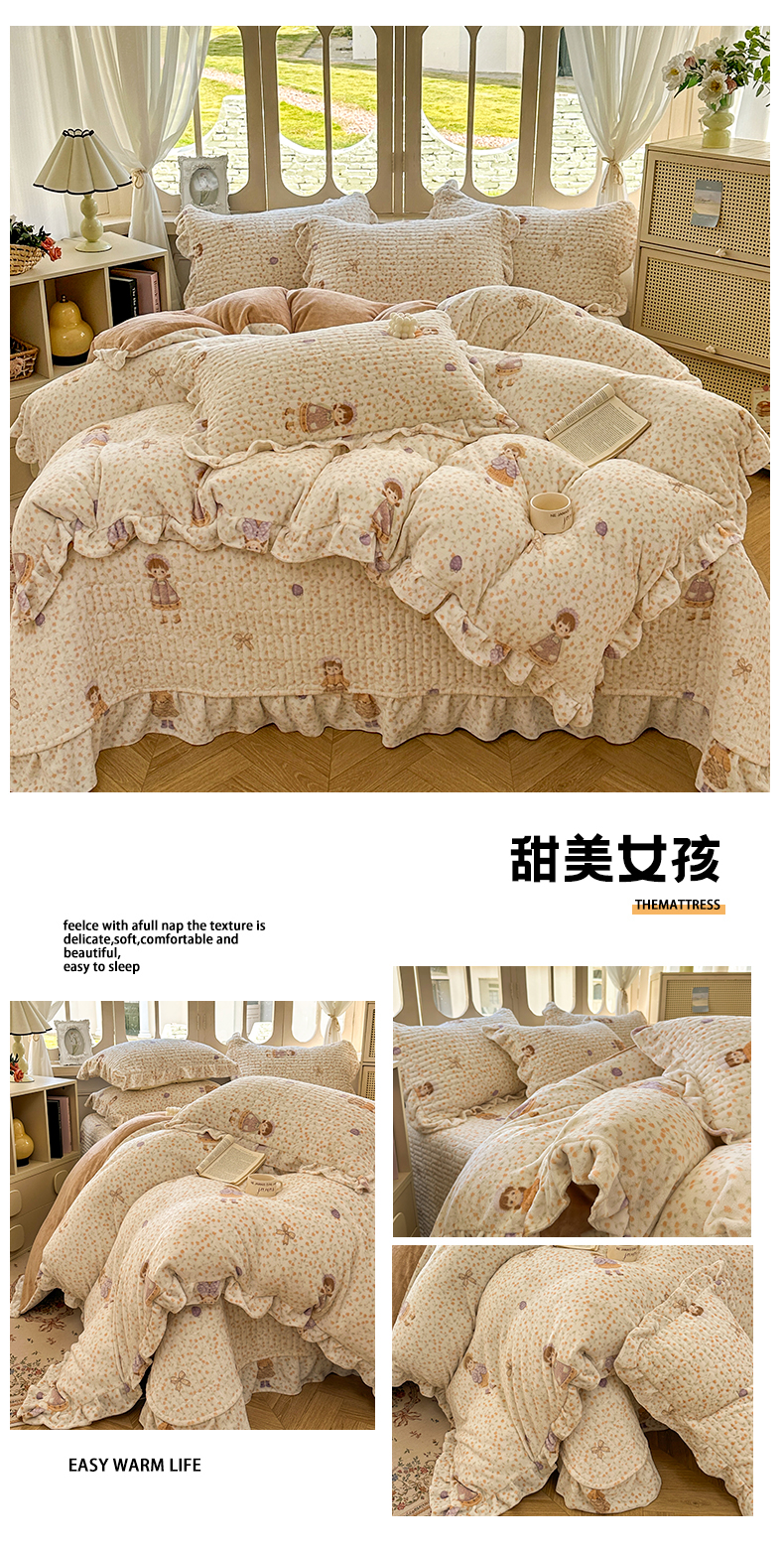 商品名称:美梦家纺 2025新款牛奶绒花边夹棉床盖四件套 豆蔻