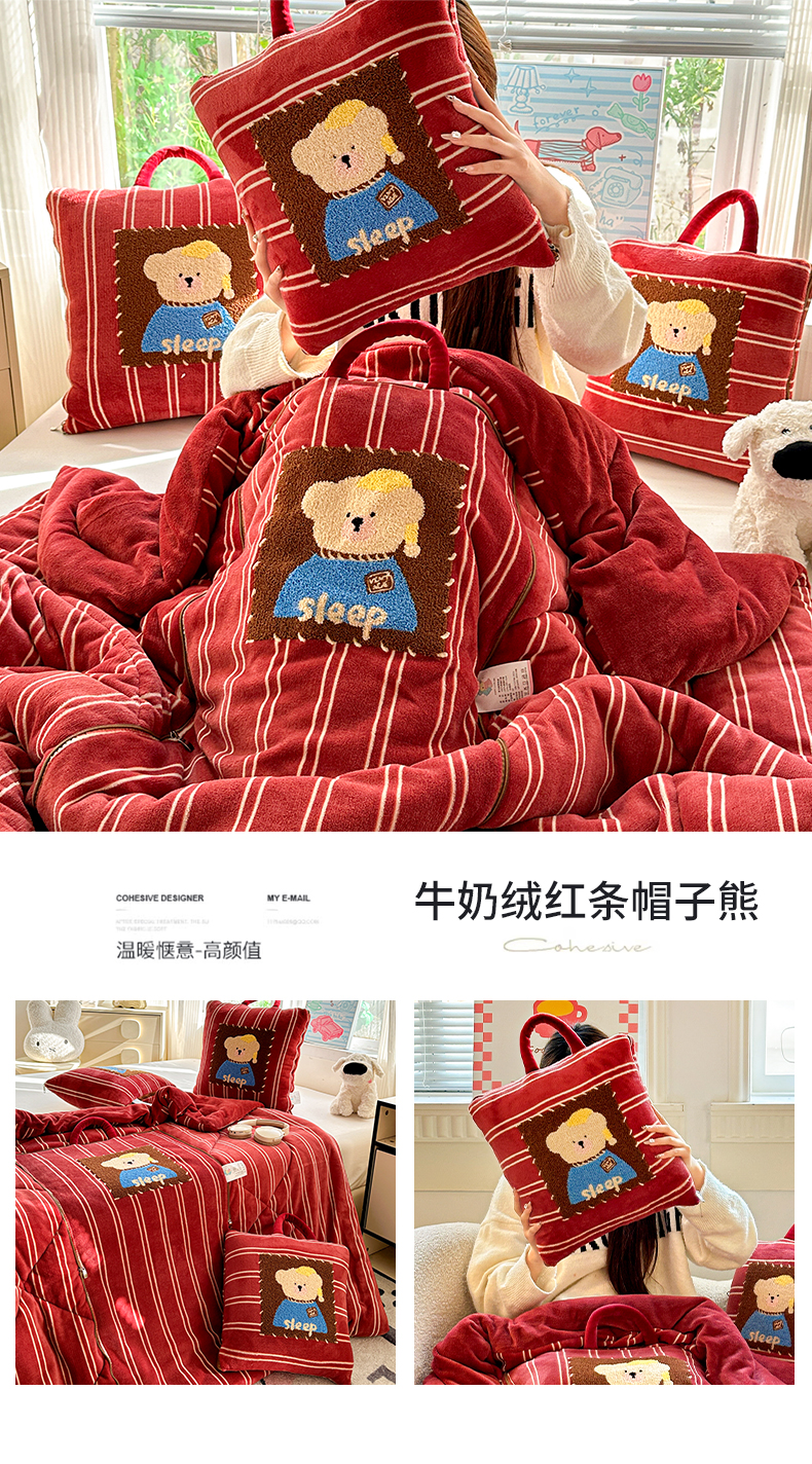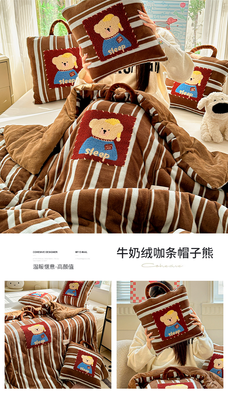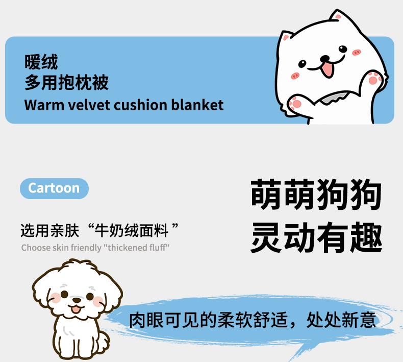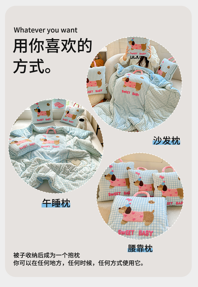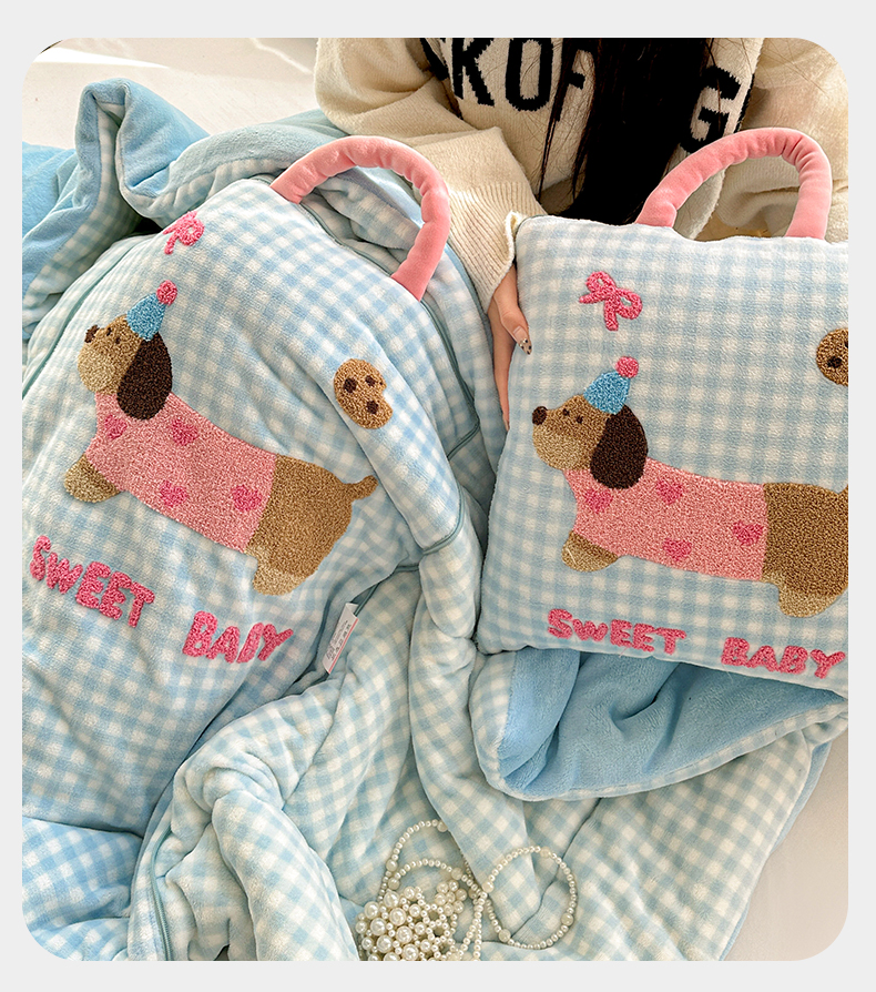 商品名称:古本家居 2025新款牛奶绒毛巾绣狗狗熊熊款抱枕被 牛奶绒粉格腊肠狗