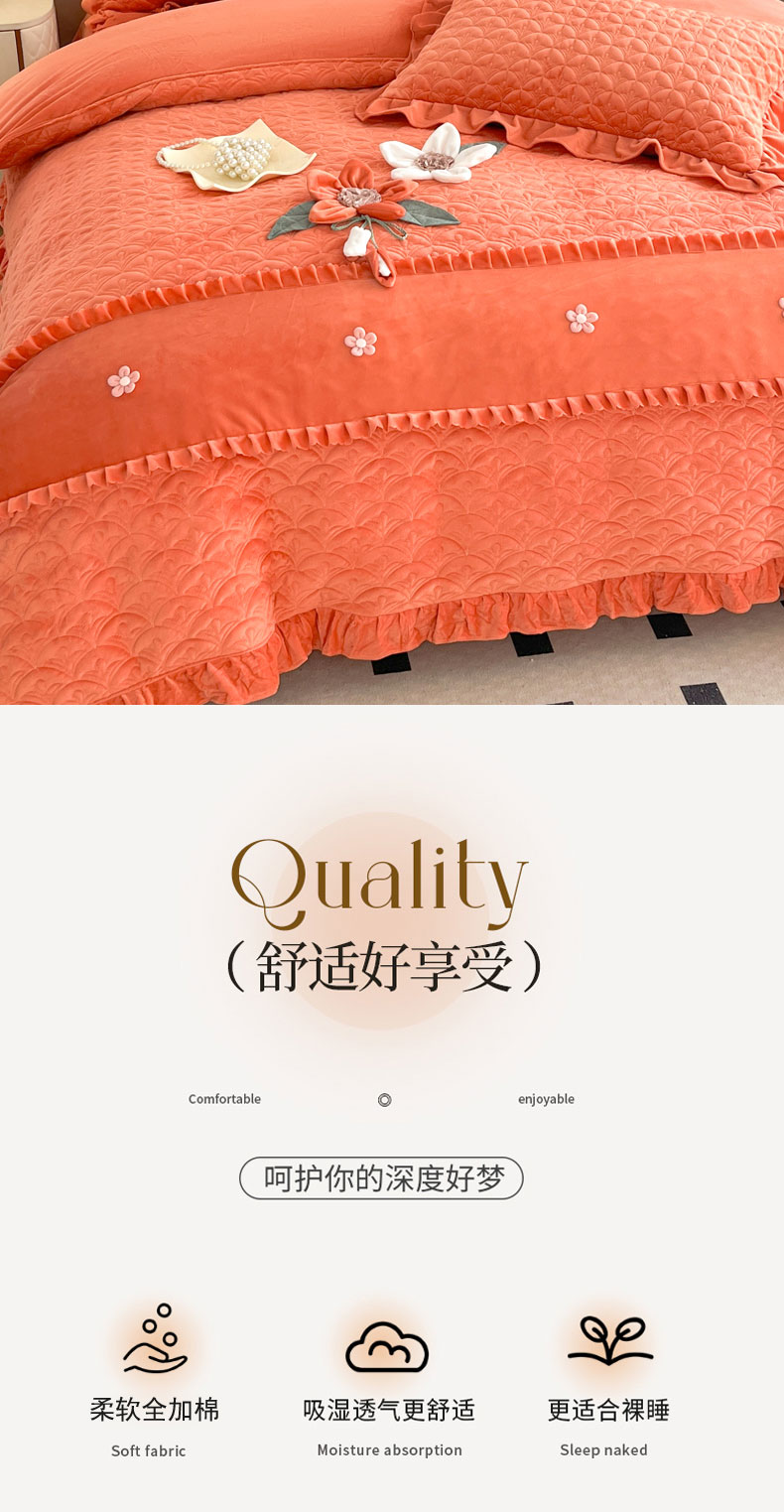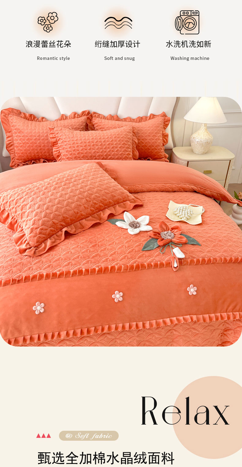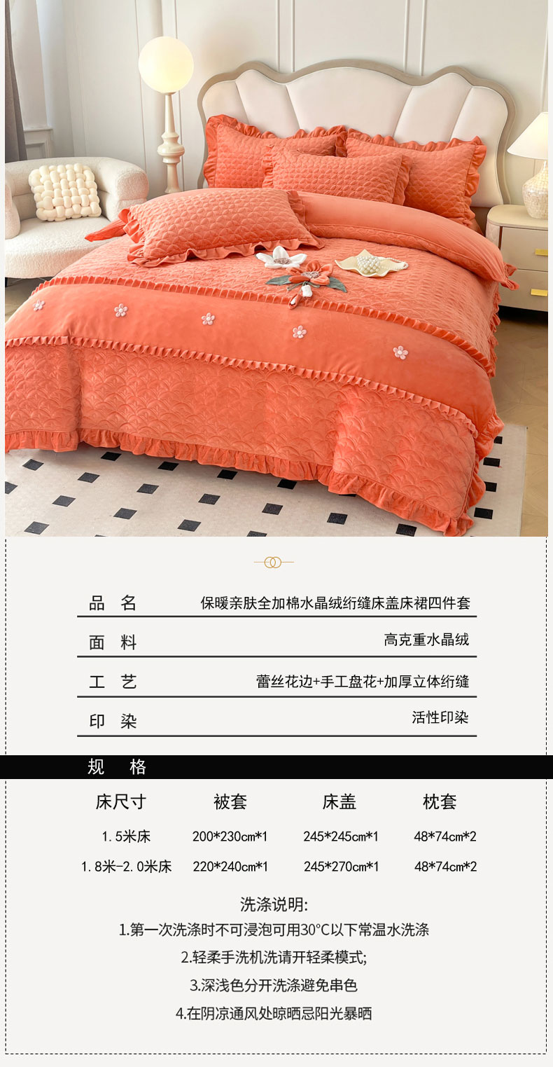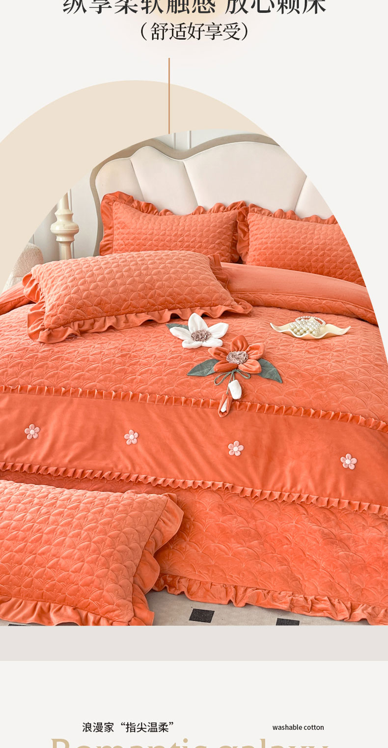 商品名称:兴美佳家纺 2024新款水晶绒全加棉床盖四件套-冬之恋 冬之恋-橘色