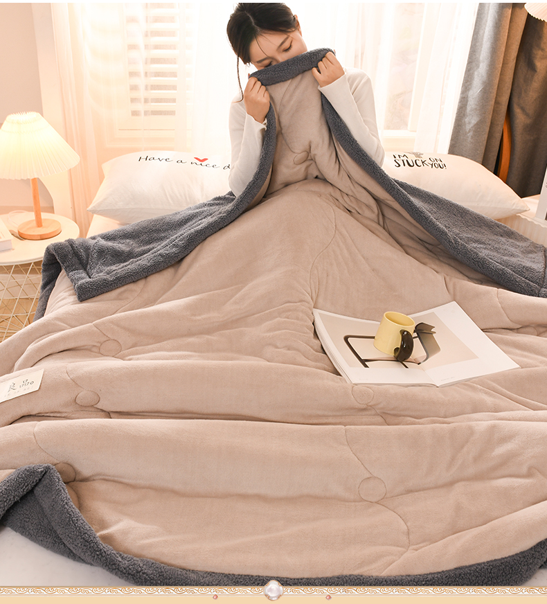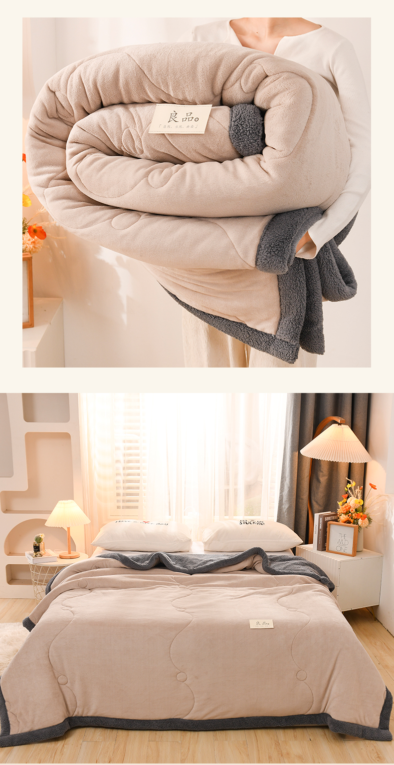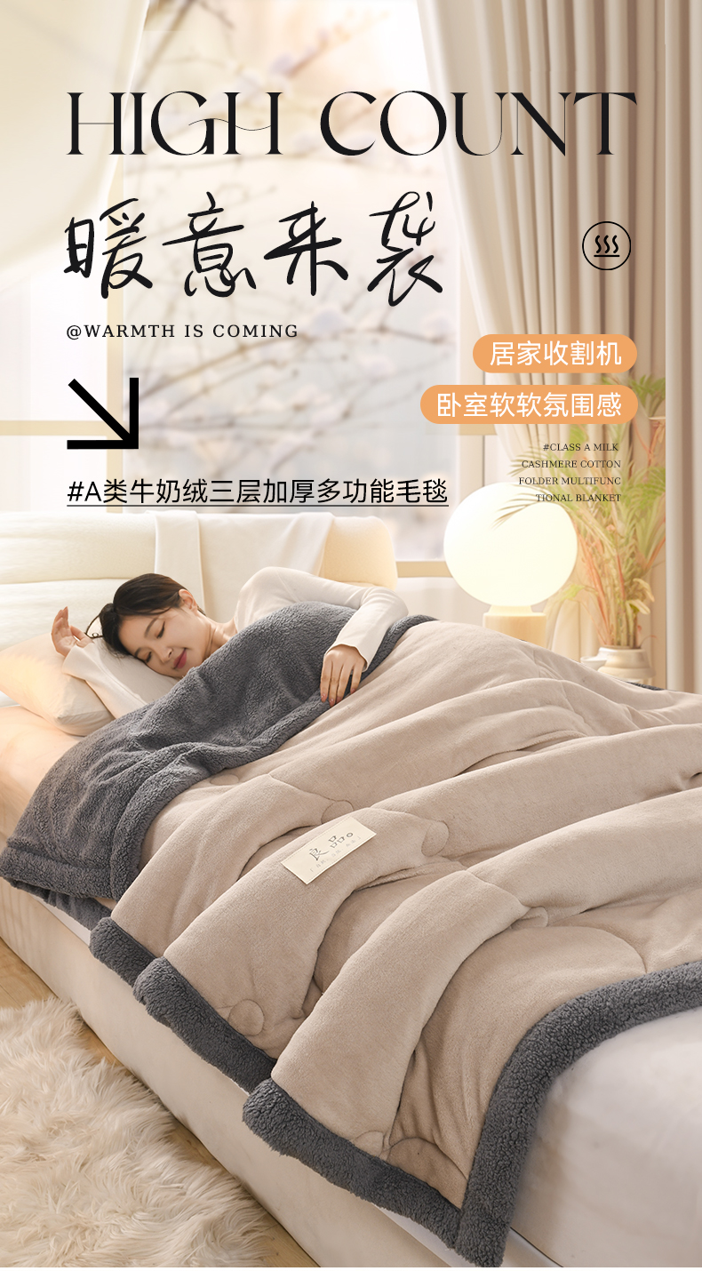 恋绒家纺 2025新款三层牛奶绒夹棉毛毯复合盖毯直播外贸毯子 杏仁色