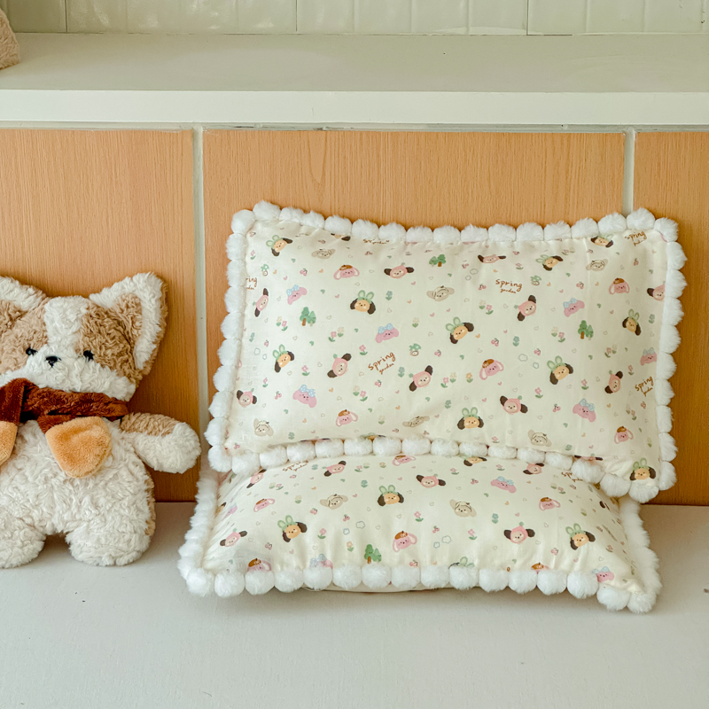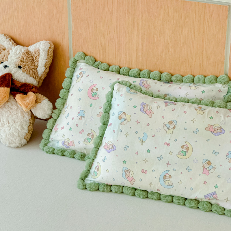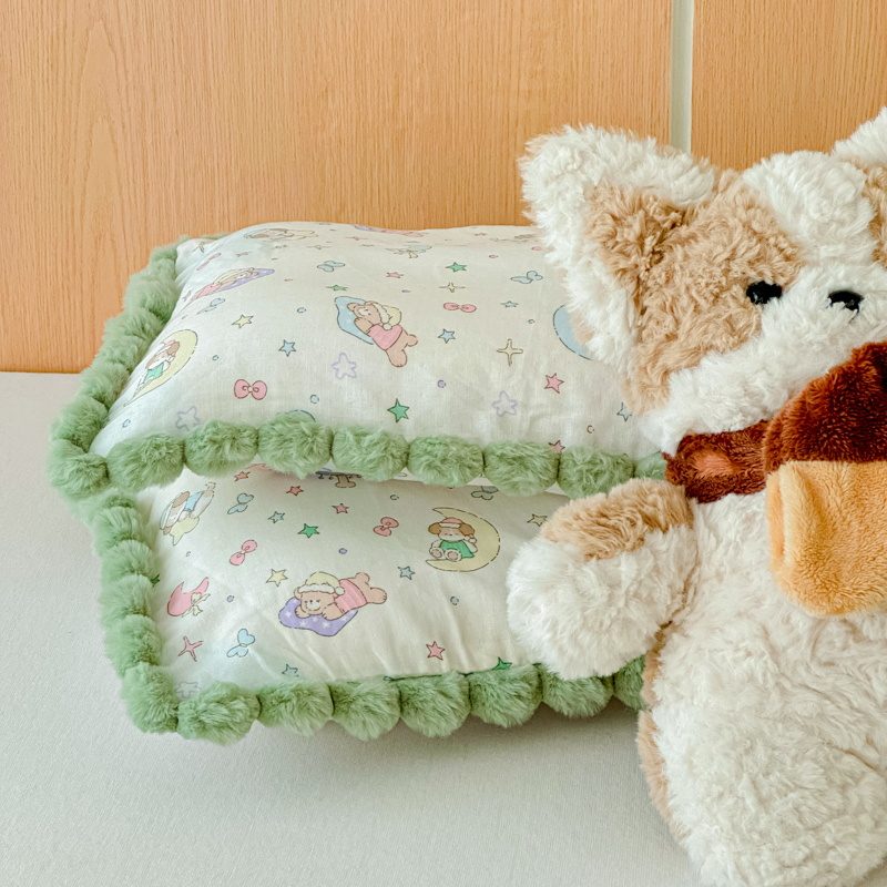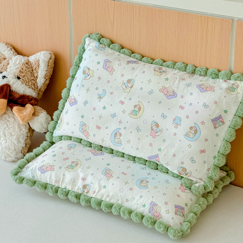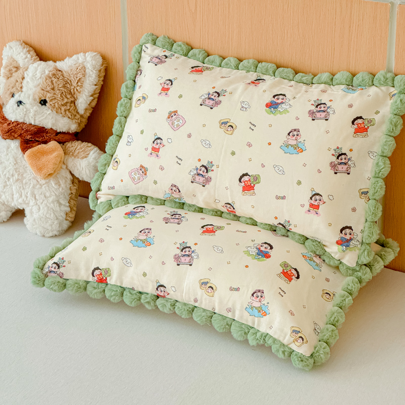 商品名称:金丝鸟家纺 2026新款全棉双层纱毛球款枕套多规格儿童枕套 叠拍组合图仅供展示