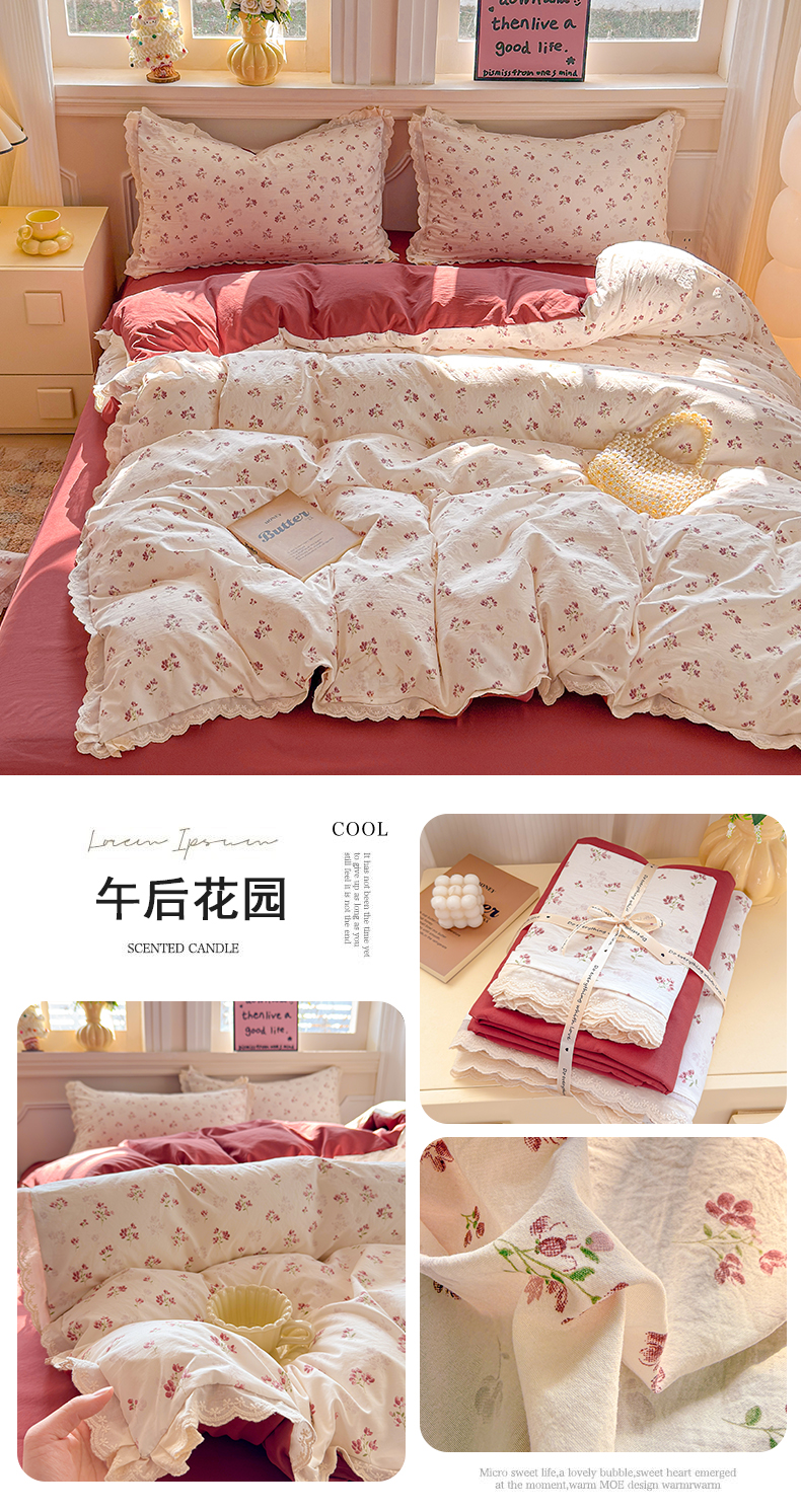 芯贝儿 2026新款古法小清新全棉花边仿棉水洗棉法式四件套件被套床单 浪漫樱桃