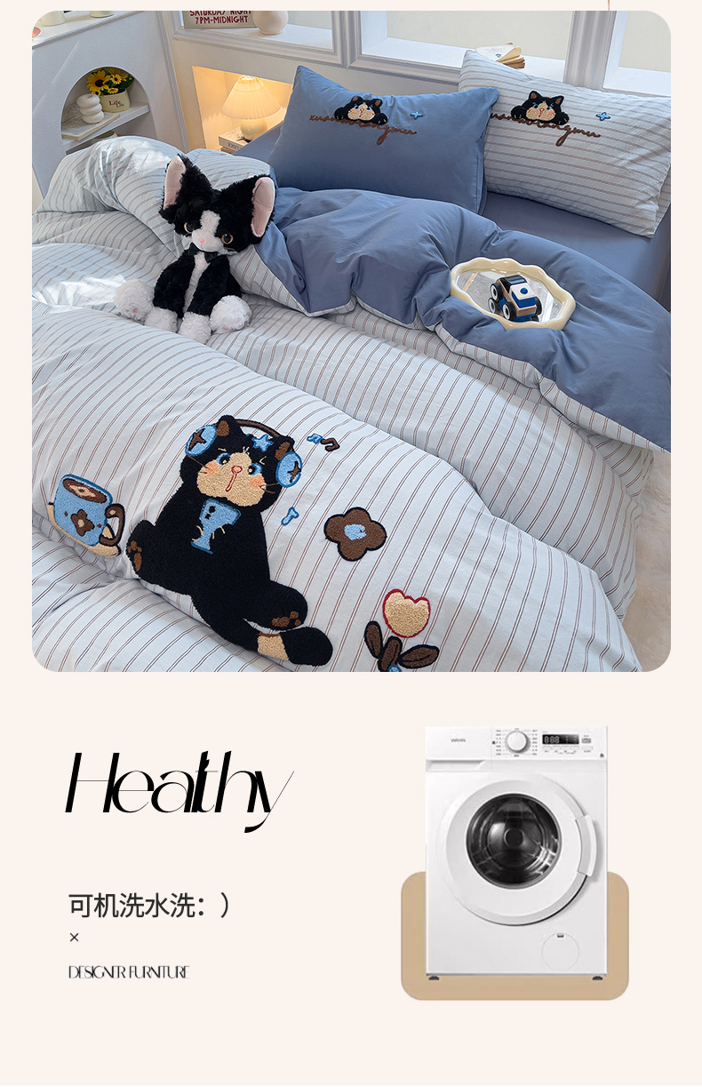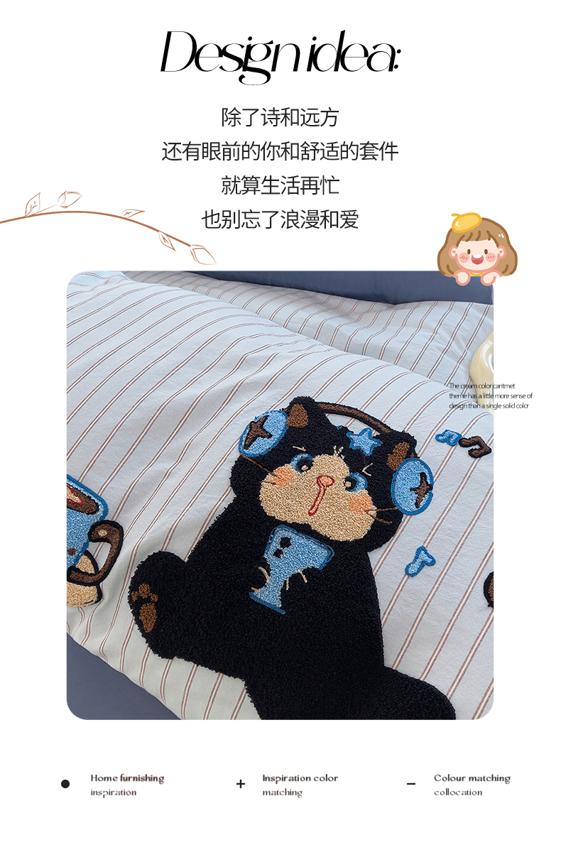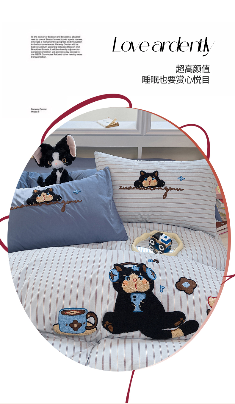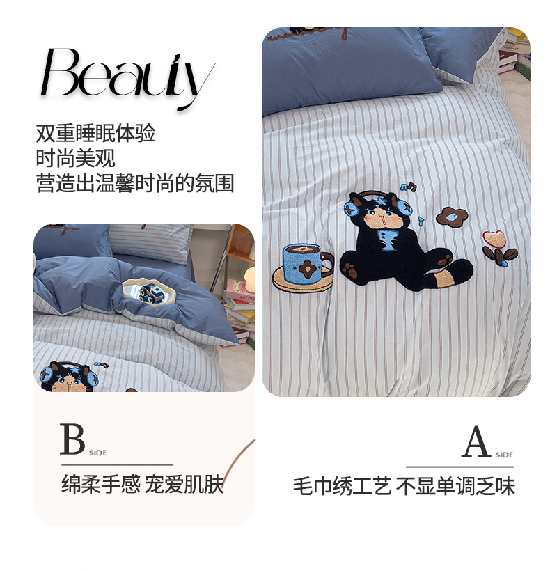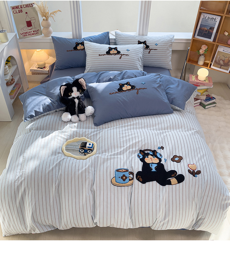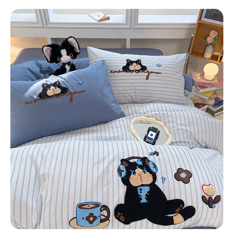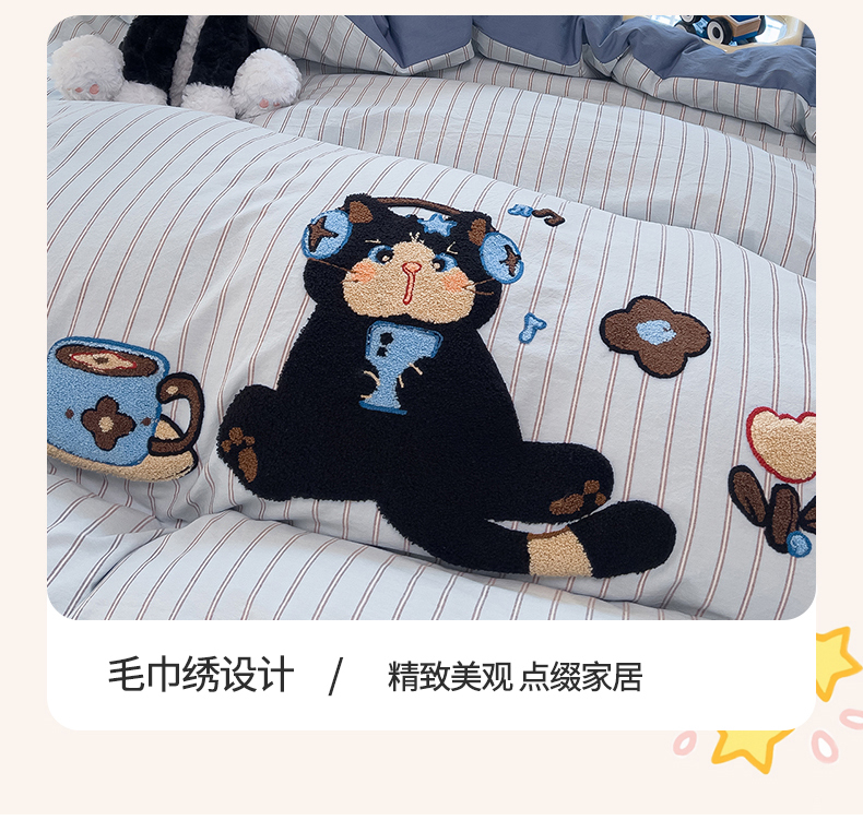 当前位置: 91家纺网 > 商品网购 > 床品套件 > 四件套 > 全棉普通四件套 > 炫拼家纺 2026新款多巴胺系列A类全棉40支水洗棉卡通毛巾绣四件套 多巴胺一咖啡猫