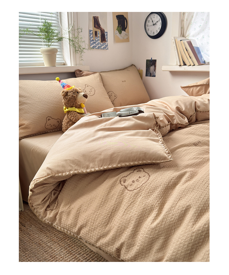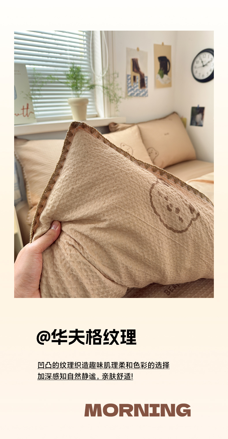 商品名称:典曼家纺 2026新款A类全棉华夫格提花贝壳边四件套 萌动时光-咖