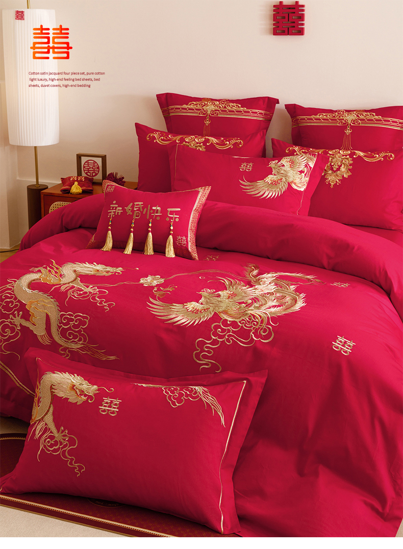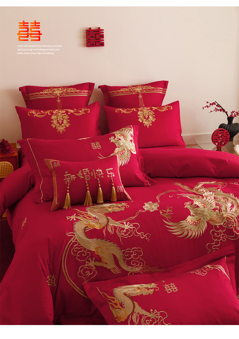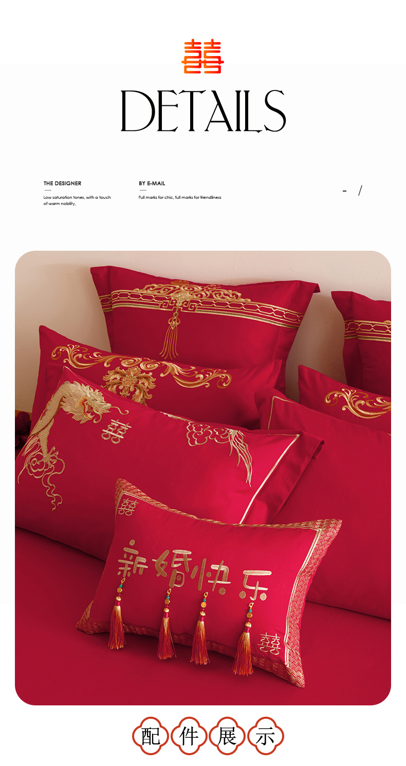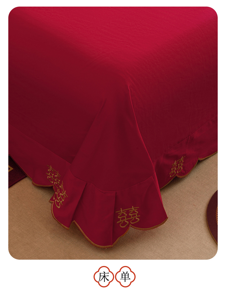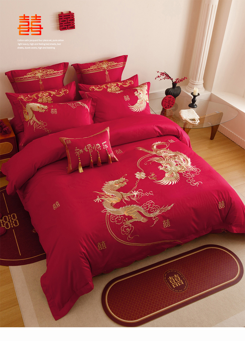 当前位置: 91家纺网 > 商品网购 > 床品套件 > 四件套 > 提花四件套 > 红番天婚庆 2025新款全棉纯棉提花刺绣四件套禧约-金