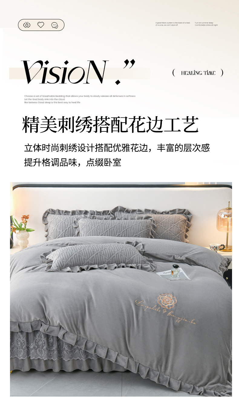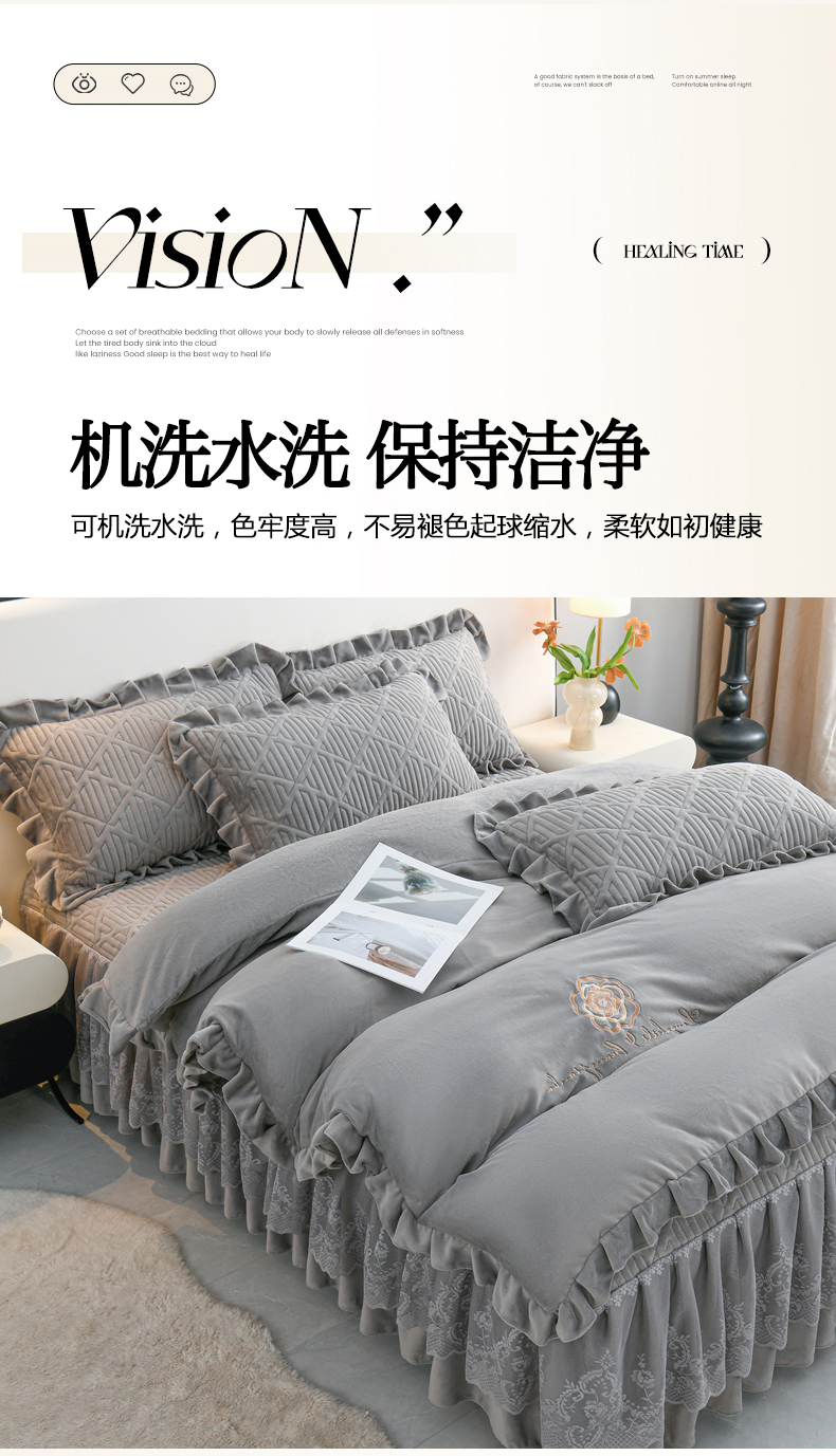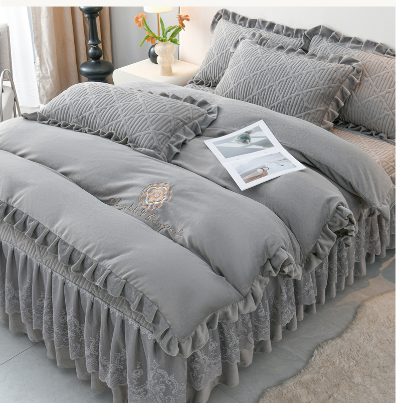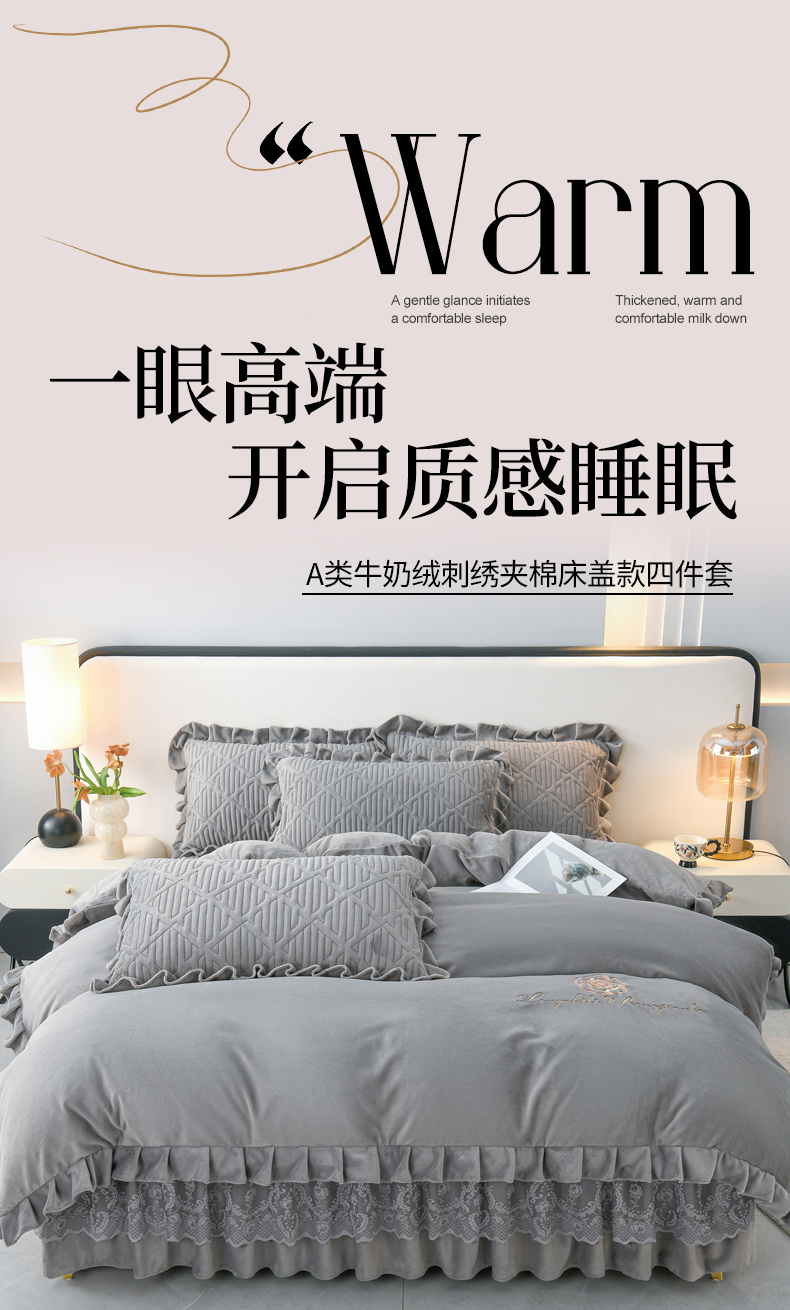 当前位置: 91家纺网 > 商品网购 > 床品套件 > 四件套 > 牛奶绒四件套 > 优家居工厂店 2026新品240克高克重牛奶绒韩版牛奶绒夹棉床裙四件套床裙三件套直播热款-东方韵 东方韵-灰色