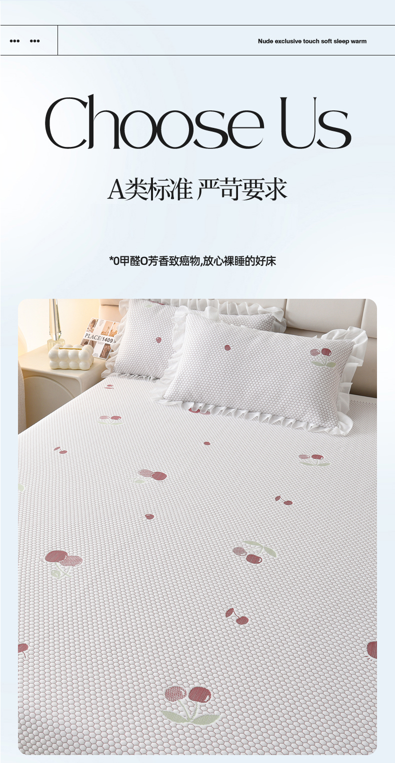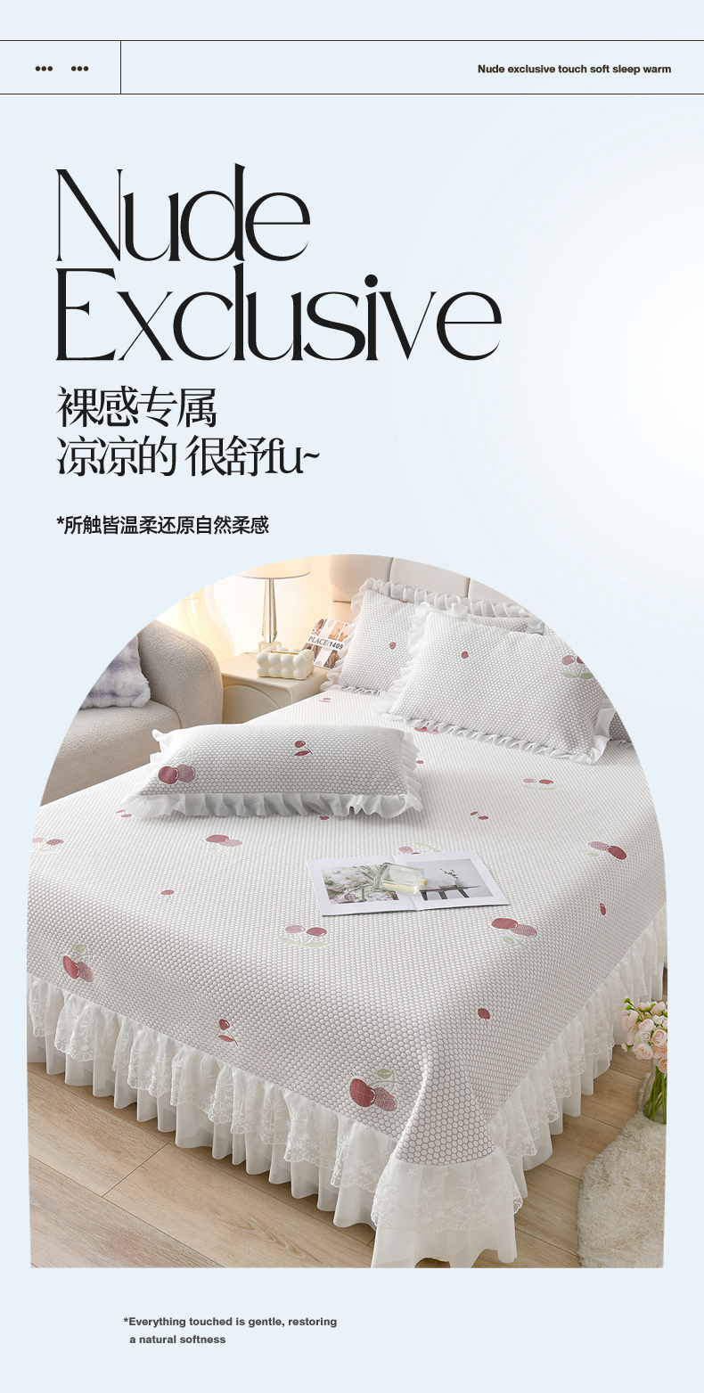 当前位置: 91家纺网 > 商品网购 > 床上用品 > 凉席 > 优家居工厂店 A类2026新款凉感豆豆提花凉席床裙款床盖三件套高档蕾丝花边可机洗水洗 盛夏-樱桃