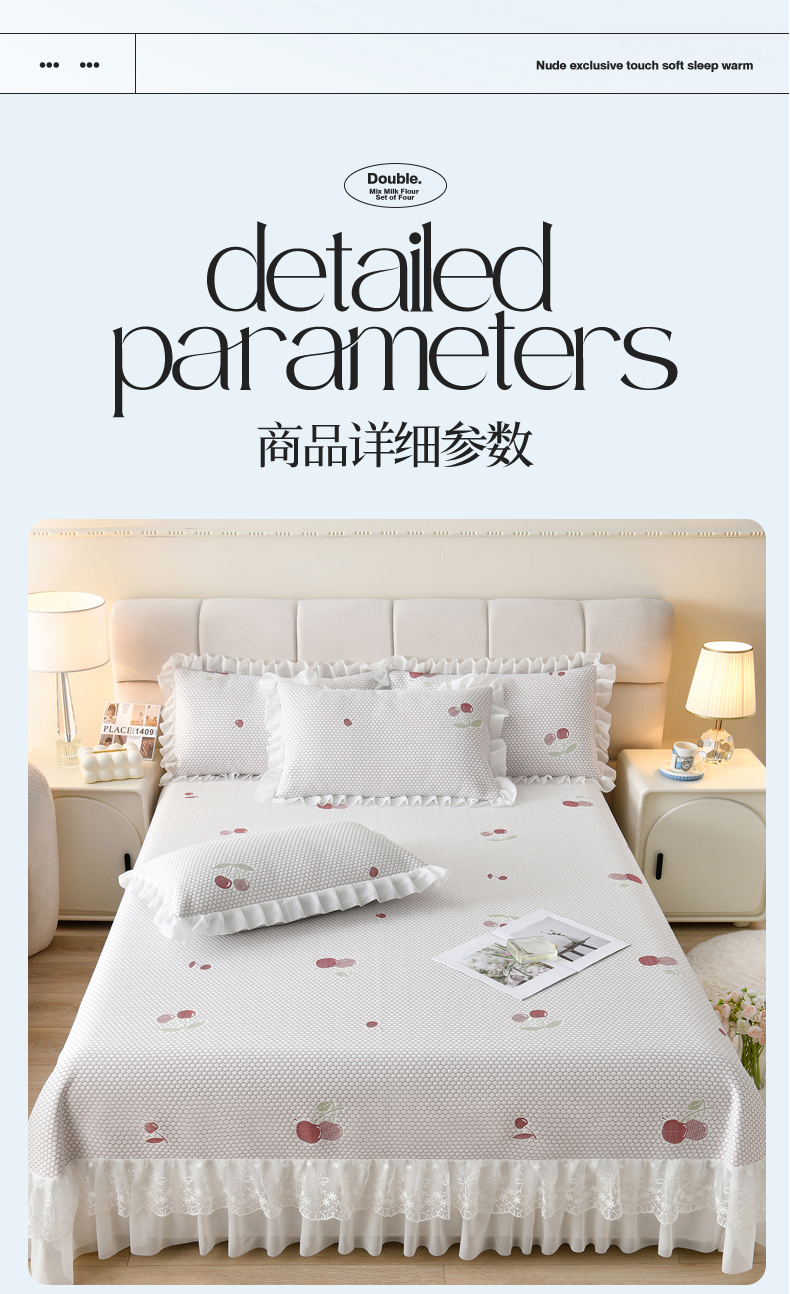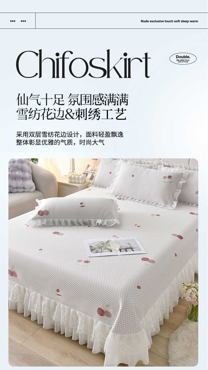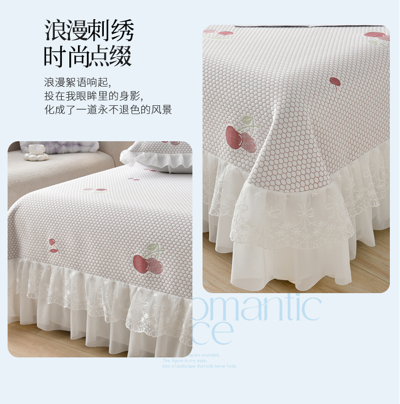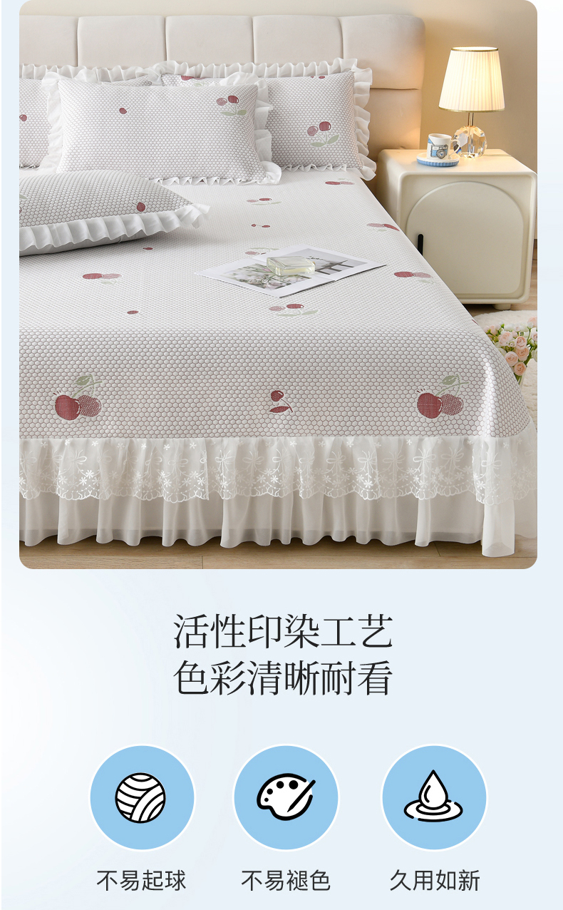 • 91家纺网 家纺一手货源 找家纺 优家居工厂店 A类2026新款凉感豆豆提花凉席床裙款床盖三件套高档蕾丝花边可机洗水洗 盛夏-樱桃