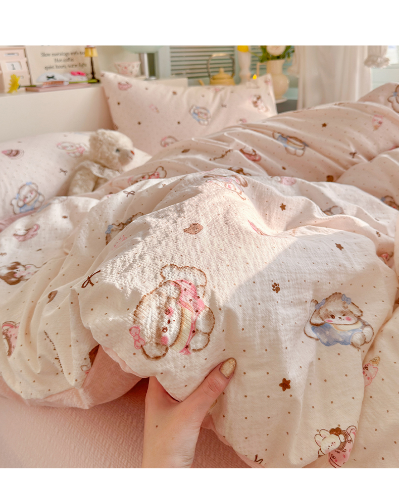 当前位置: 91家纺网 > 商品网购 > 床品套件 > 四件套 > 其它四件套 > 优选良品 2026新款小清新110g高品质直播热卖款A类泡芙棉双层纱四件套 萌萌狗