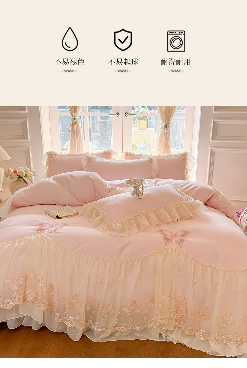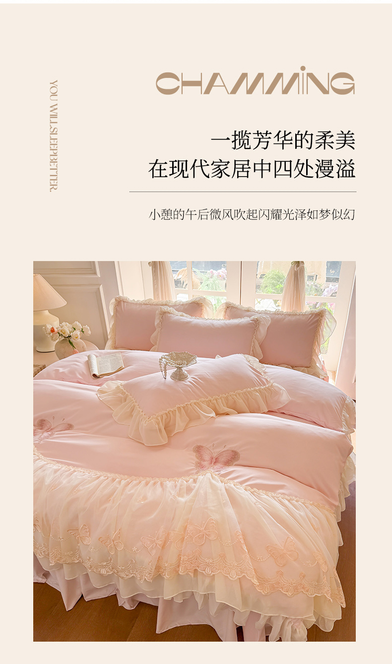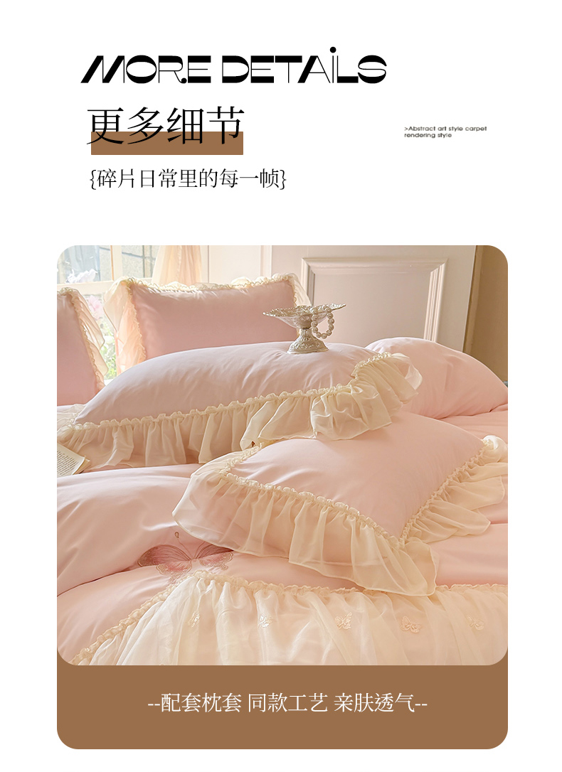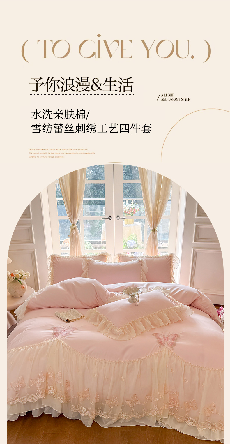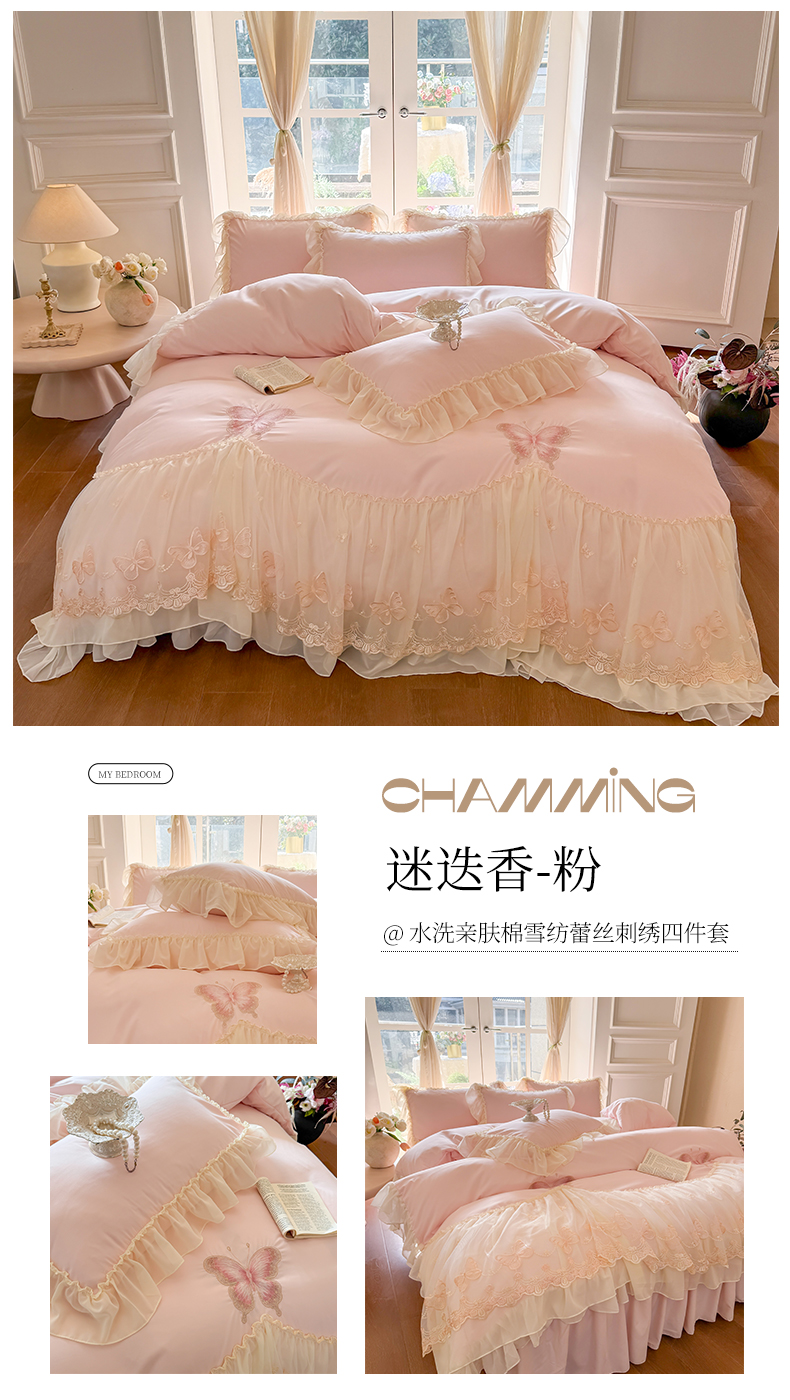 当前位置: 91家纺网 > 商品网购 > 床品套件 > 四件套 > 水洗棉四件套 > 富盛家纺 2026新款水洗亲肤棉雪纺蕾丝刺绣公主风韩版四件套-迷迭香 迷迭香—粉