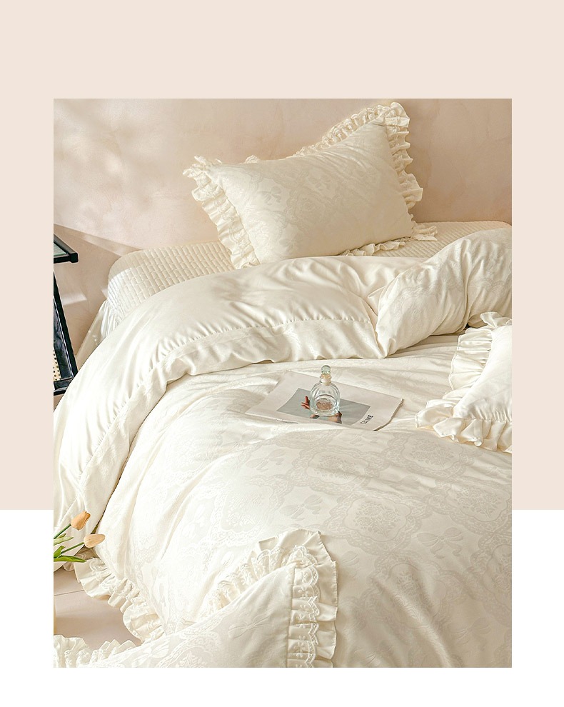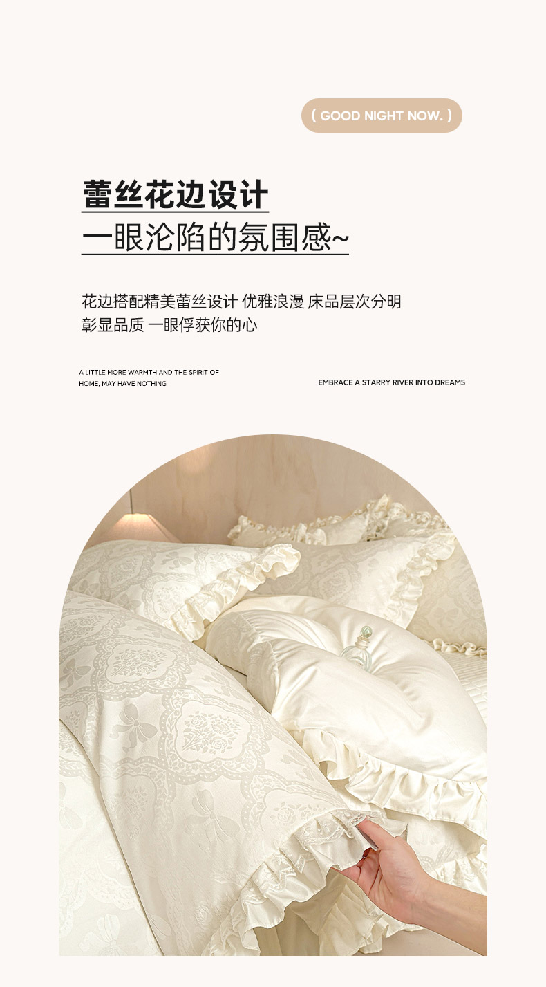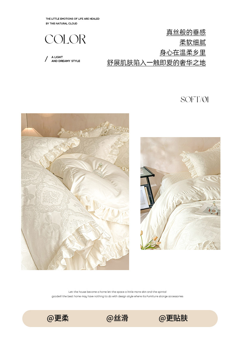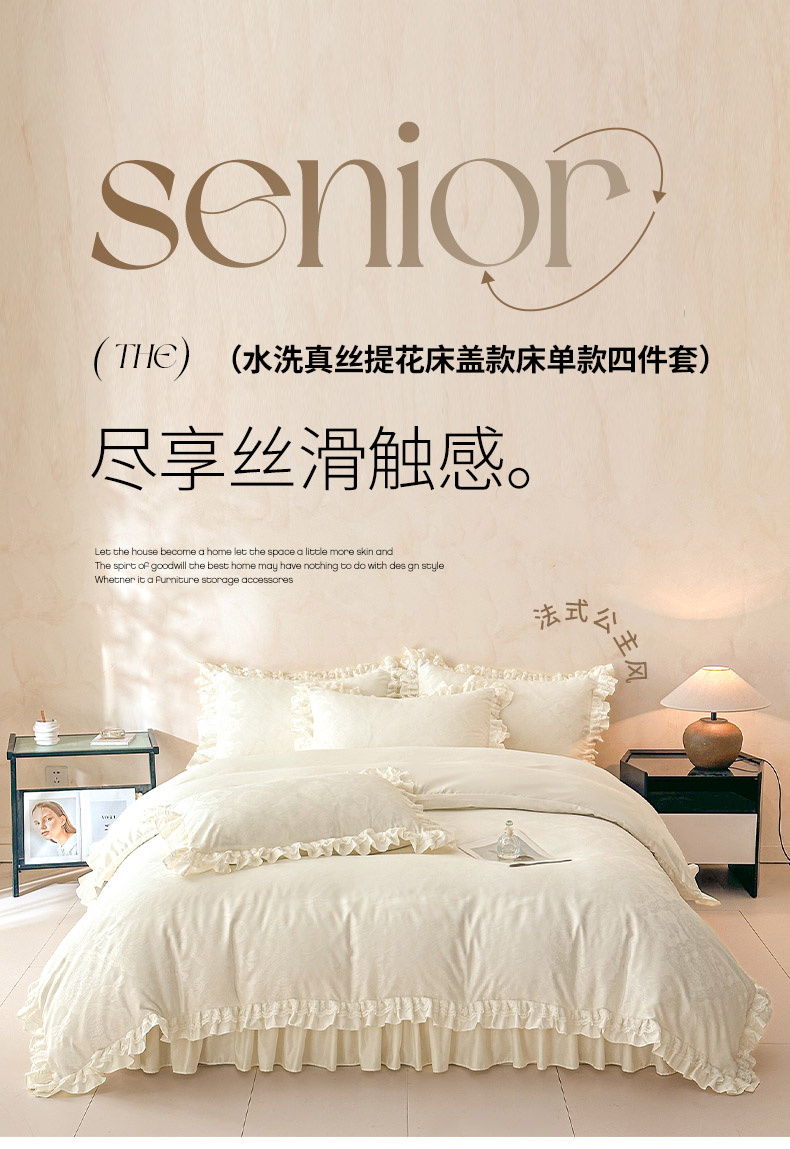 当前位置: 91家纺网 > 商品网购 > 床品套件 > 四件套 > 其它四件套 > 金阳光家纺 2026春夏新款A类花边蕾丝款水洗真丝天丝床盖款床单款提花四件套 秘密花园-蓝