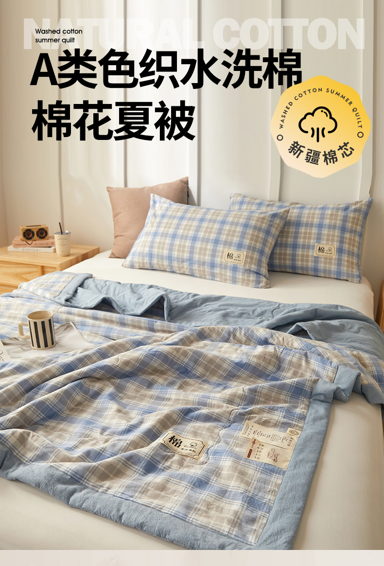招财星家纺 2026新款A类无印风100%新疆棉花夏被纯棉夏凉被空调被子薄被芯棉花被四件套 蓝黄格
