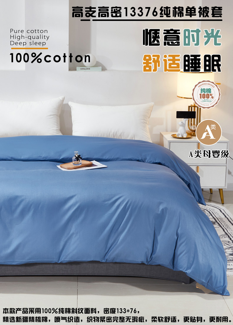 晶缦家纺 2026新款喷气A类全棉13376纯棉斜纹纯色单被套单品被套被套单件 沐朗-牛仔蓝