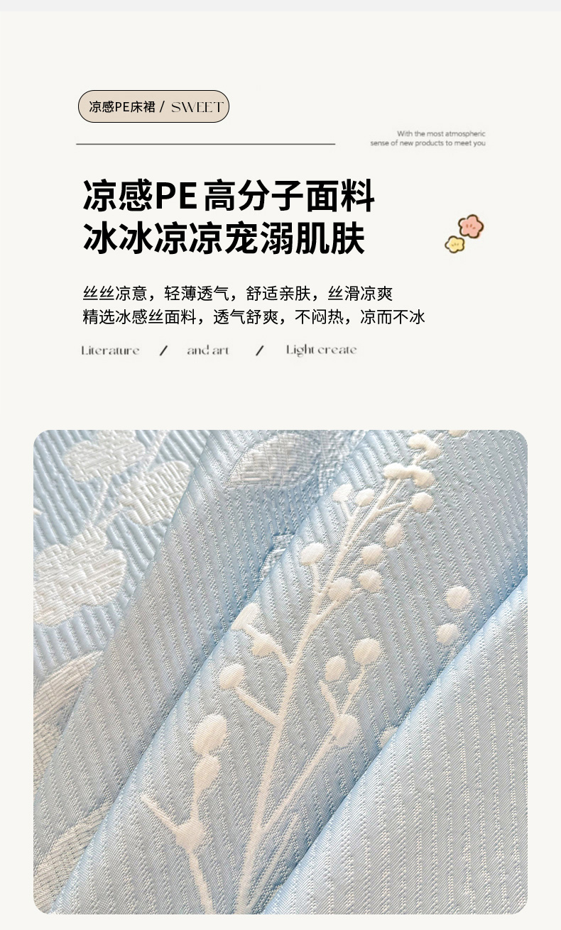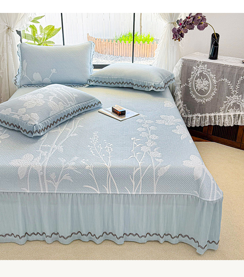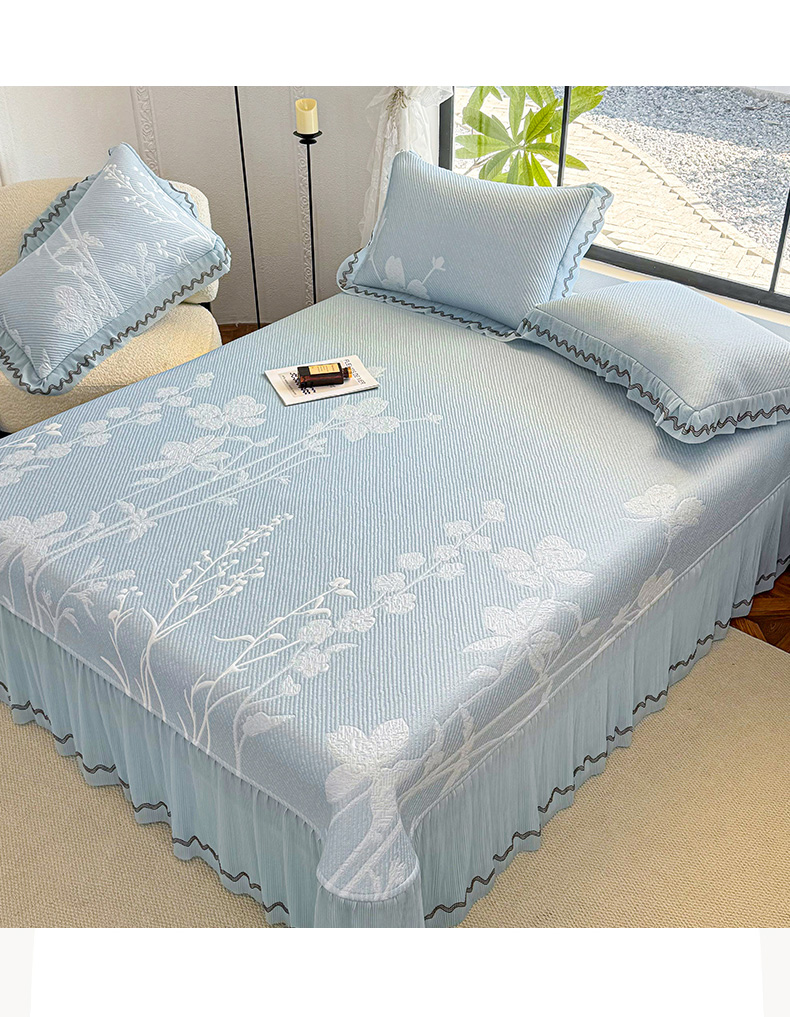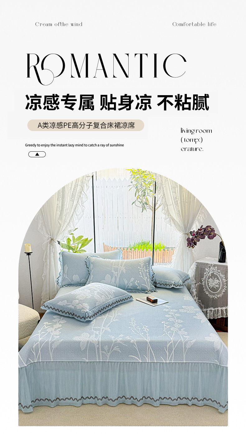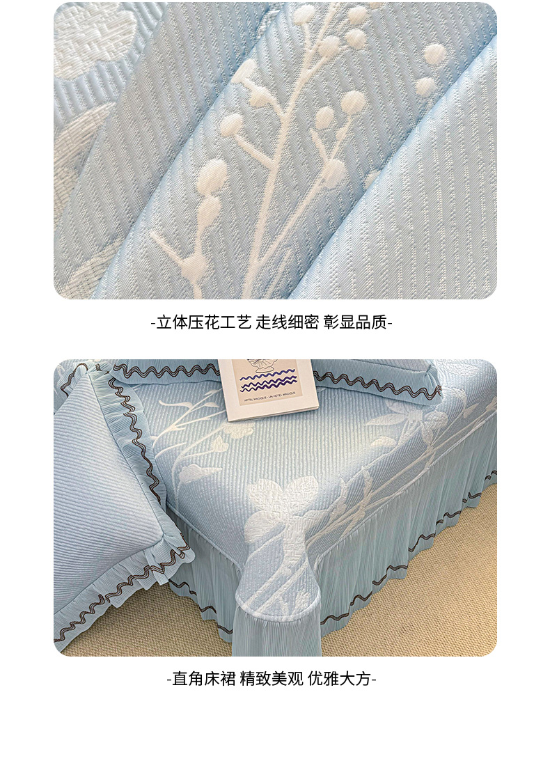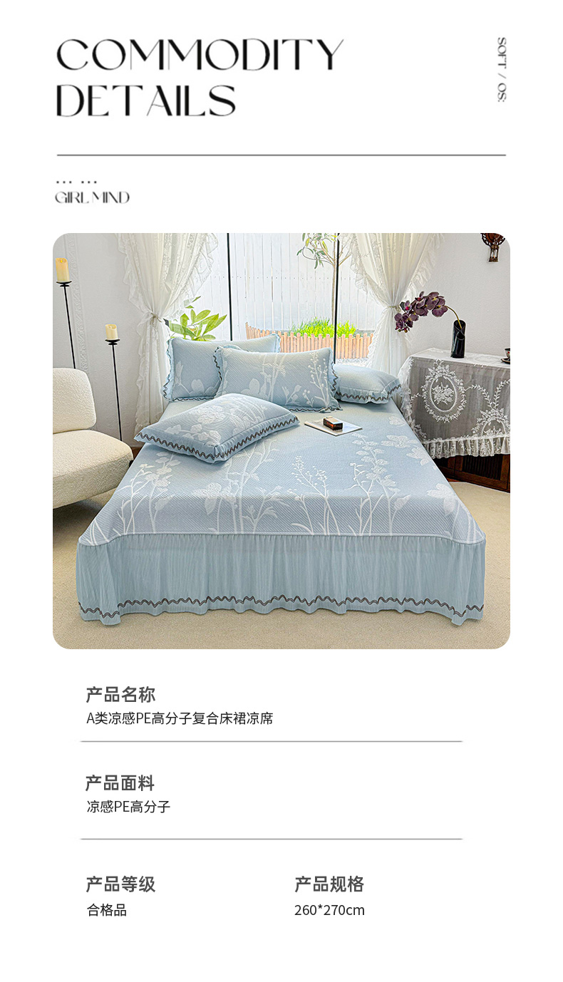 商品名称:(总)红夫人 2026新款凉豆豆PE高分子凉感凉席双色提花床裙款三件套--兰芝(风琴花边+三明治复合+精美手提包)