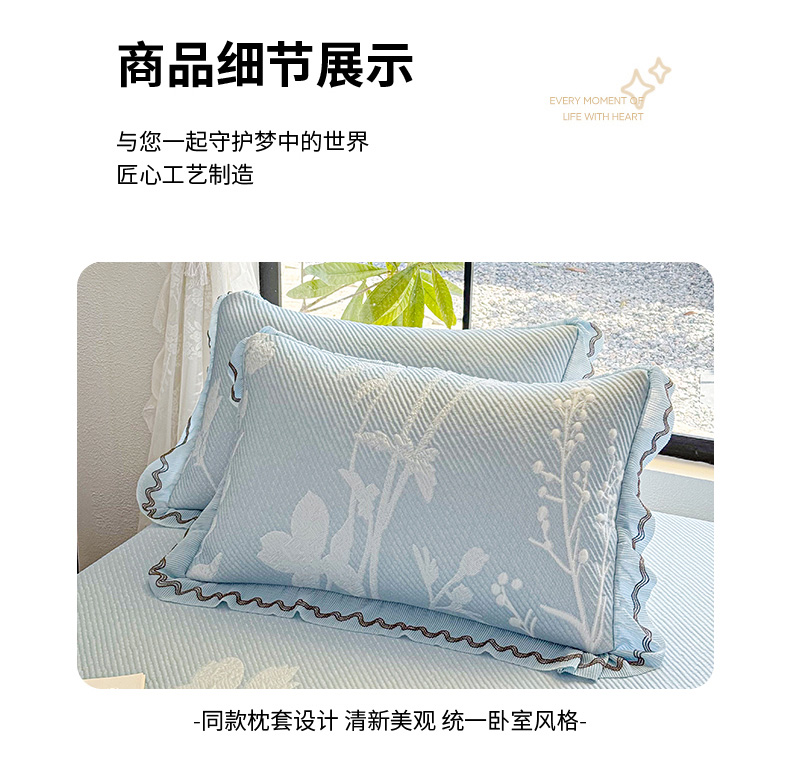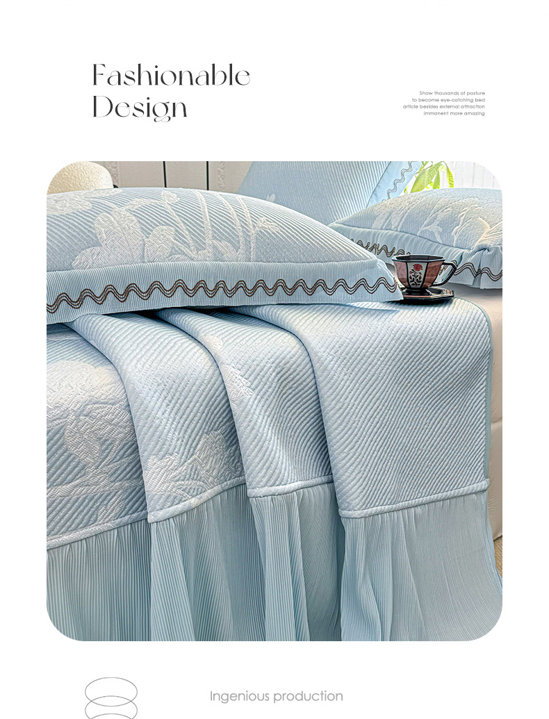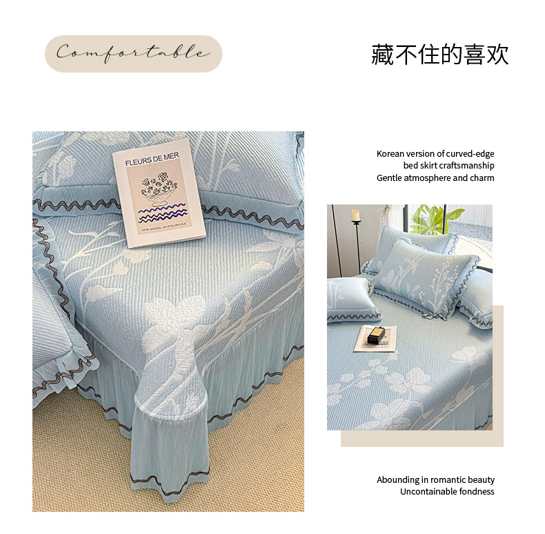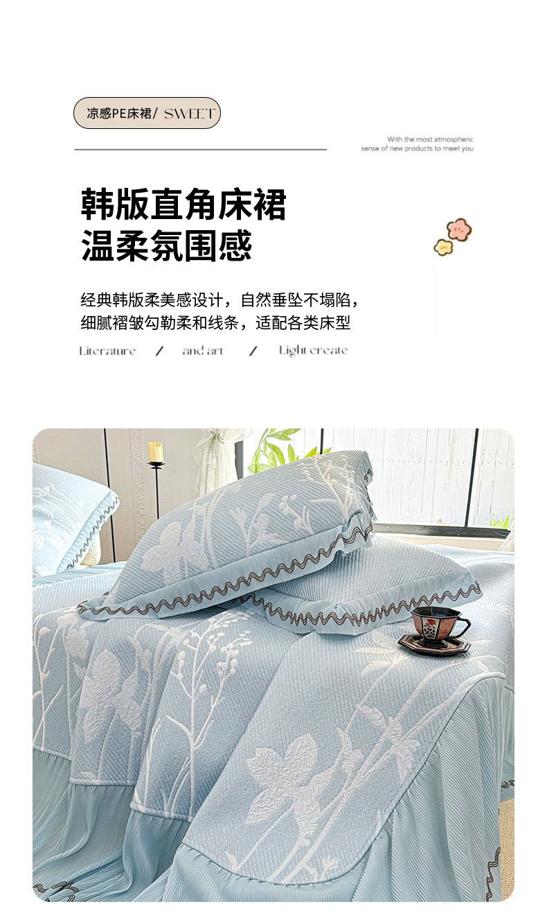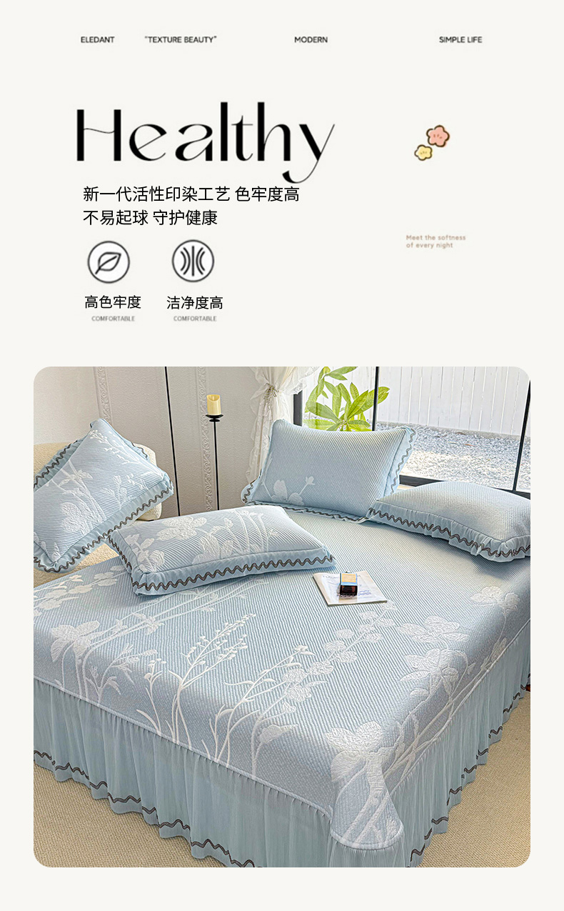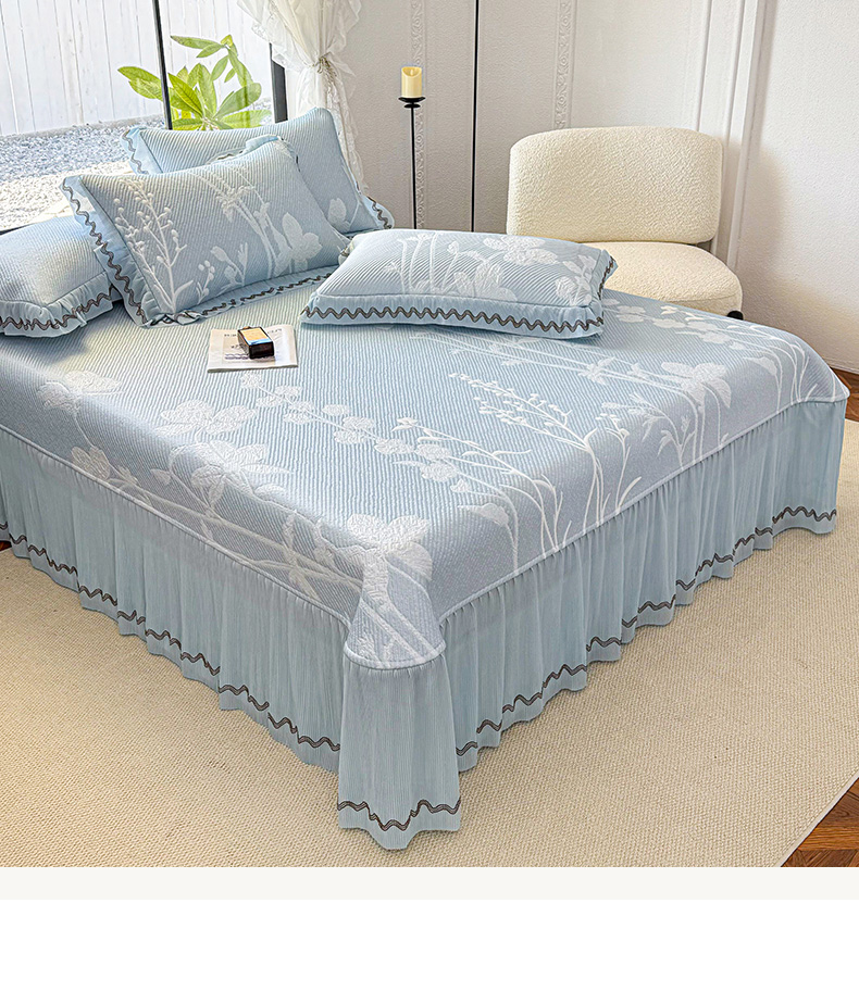 商品名称:(总)红夫人 2026新款凉豆豆PE高分子凉感凉席双色提花床裙款三件套--兰芝(风琴花边+三明治复合+精美手提包)