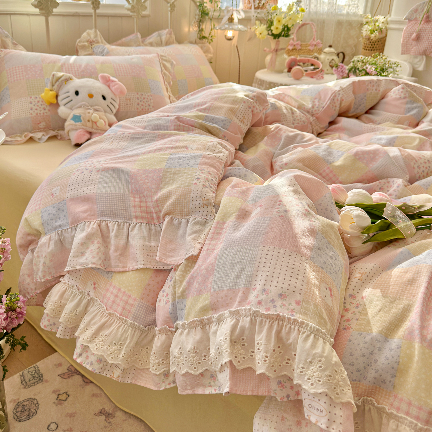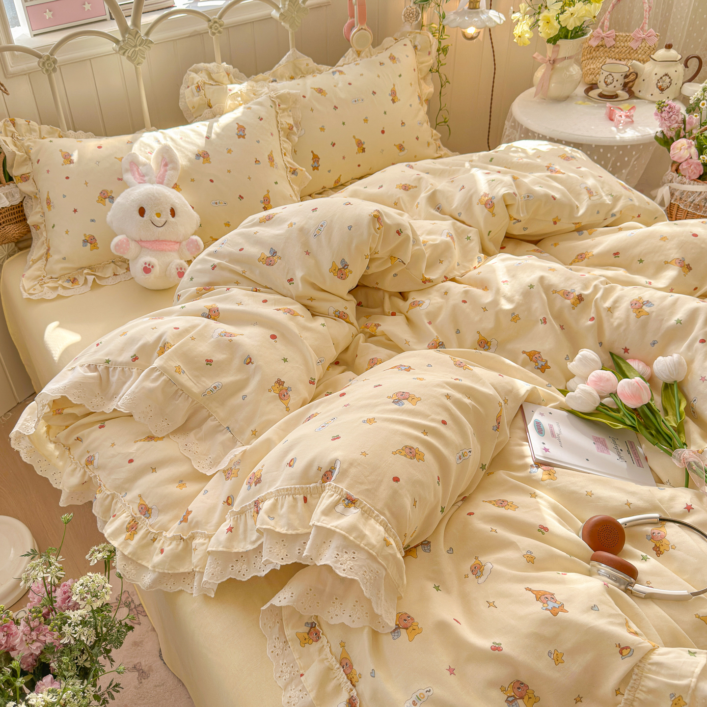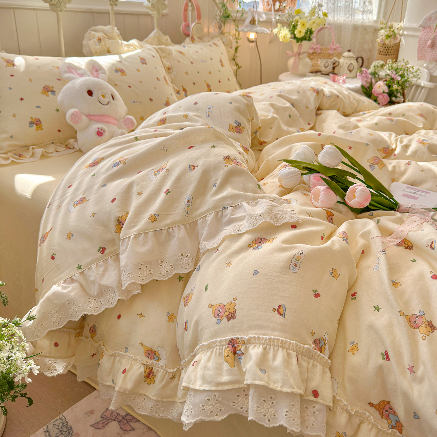 (总)锦彩家居 2026新款A类全棉双层纱韩式花边款小清新三件套四件套INS小红书博主风-晚茶与夏系列(提供买家秀),奶霜啵啵,桃桃气泡,甜心花猫,夏日铃兰,幸运星星