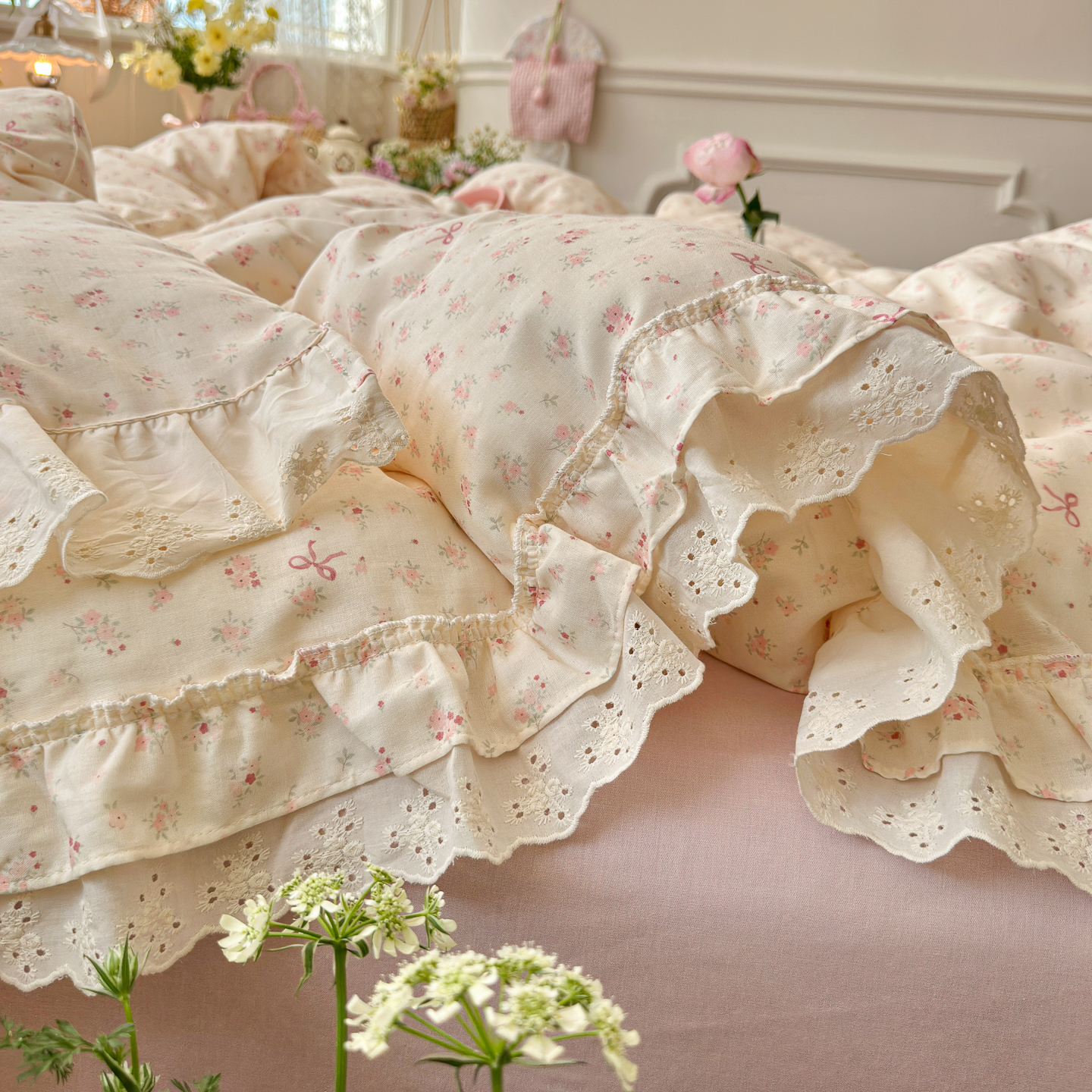 (总)锦彩家居 2026新款A类全棉纯棉法式花边款小碎花双层纱四件套-蔷薇公主(提供买家秀),春日寻野,花枝海棠,落花浮梦,微醺漫漫,心藏月光