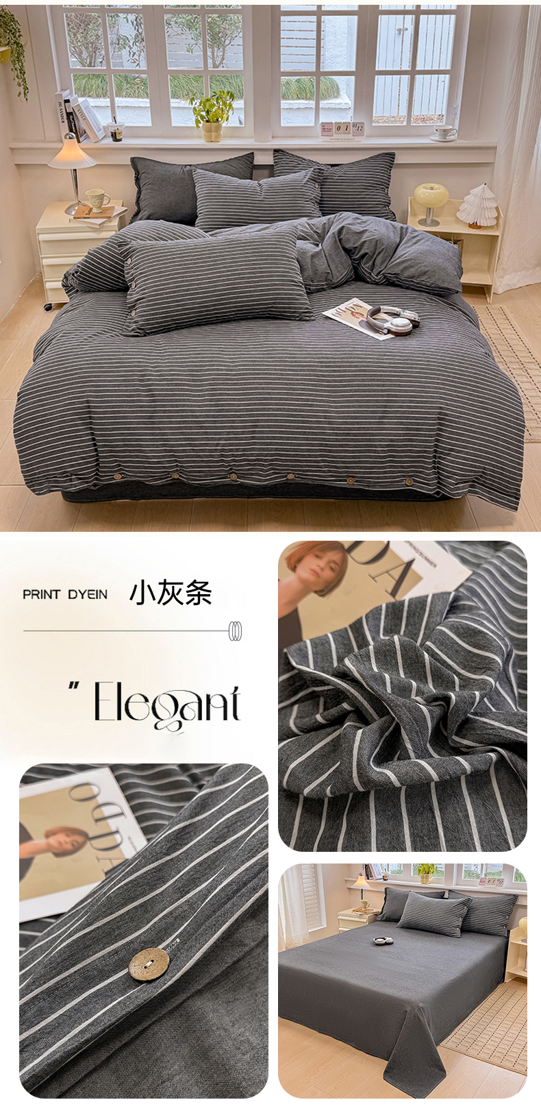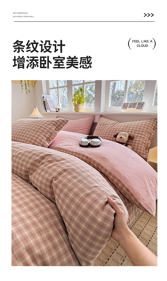 (总)梦依依 2025新款全棉色织水洗棉纽扣款四件套学生三件套全棉纯棉三件套,粉苏条,黑苏条,蓝苏条,绿苏条,米细条,黑细条,灰细条