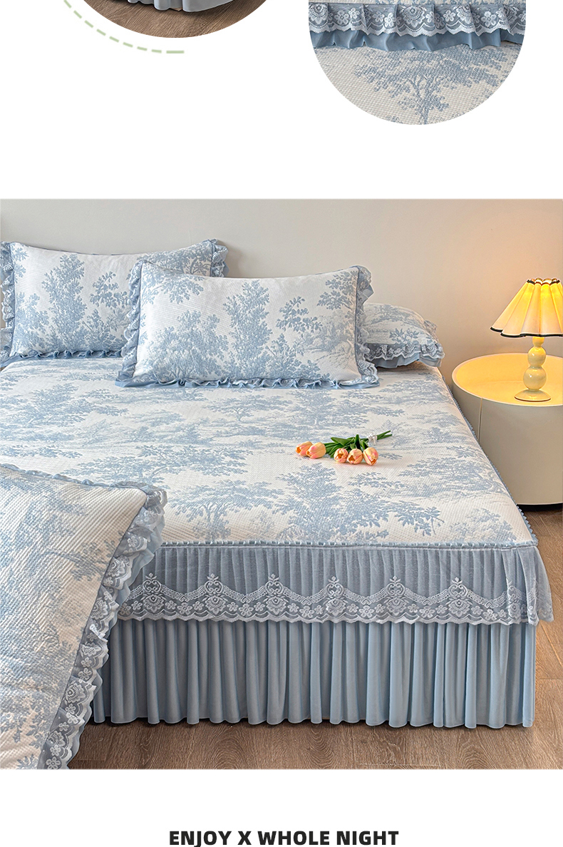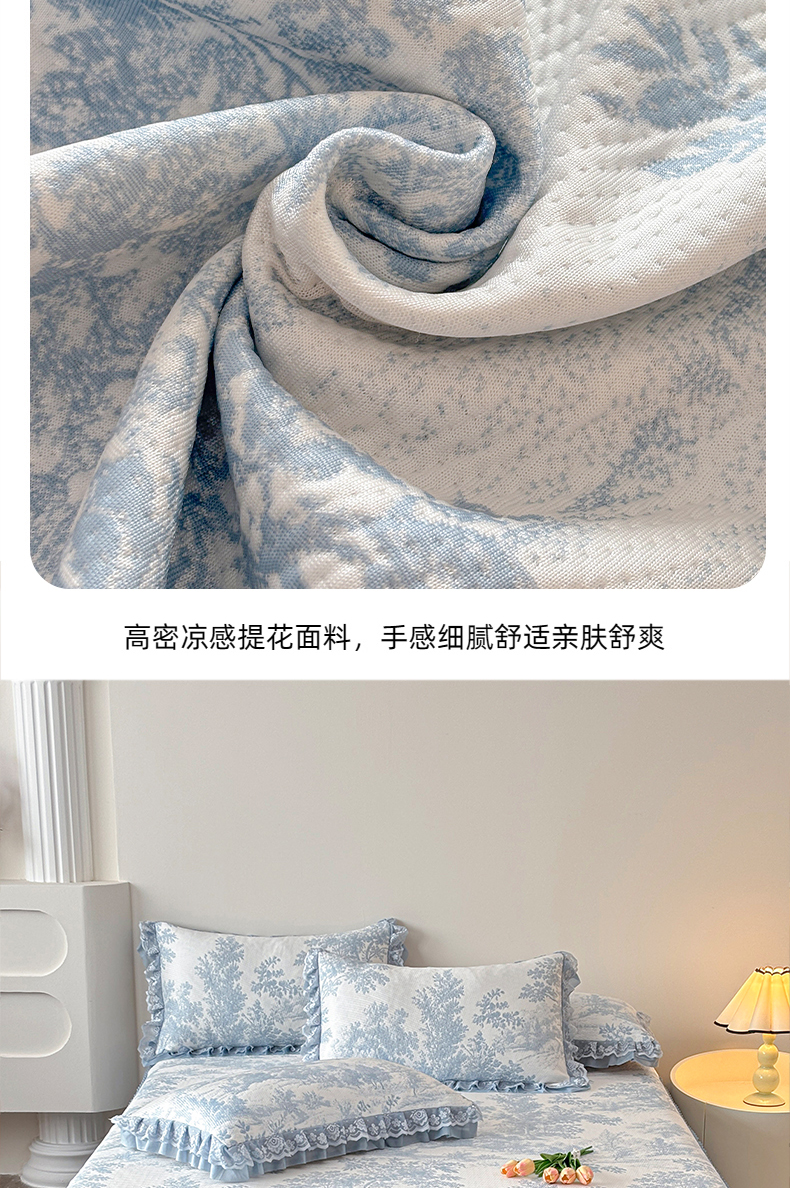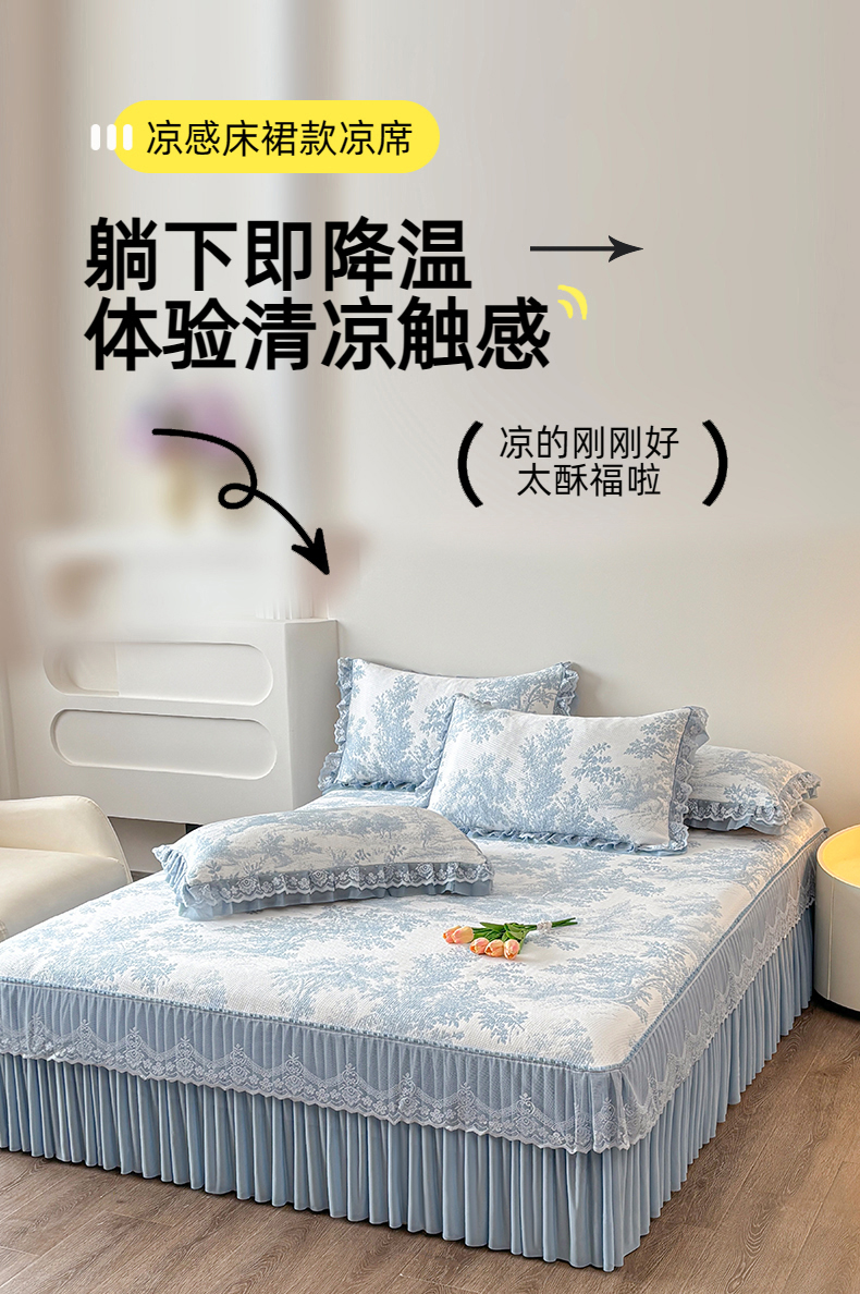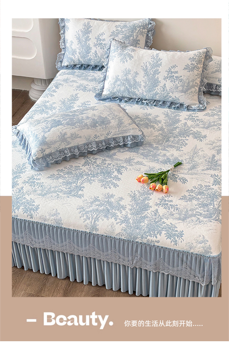 金艾草 2026新款PE双面提花床裙凉席三件套 清新-蓝色