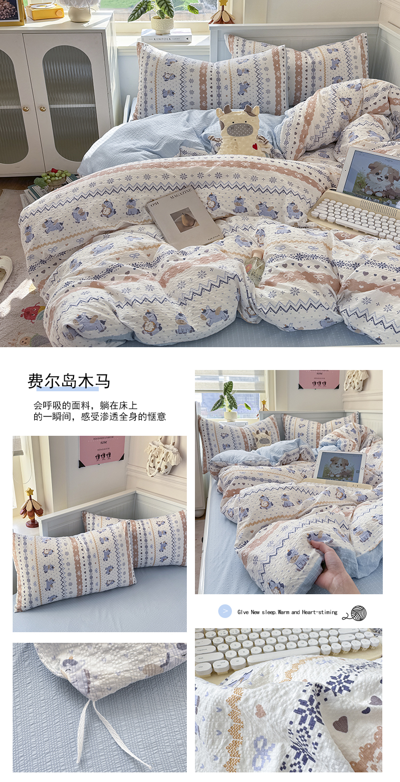 当前位置: 91家纺网 > 商品网购 > 床品套件 > 四件套 > 双层纱四件套 > 赛琳 2026新款春夏款泡芙纱双层纱加厚费尔岛系列四件套(有买家秀) 小鹿织棉