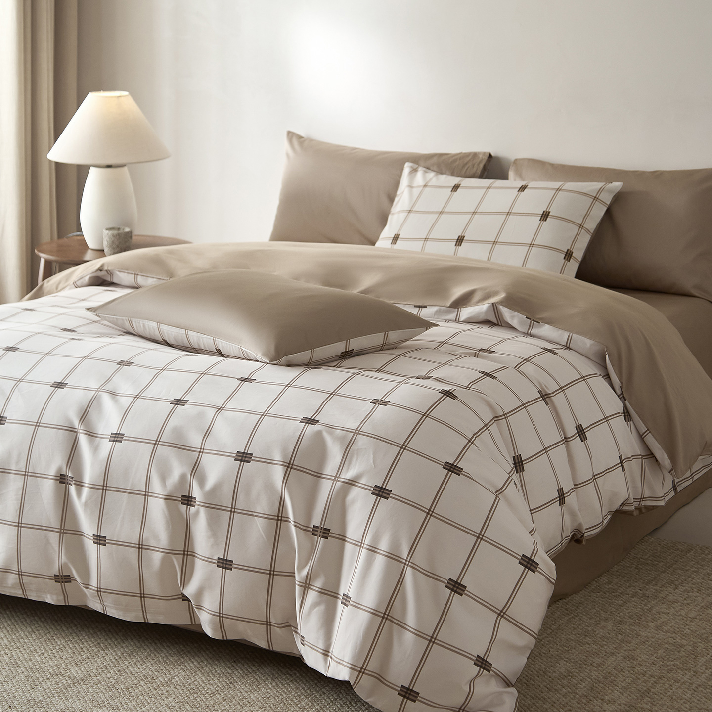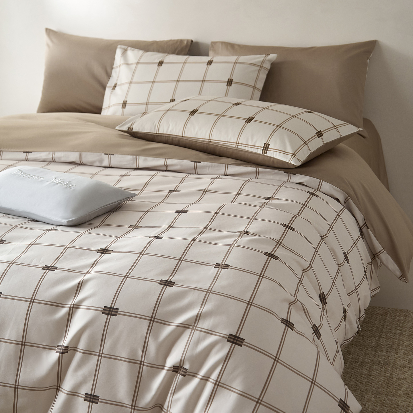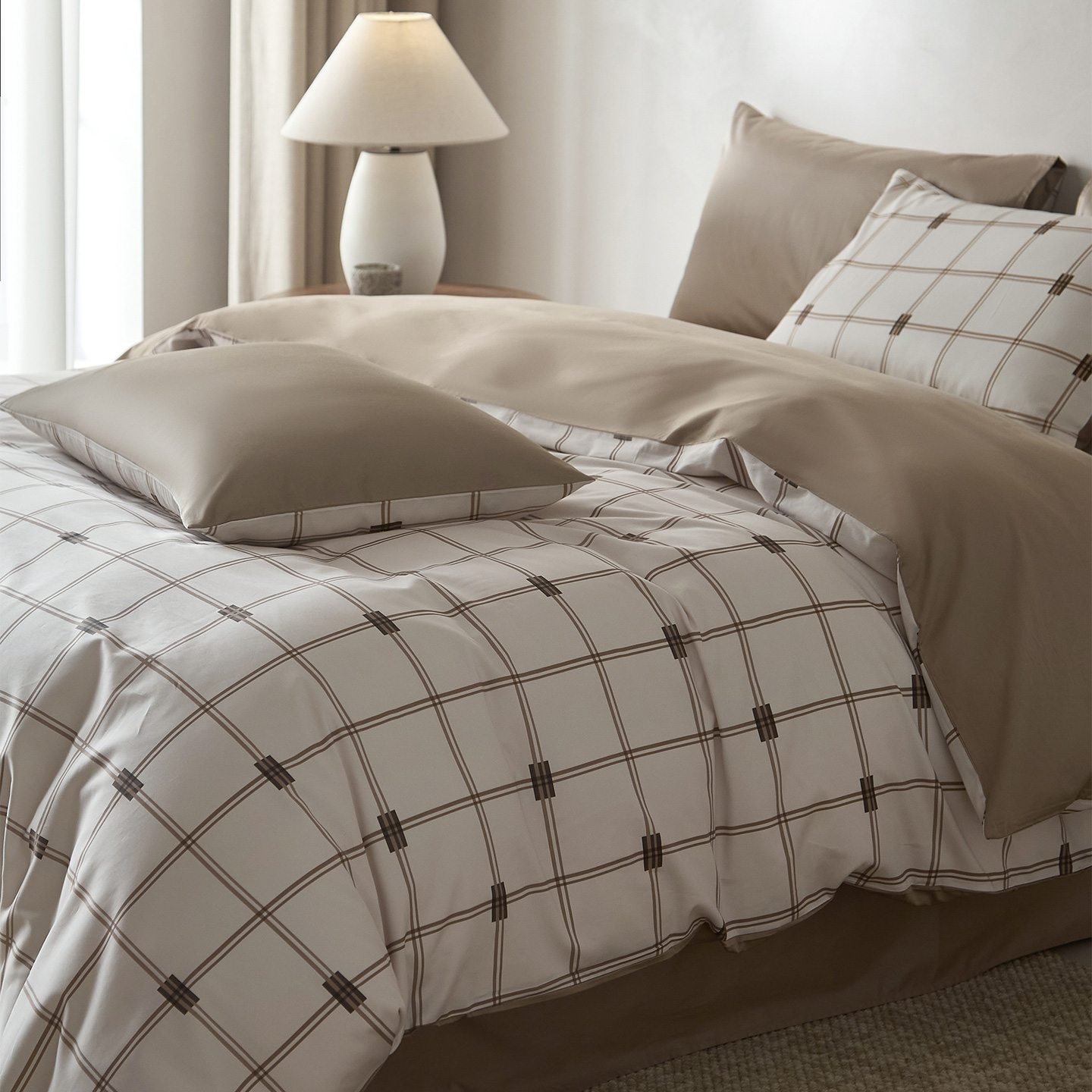 当前位置: 91家纺网 > 商品网购 > 床品套件 > 四件套 > 全棉普通四件套 > (总)ONE TWO ONE 121 2026新款专版数码印花100s长绒棉纯棉全棉床上用品四件套-罗曼格纹-金
