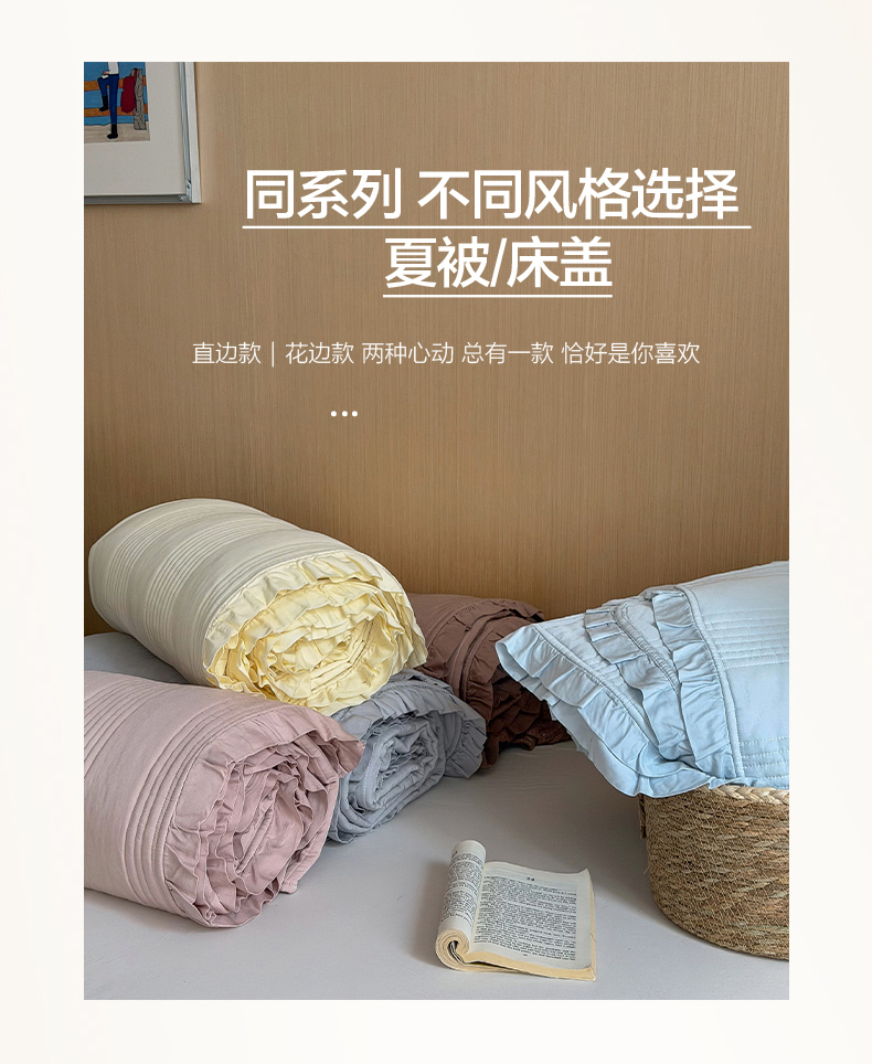 (总)漫调家纺 2026春夏新品双面棉麻法式荷叶边高温水洗夏被可配夏被四件套床单床盖四件套(夏被四件套咨询微信),粉雾花甸,蓝雾花影,奶杏枝蔓,青枝野果,组合