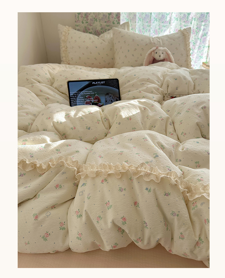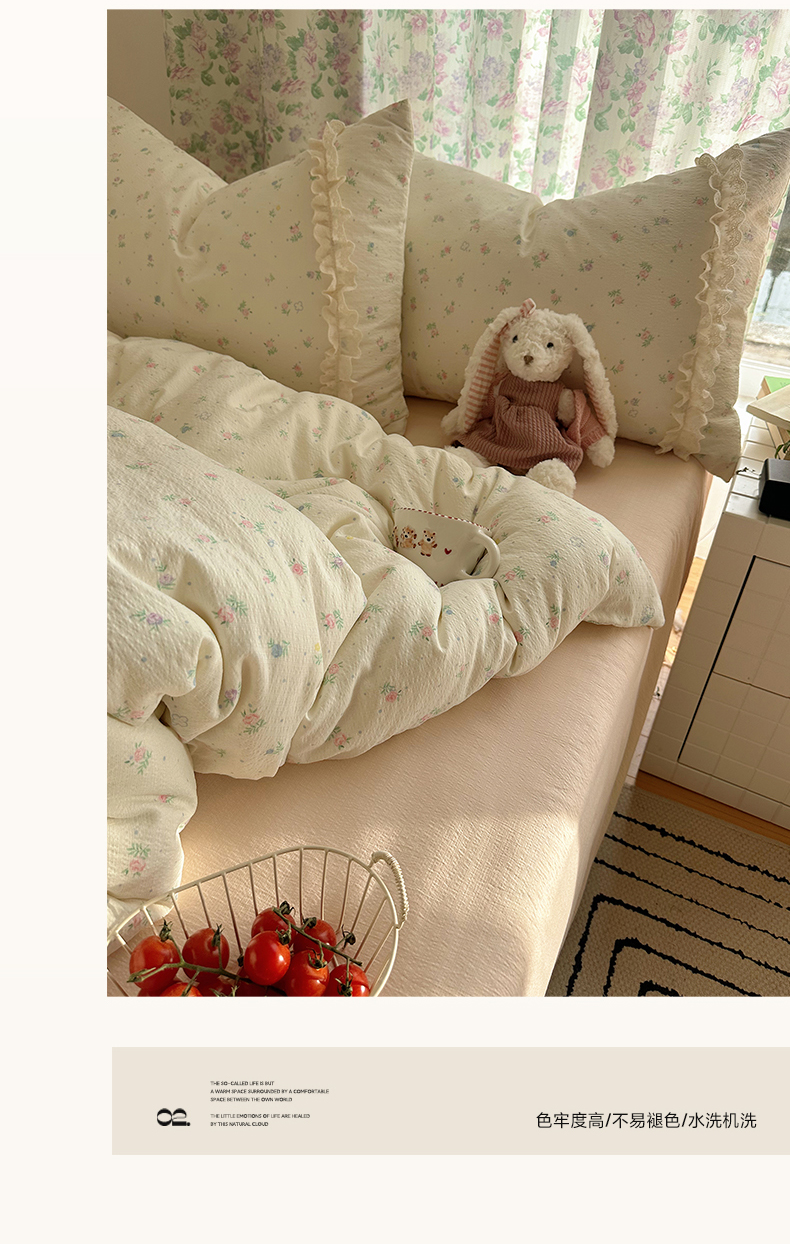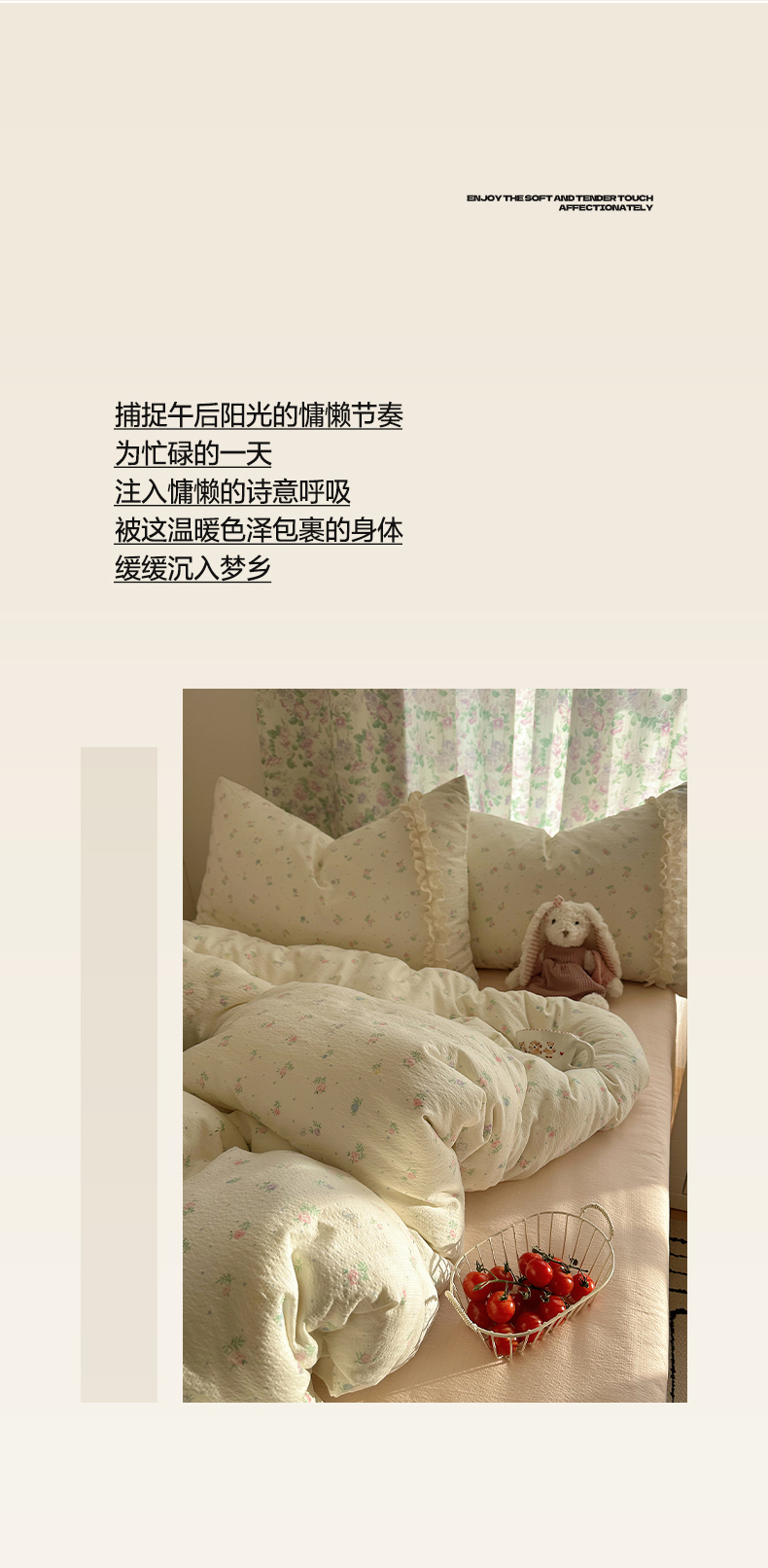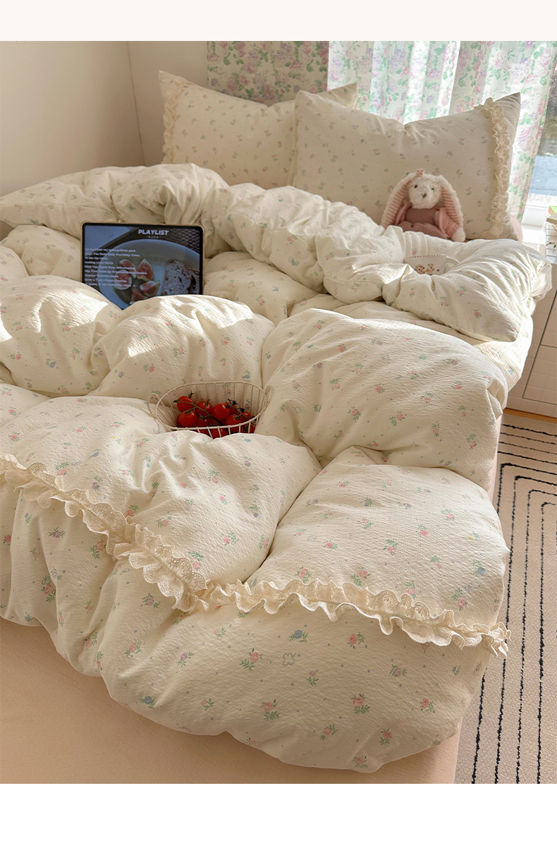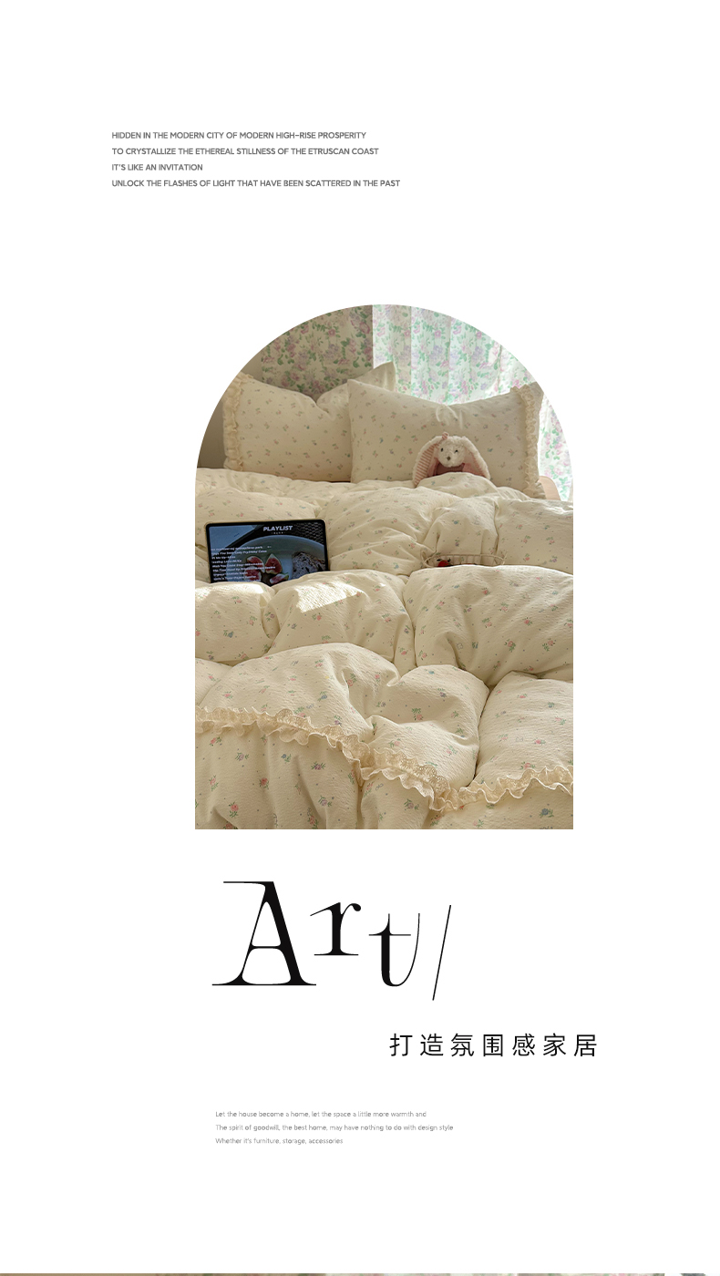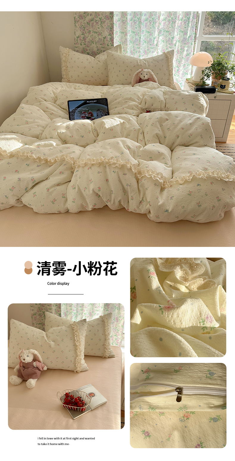 山茶家居-原创设计(原山茶家纺) 2026新款皱皱纱水洗棉花边四件套-清雾系列 清雾-小粉花